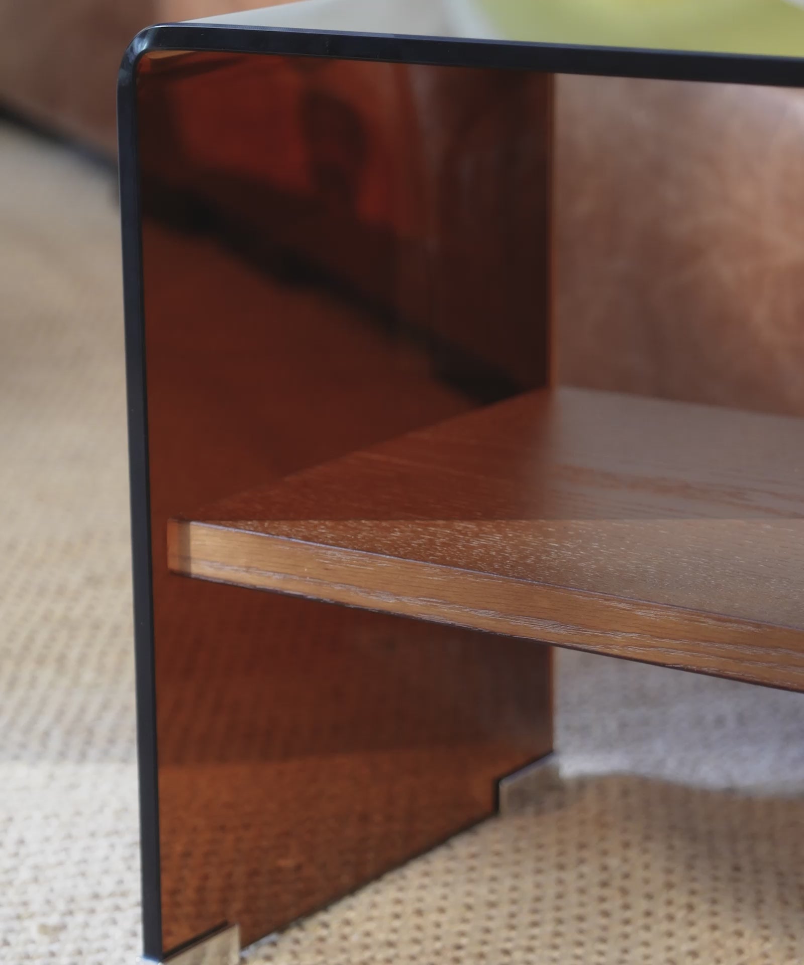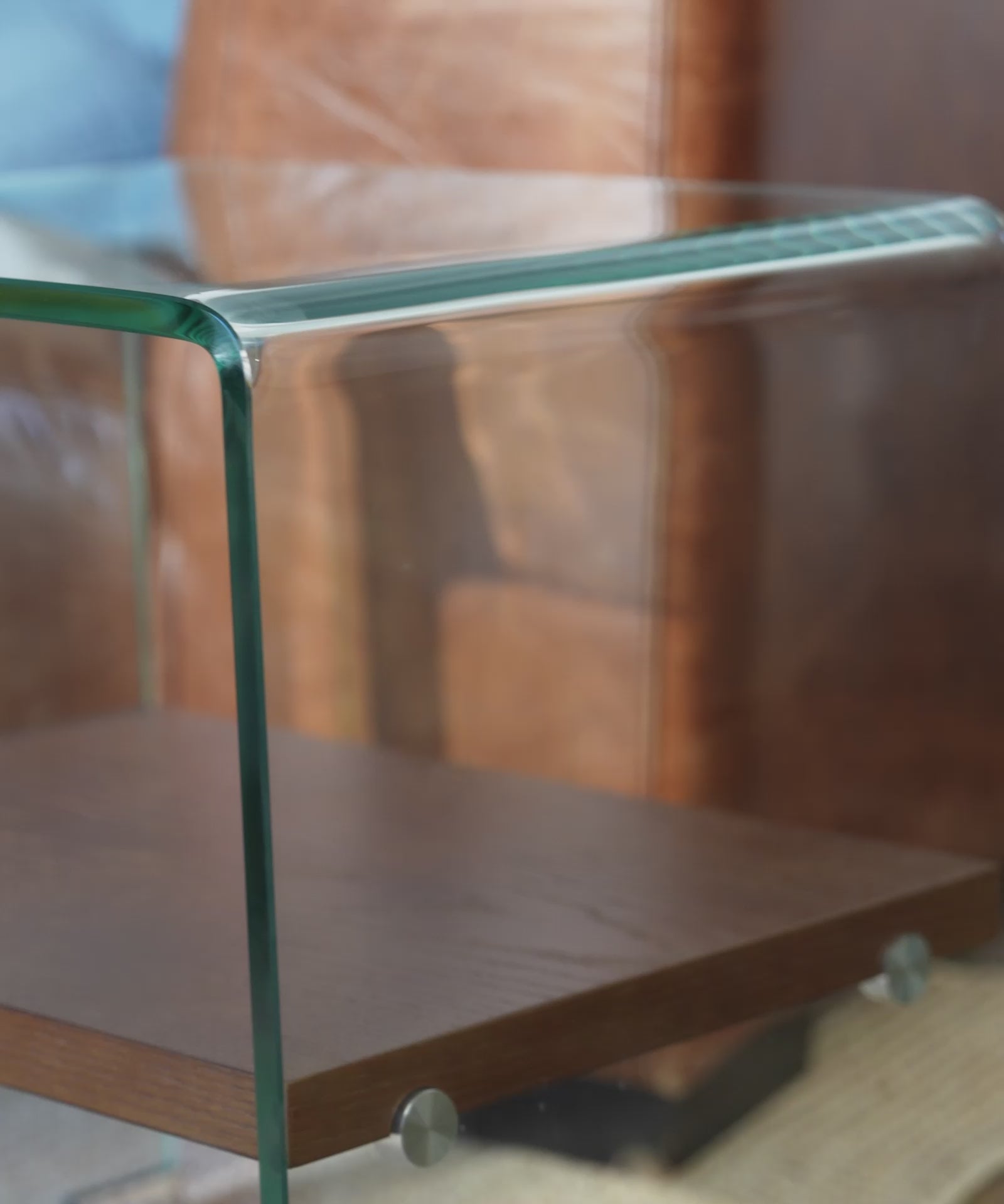 La mesa auxiliar Aris combina cristal templado y madera nogal en un diseño limpio y moderno. Su estructura transparente aporta ligereza visual, haciendo que se integre fácilmente en cualquier espacio.
