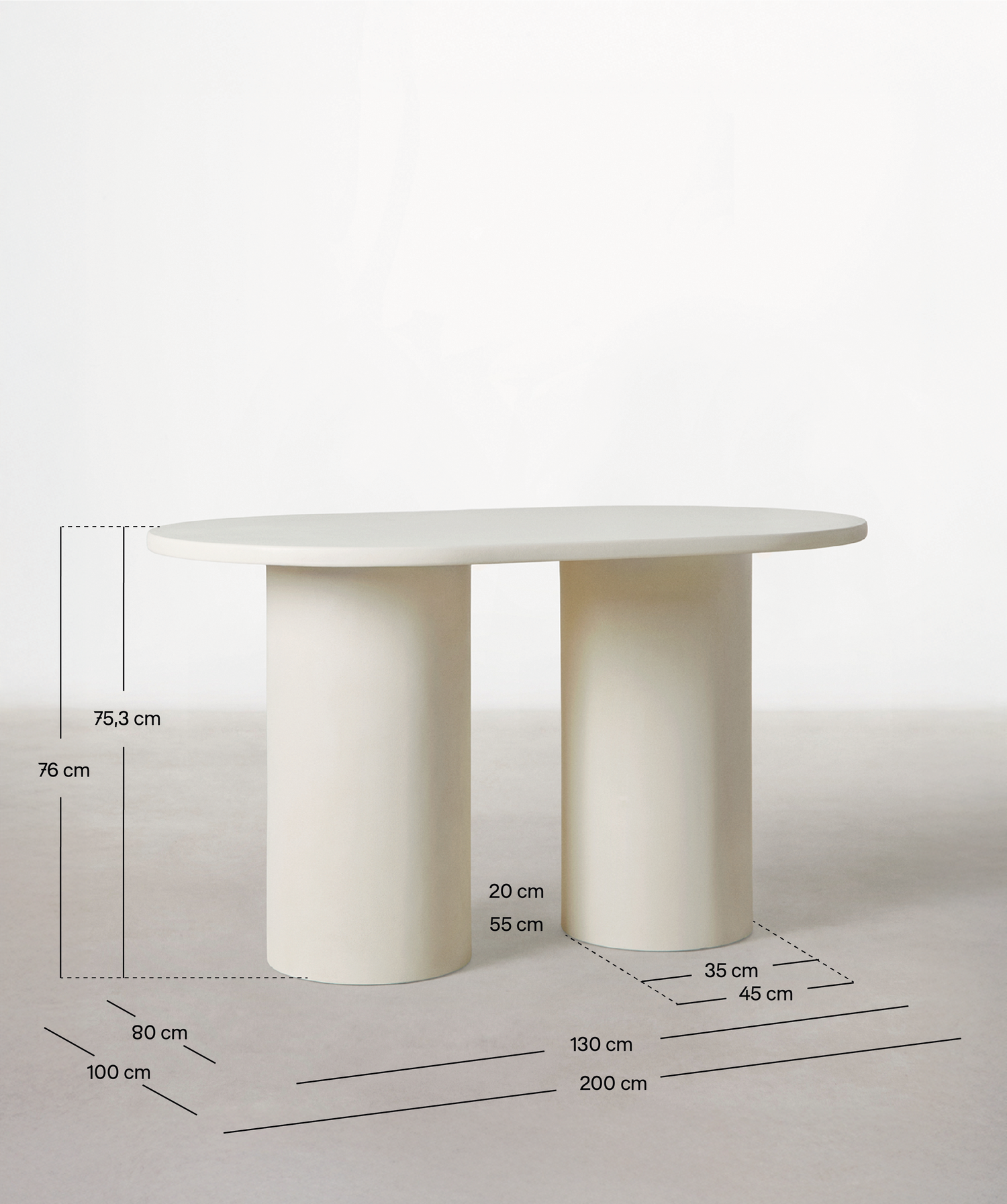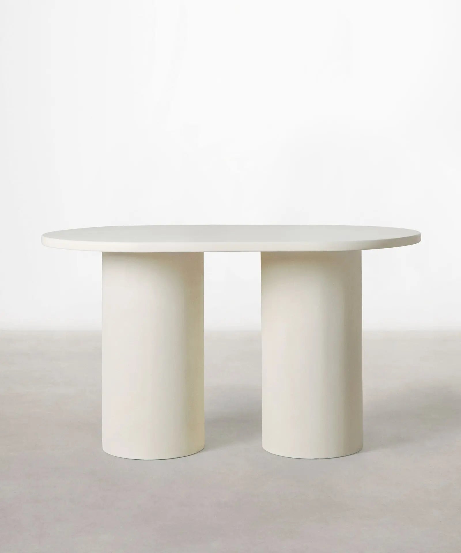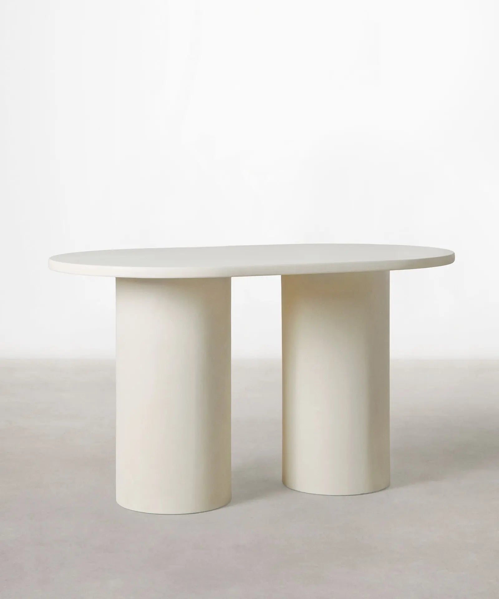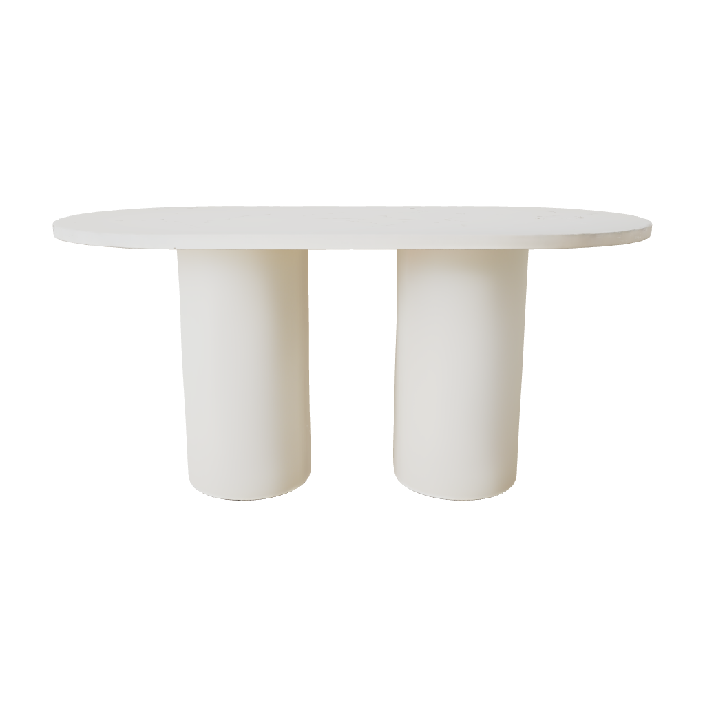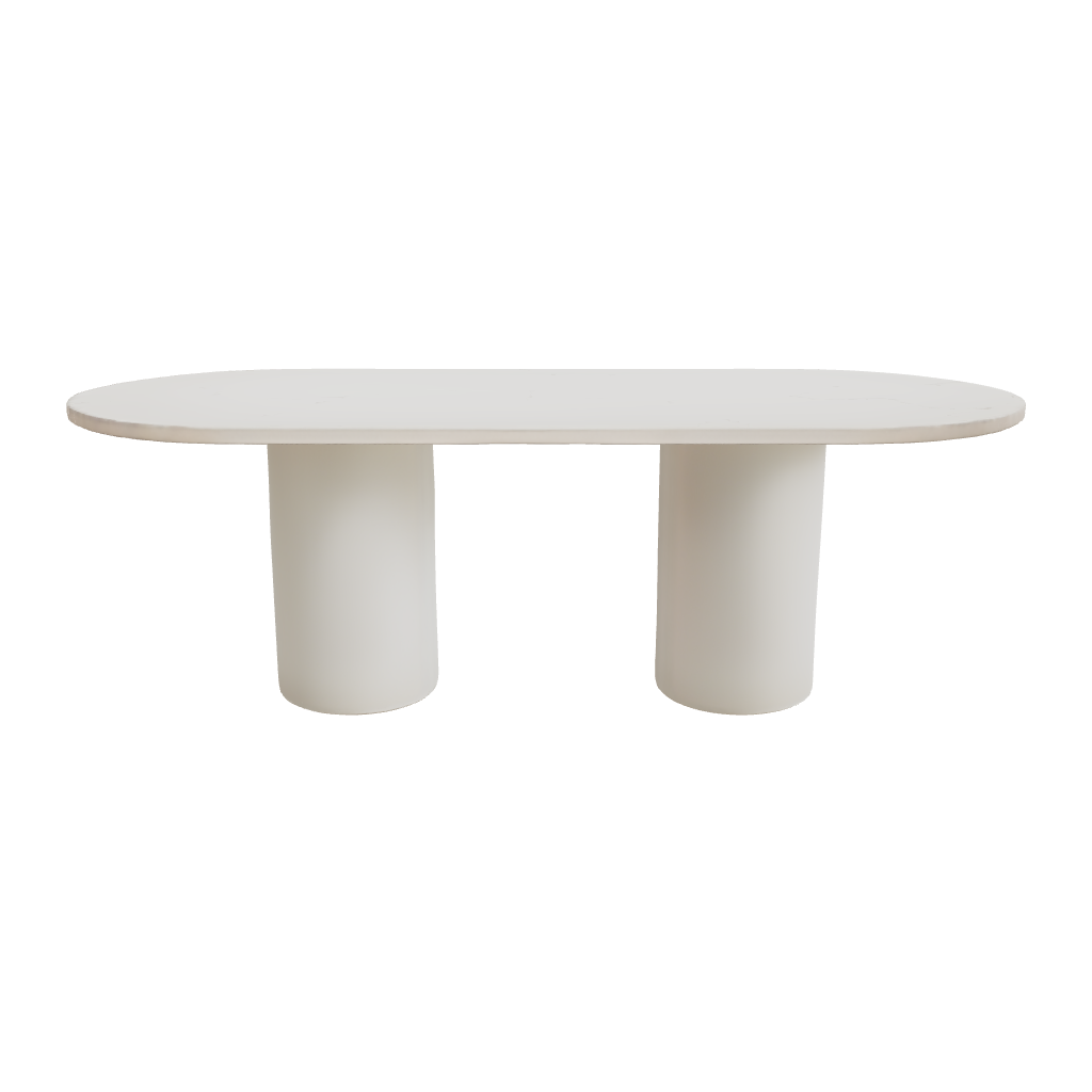 La mesa de comedor Ovalada Juno destaca por su diseño minimalista y elegante. Está formada por un sobre de forma ovalada apoyado sobre dos bases cilíndricas robustas. Su acabado en tono blanco roto aporta luminosidad y un estilo contemporáneo que combina fácilmente con cualquier tipo de decoración.