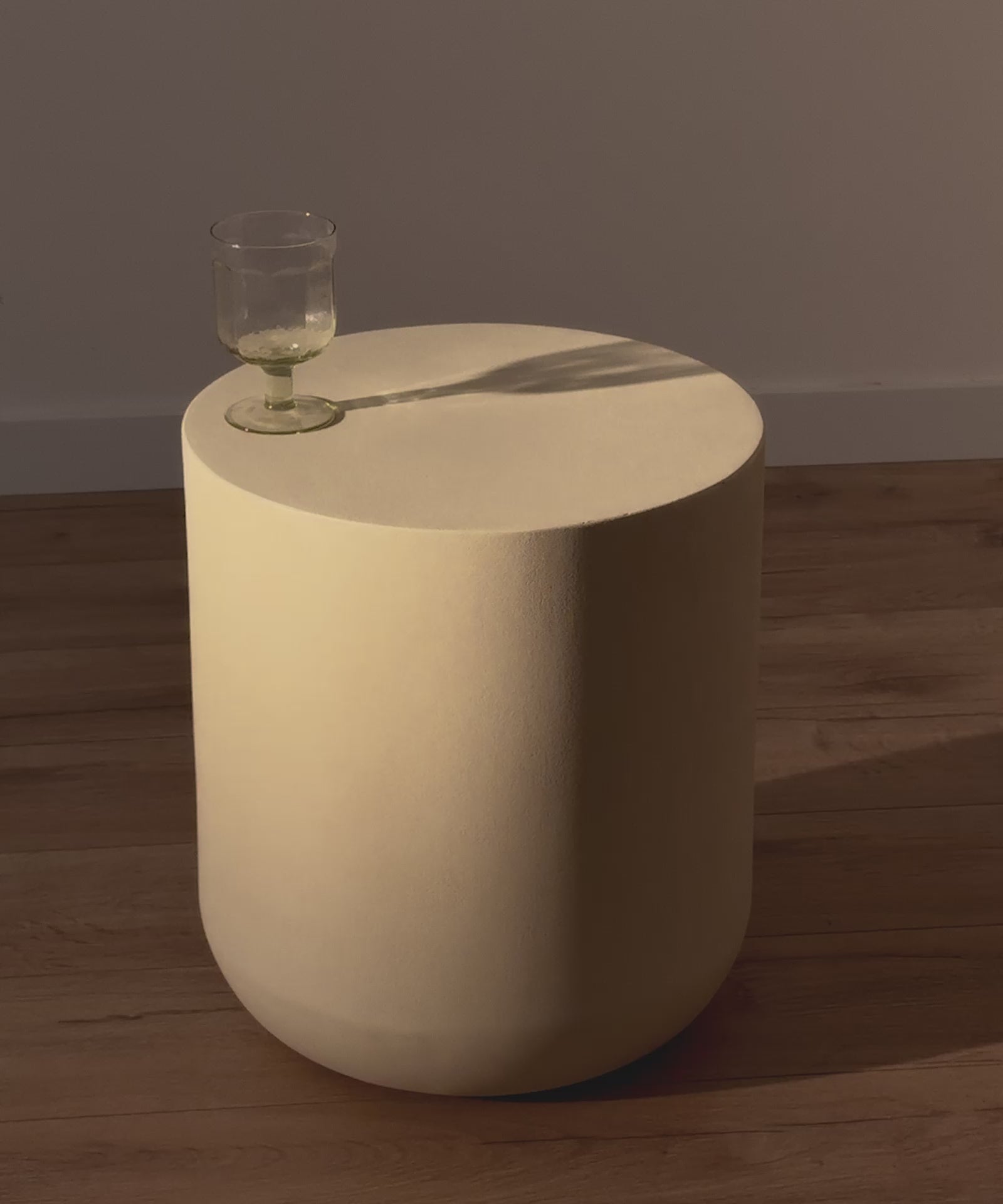 Está hecha de microcemento con un acabado en blanco roto, lo que le da un aspecto tranquilo y artesanal. Su superficie continua y textura suave refuerzan su estilo minimalista y atemporal. Además, sus materiales son resistentes, duraderos y fáciles de mantener.