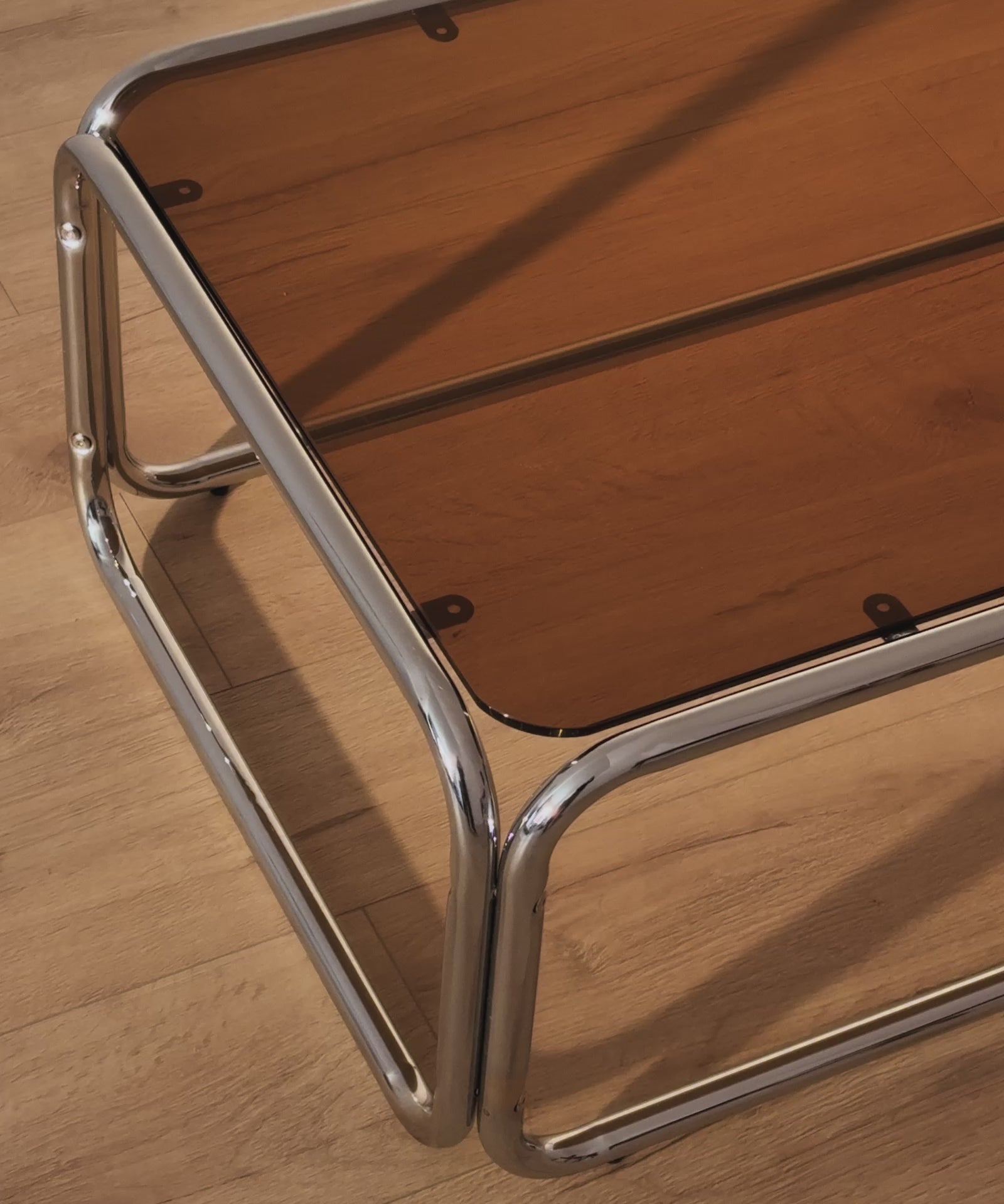 La mesa de centro Mai combina diseño moderno y funcionalidad, perfecta para interiores. Su superficie rectangular de cristal templado aporta elegancia y ligereza visual, mientras que su estructura de acero inoxidable cromado asegura estabilidad y estilo contemporáneo.