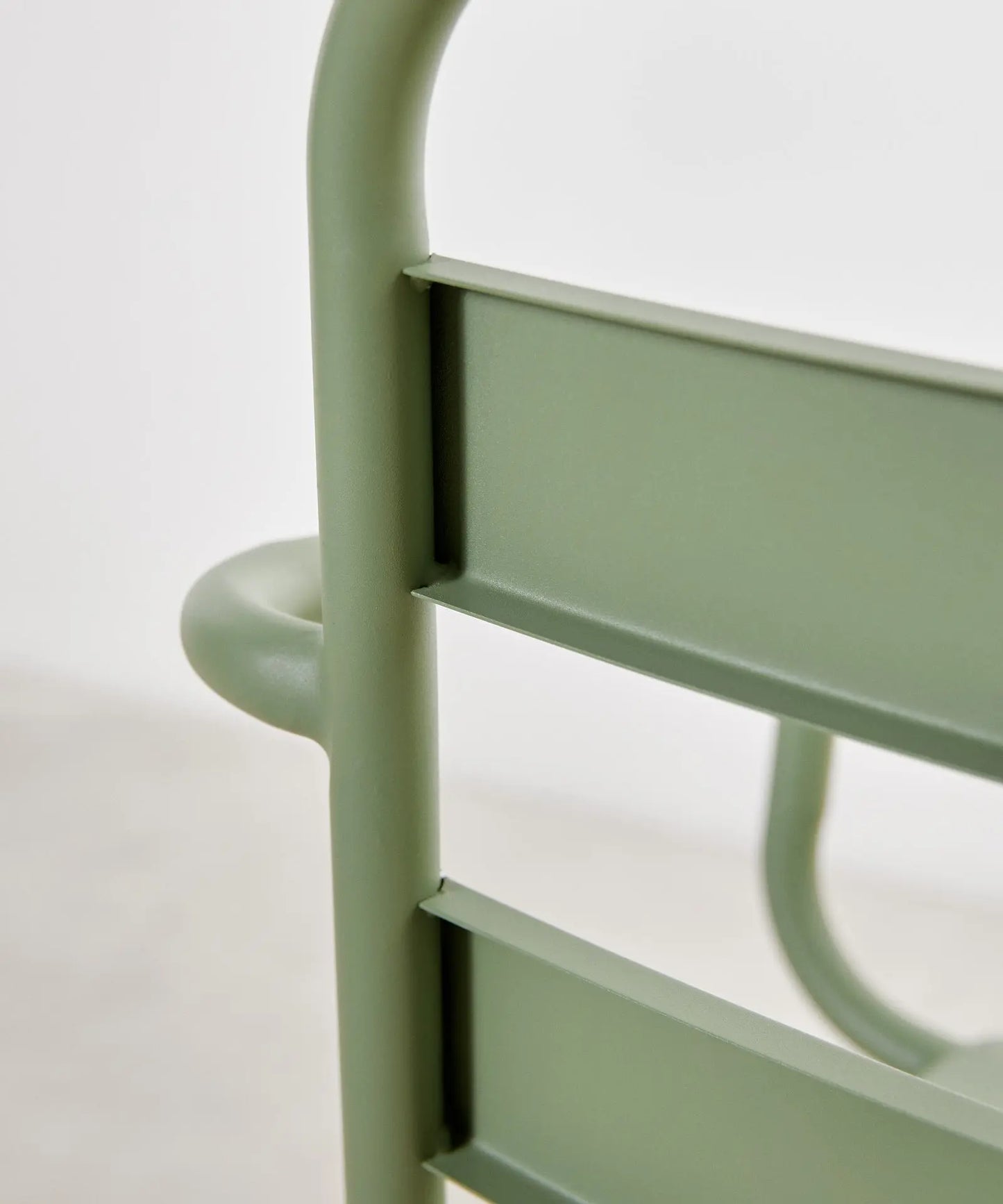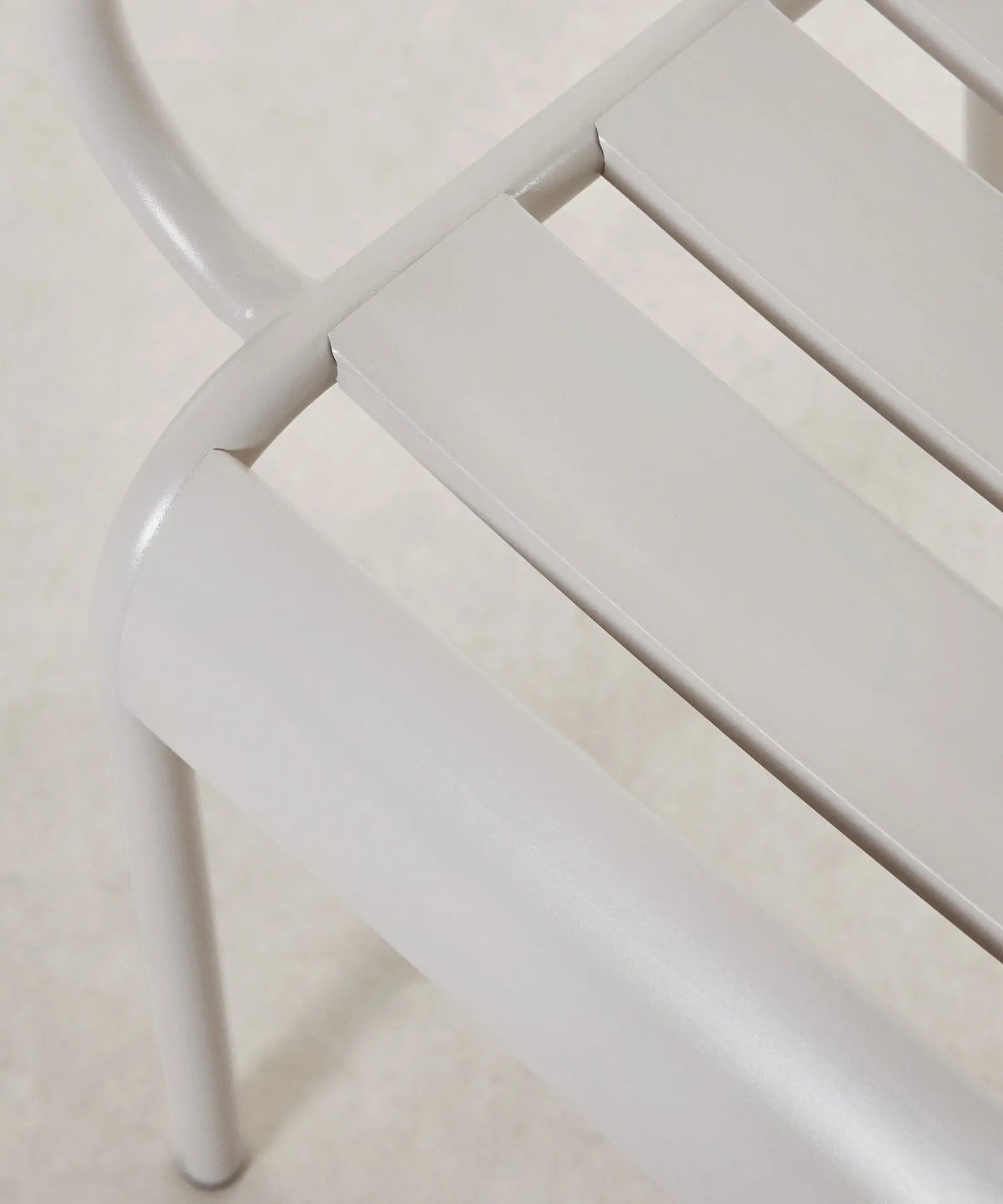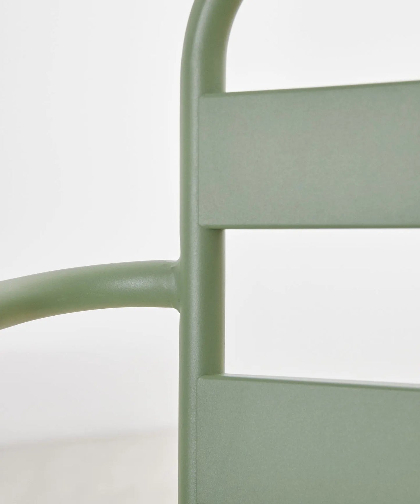 Está formada por una estructura sólida con respaldo de lamas anchas y reposabrazos envolventes. Su diseño soporta el uso diario sin sacrificar la durabilidad, haciendo de ella una opción ideal tanto para jardines como para terrazas y cafeterías.