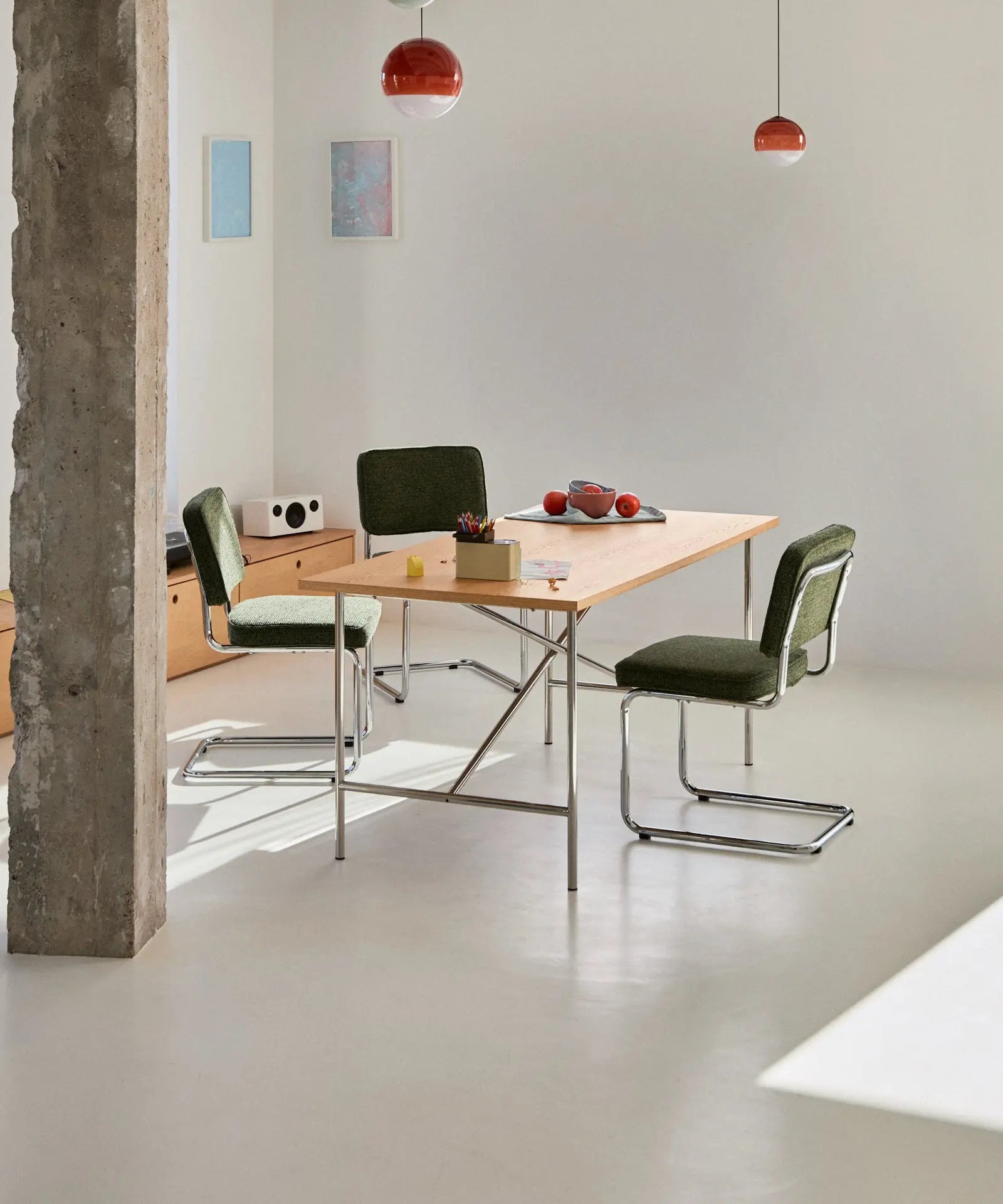 Der Anela Stuhl interpretiert klassisches Design in modernem Stil neu. Sein verchromtes Rohrgestell sorgt für Leichtigkeit und einen industriellen Touch, während die weiche grüne Stoffpolsterung ihm eine warme und einladende Ausstrahlung verleiht.