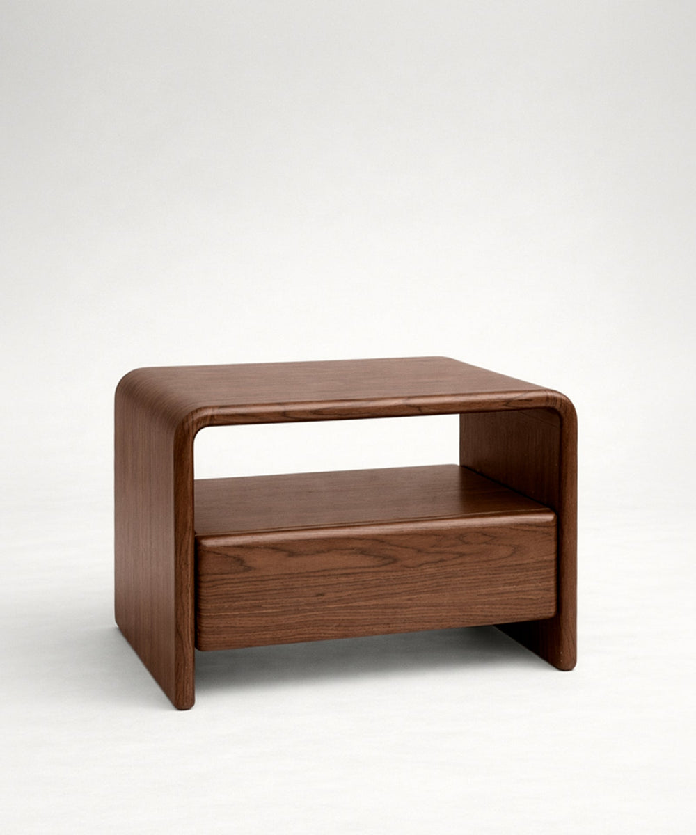 Sein Design umfasst eine geräumige Schublade für diskrete Aufbewahrung sowie ein offenes Ablagefach, perfekt für Bücher, Geräte oder kleine Alltagsgegenstände. Diese Kombination macht ihn zu einem praktischen und formschönen Beistelltisch aus Holz für den täglichen Gebrauch.