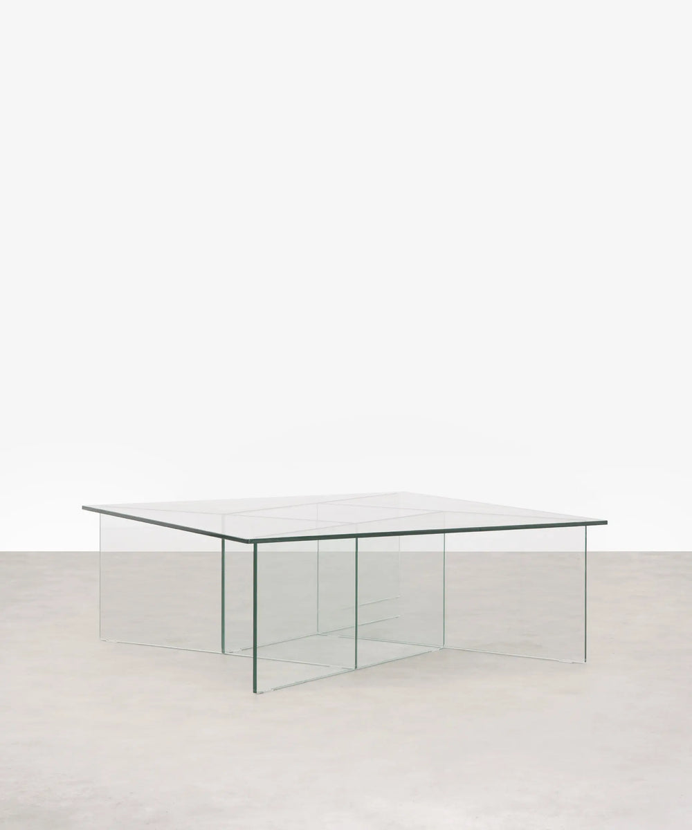 Er zeichnet sich durch seine quadratische Tischplatte aus gehärtetem Glas aus. Die Basis des Tisches besteht aus Glasstützen, die kreuzförmig angeordnet sind, um Stabilität zu gewährleisten und ein gestalterisches Highlight zu setzen.