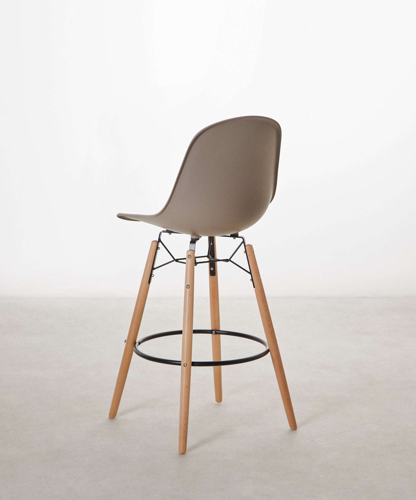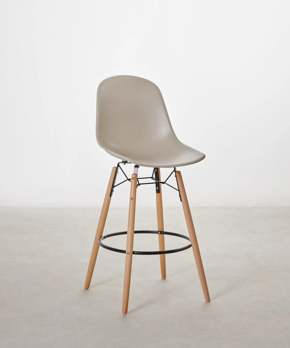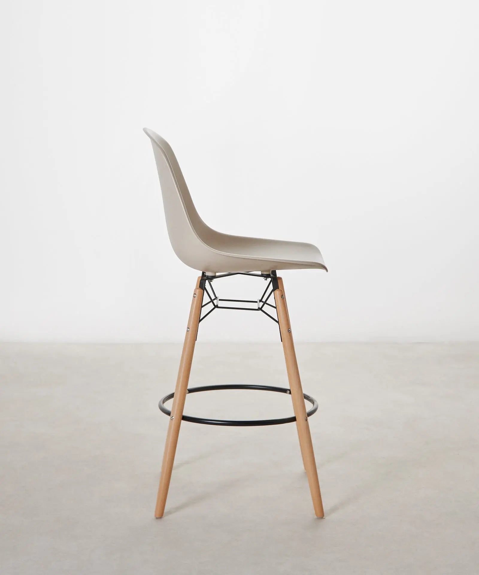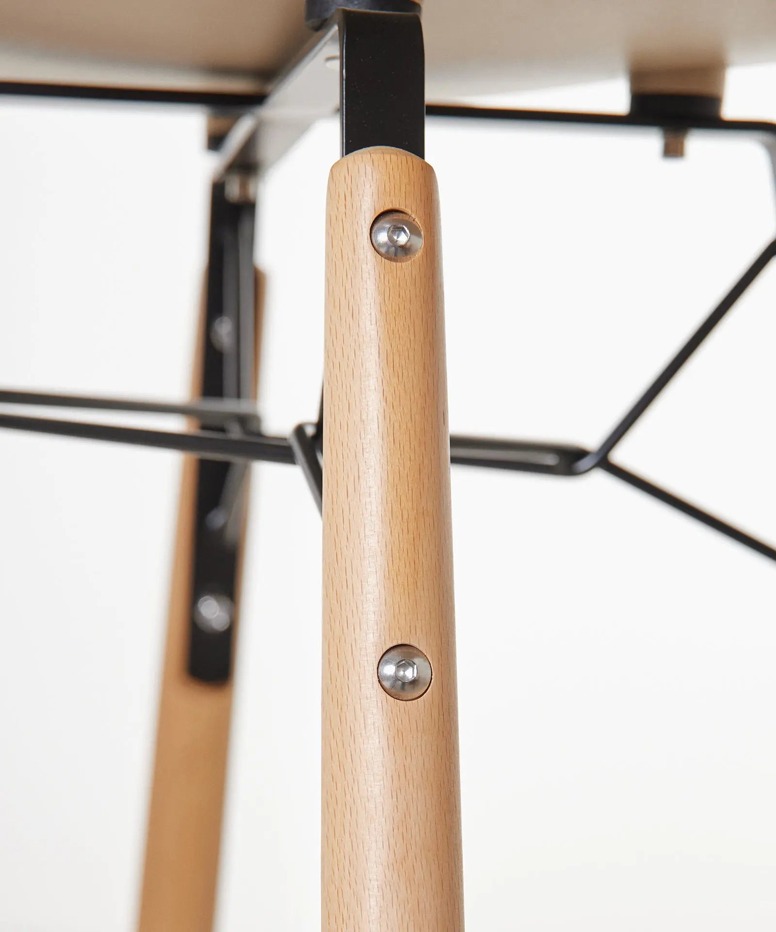 Seine Struktur aus Polypropylen bietet Robustheit und einfache Pflege. Die Beine sind aus hochwertigem Buchenholz mit Walnuss-Finish gefertigt und mit schwarzen Stahlstangen kombiniert.