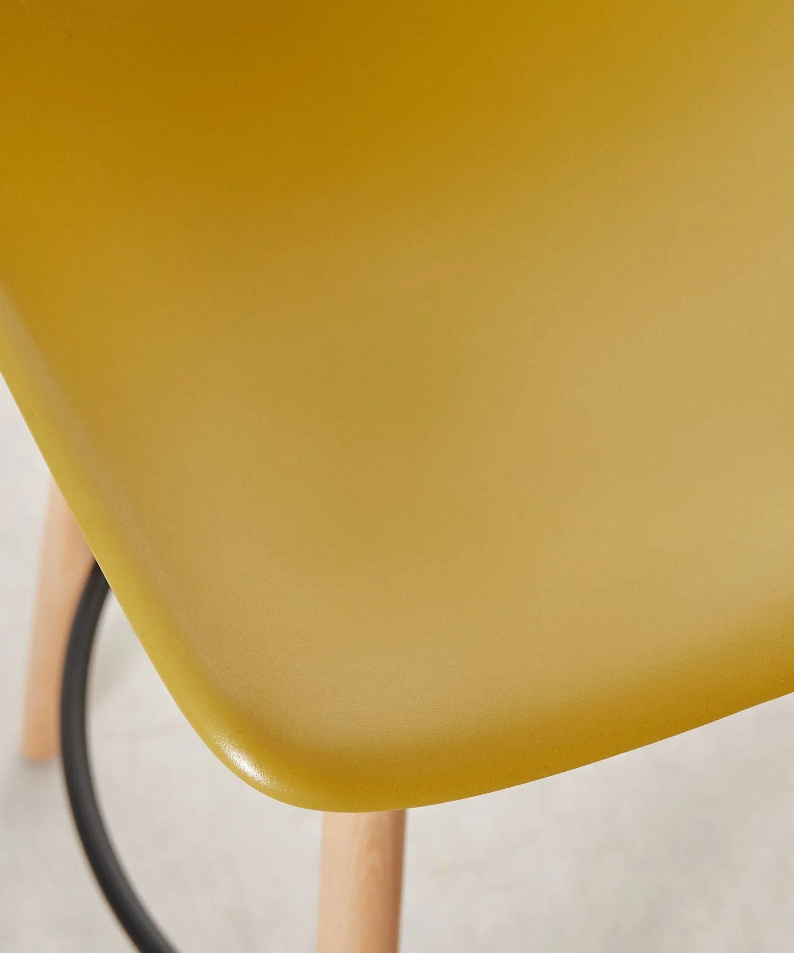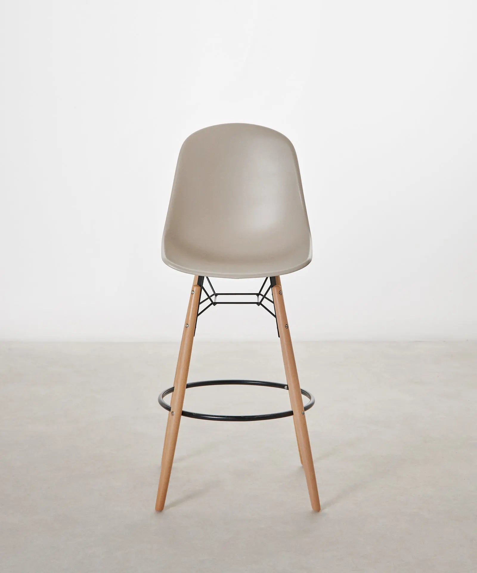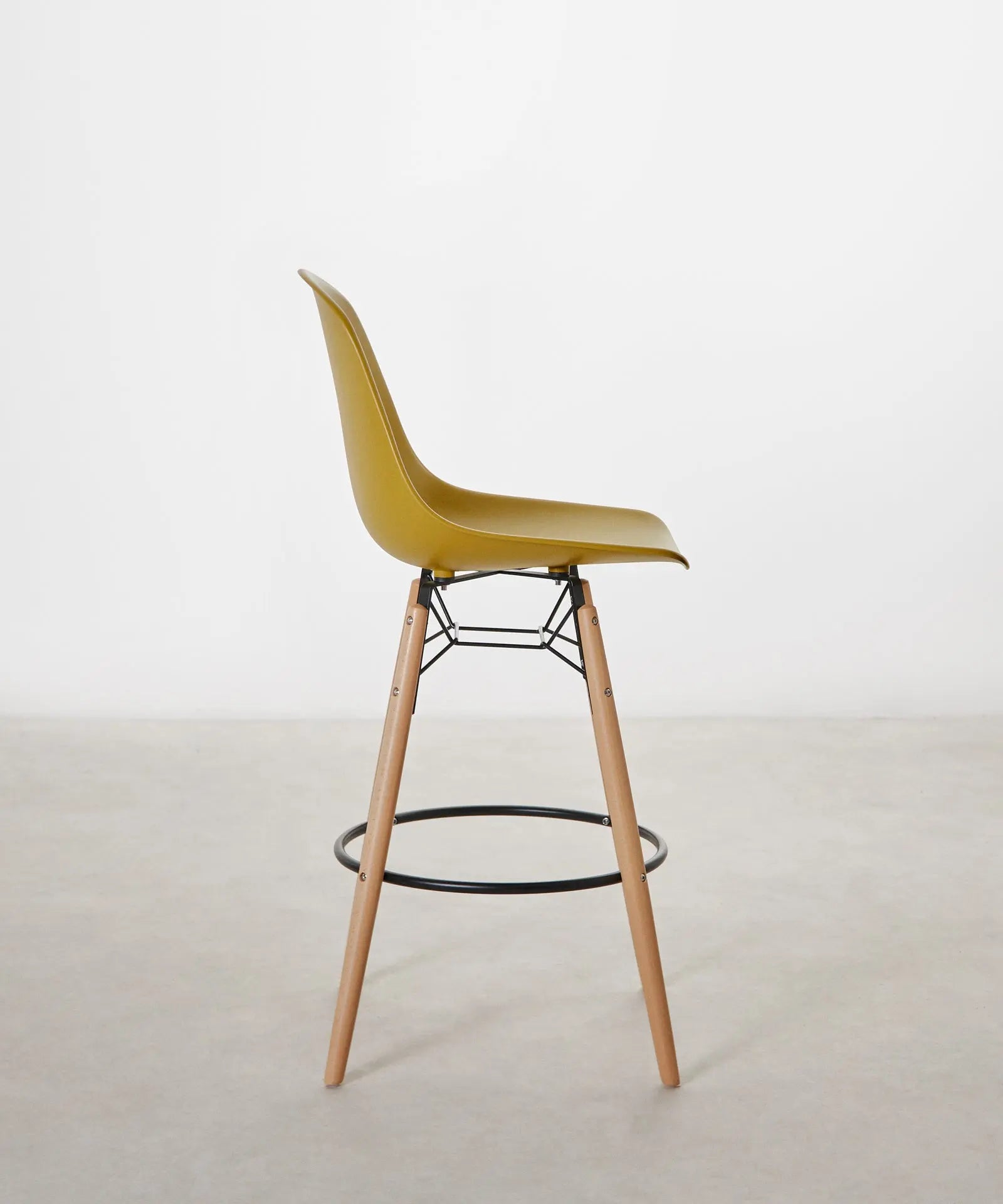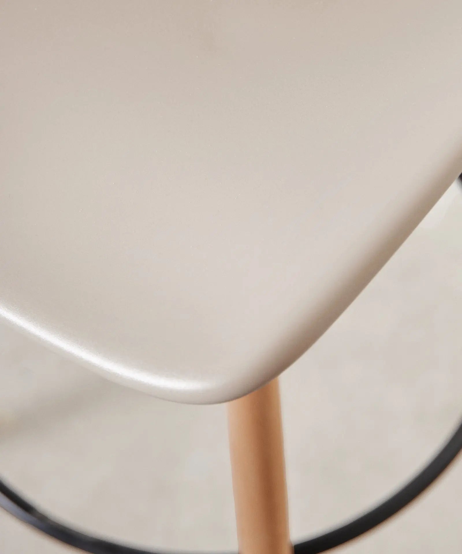 Seine Struktur aus Polypropylen bietet Robustheit und einfache Pflege. Die Beine sind aus hochwertigem Buchenholz mit Walnuss-Finish gefertigt und mit schwarzen Stahlstangen kombiniert.