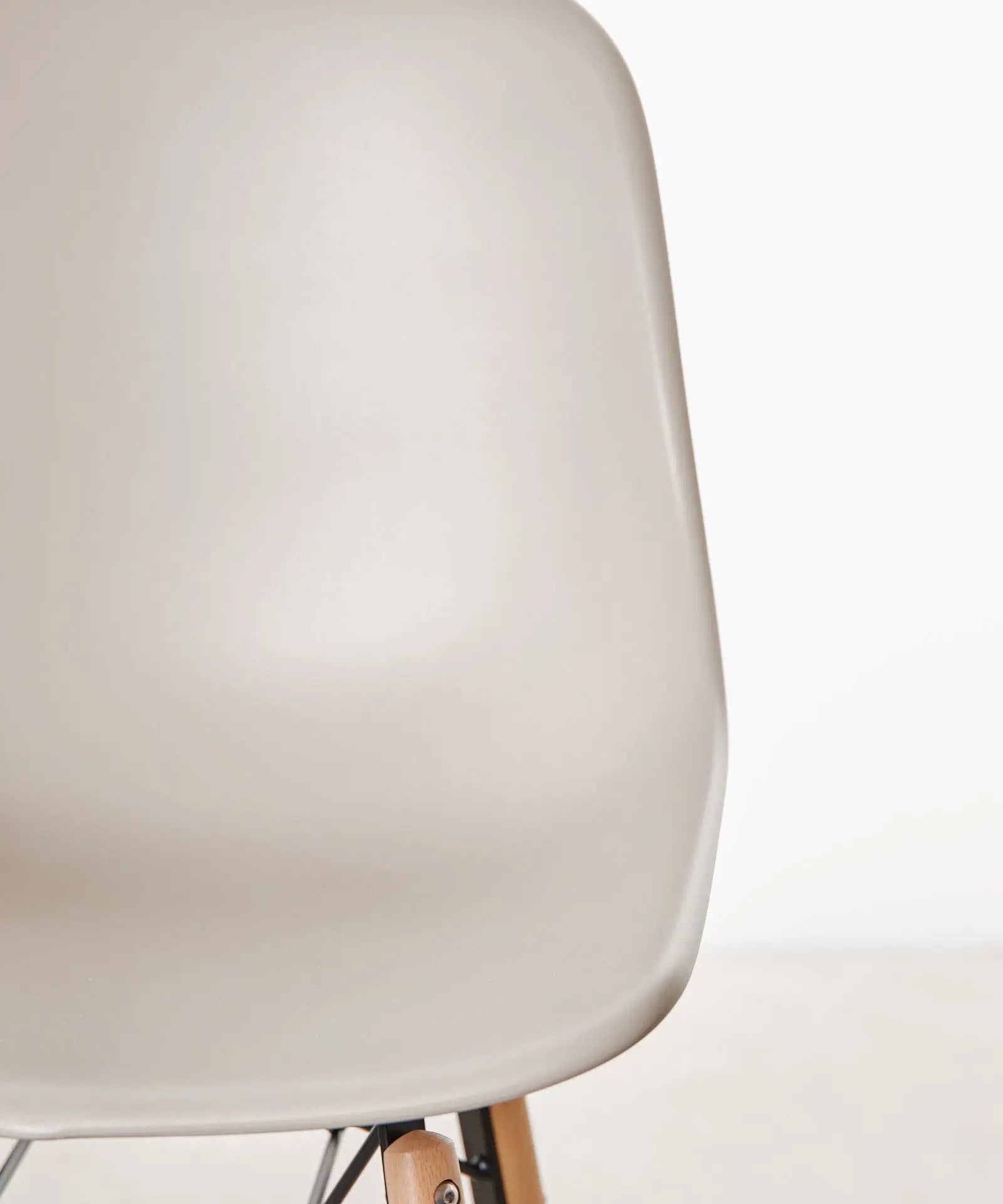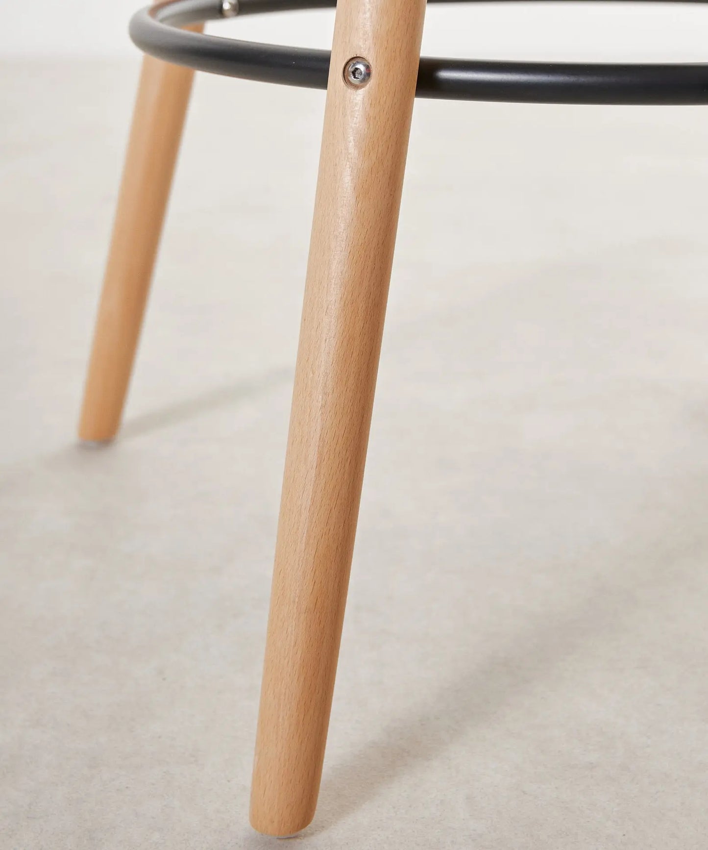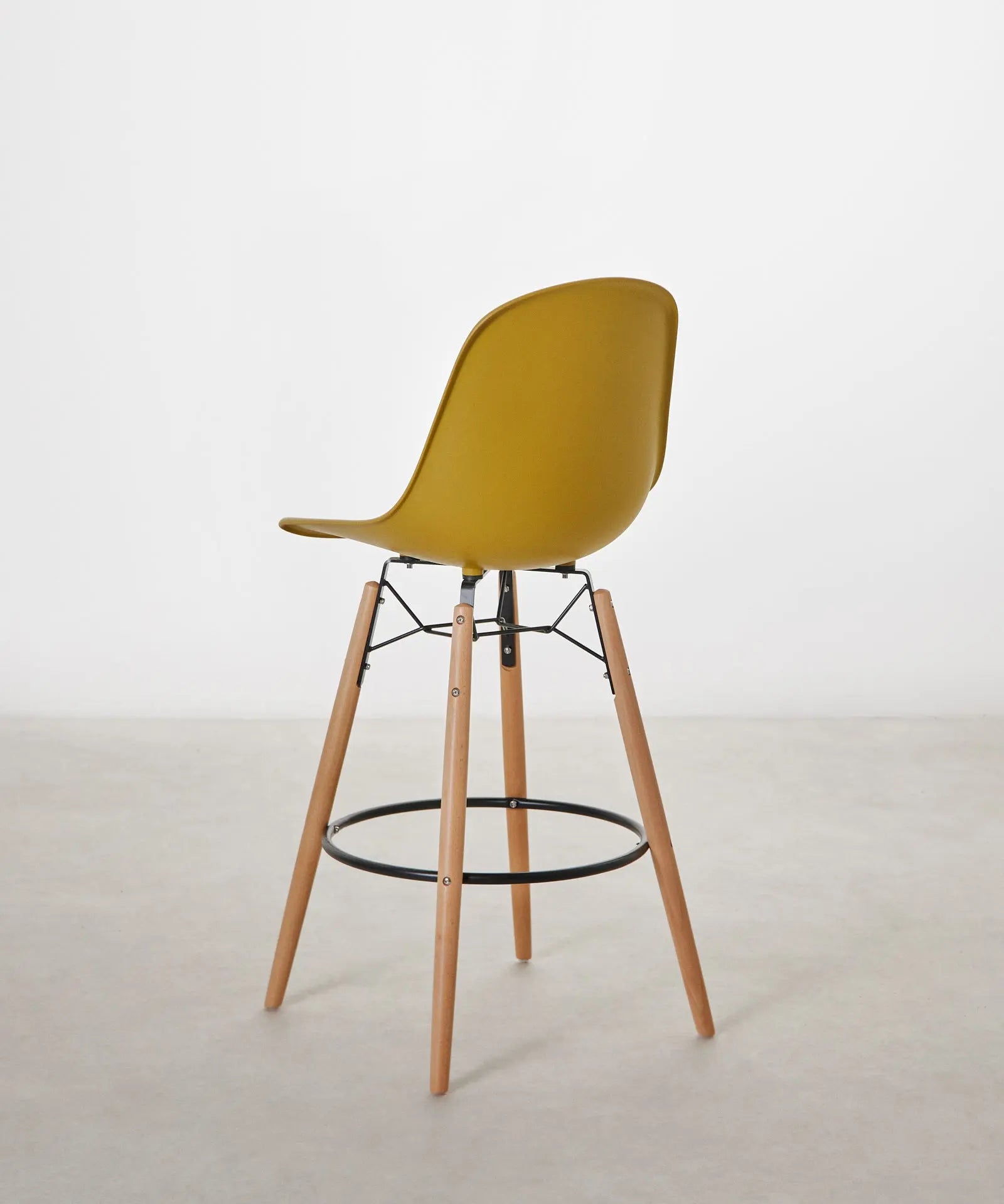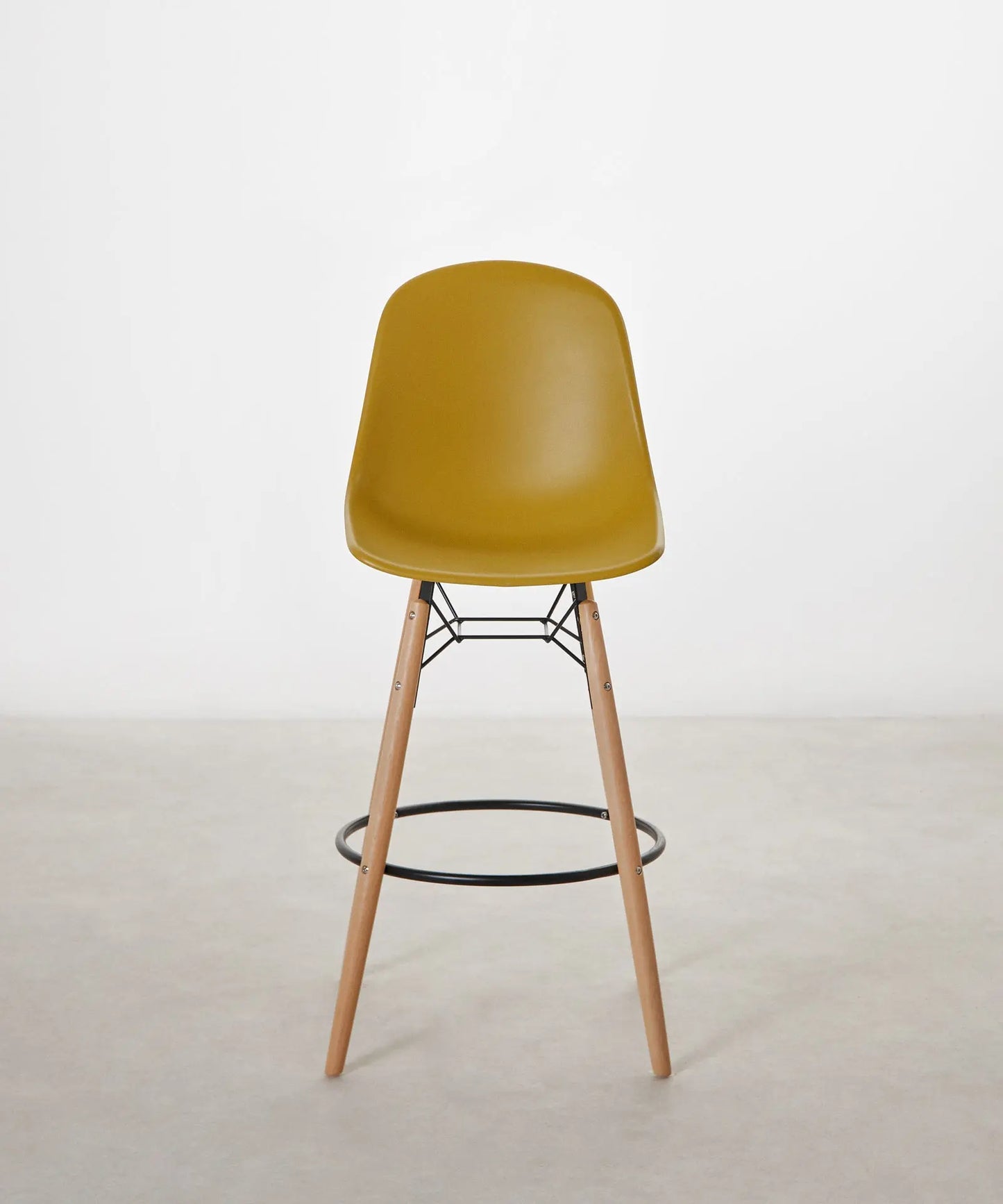 Seine Struktur aus Polypropylen bietet Robustheit und einfache Pflege. Die Beine sind aus hochwertigem Buchenholz mit Walnuss-Finish gefertigt und mit schwarzen Stahlstangen kombiniert.