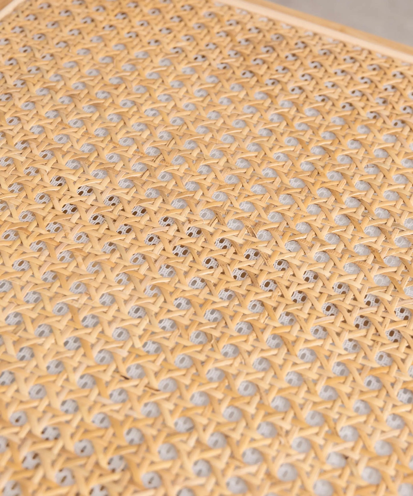 Seine Struktur und Rückenlehne bestehen aus robustem, natürlichem Eschenholz, das perfekt mit der Sitzfläche mit Rattan-Finish harmoniert.