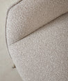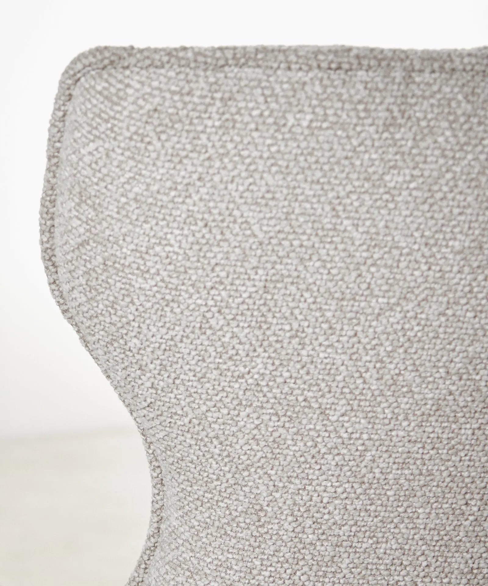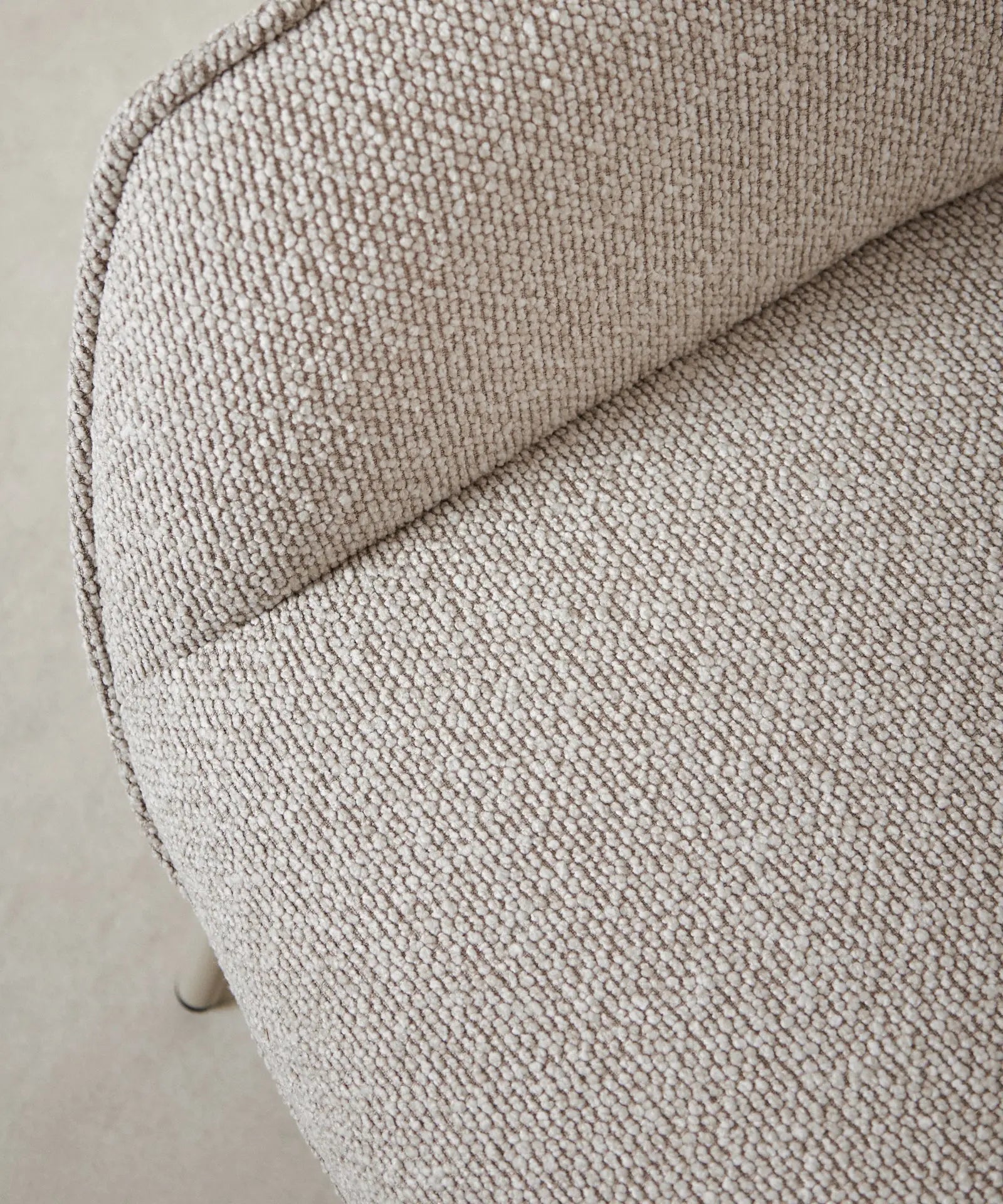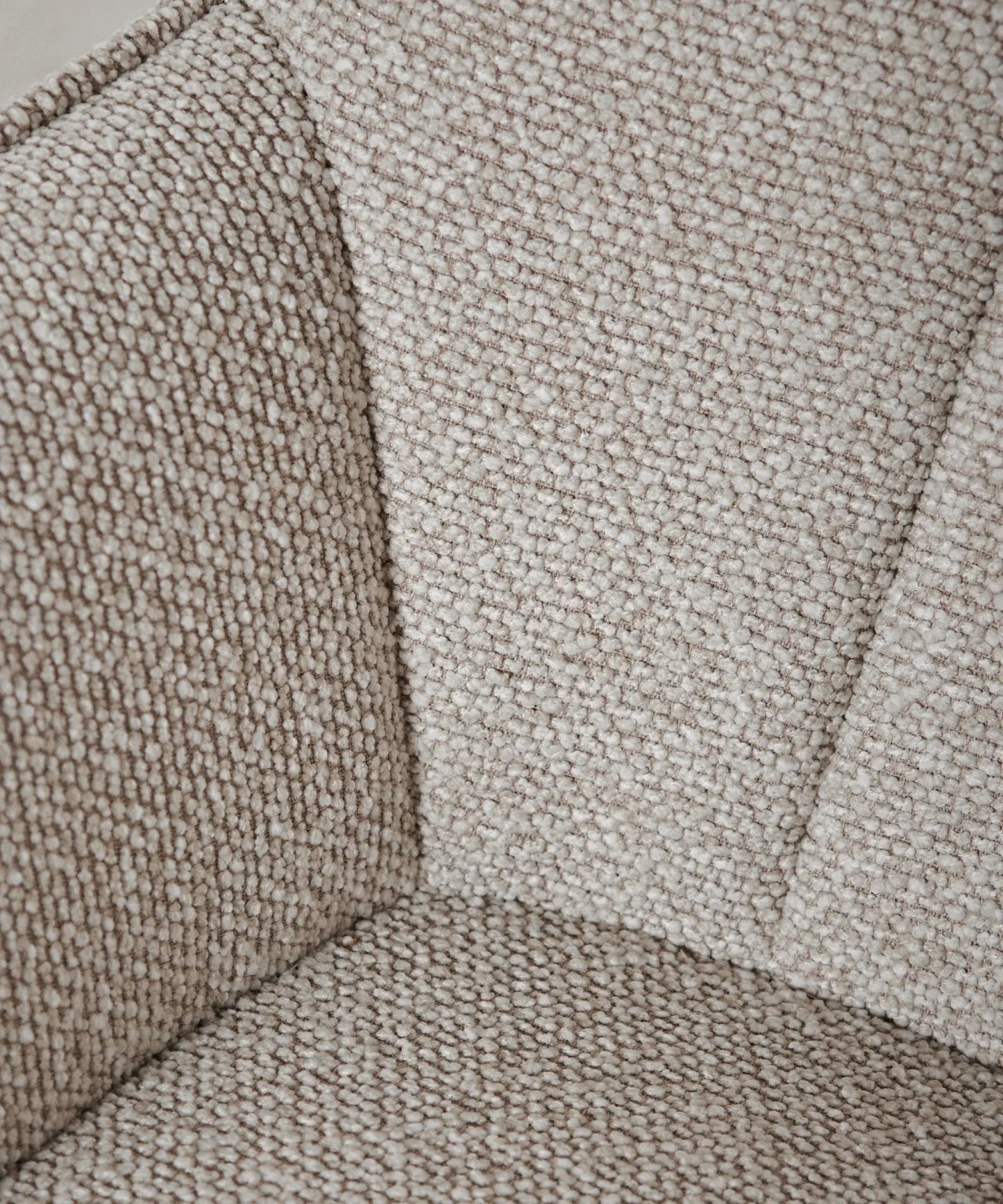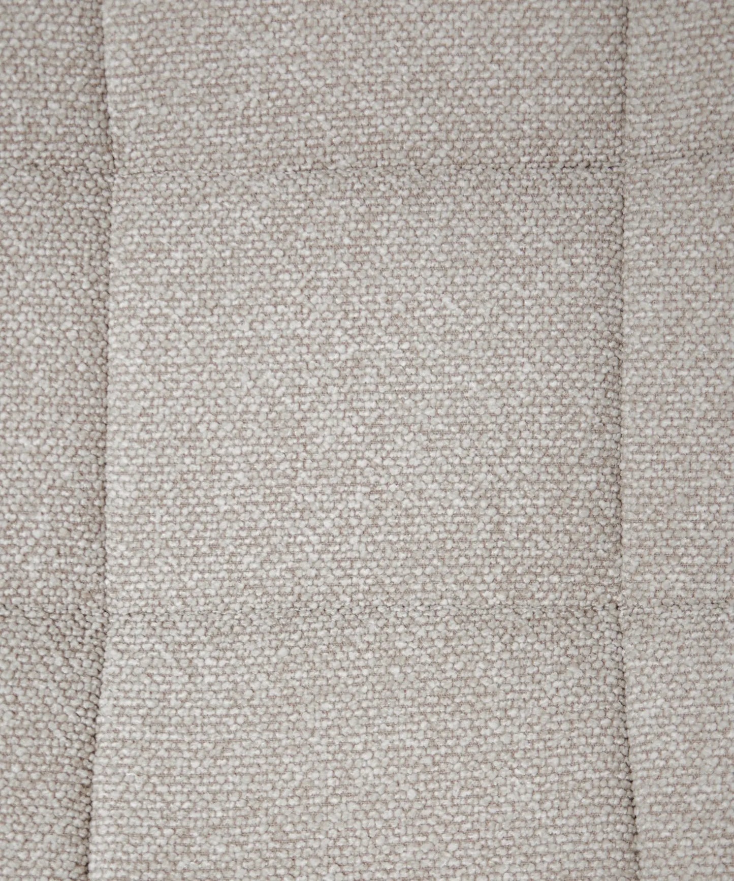 Der Bouclé-Stoffbezug verleiht eine ruhige und zeitlose Ästhetik, ideal für moderne oder skandinavische Innenräume. Besonders hervorzuheben ist das Steppmuster mit dekorativen Nähten, das dem Design eine elegante Note verleiht.