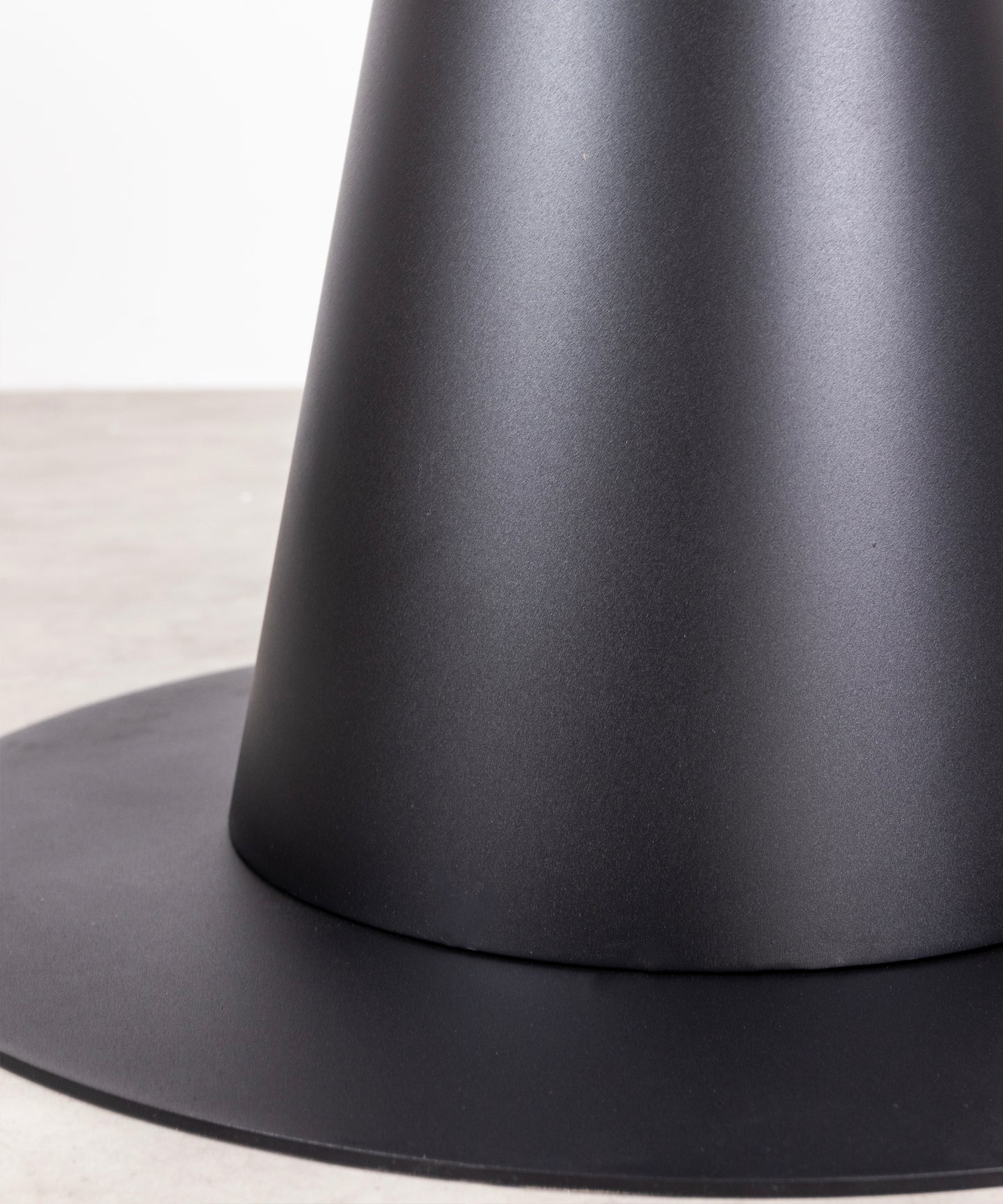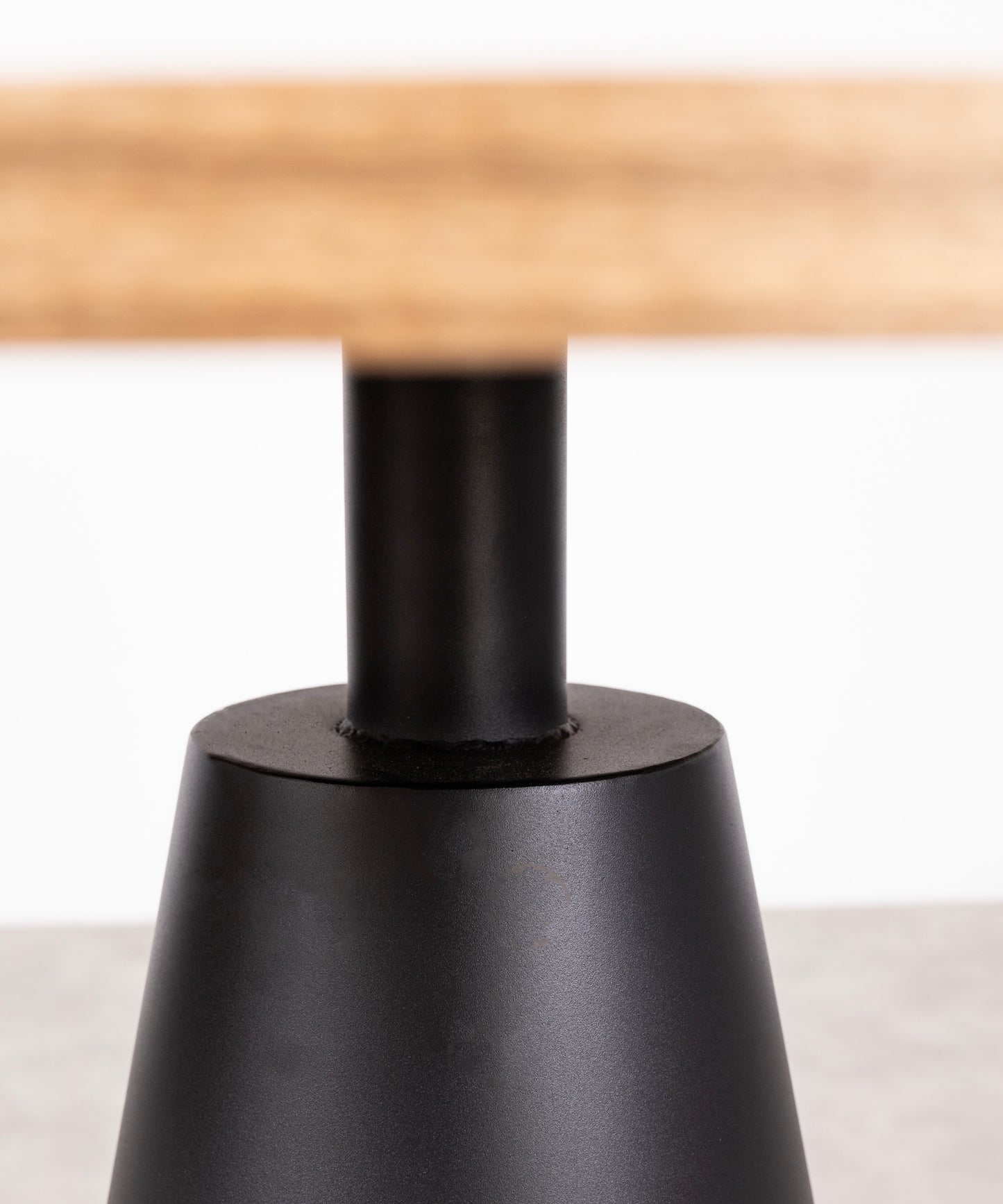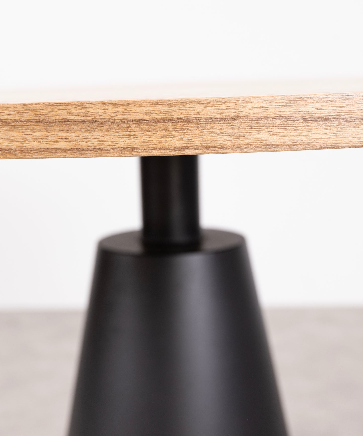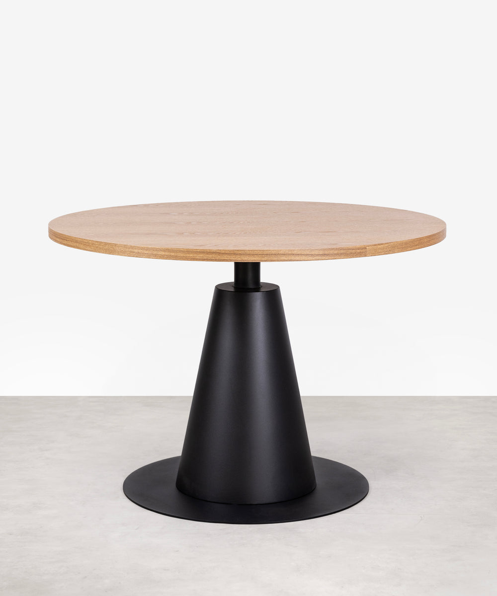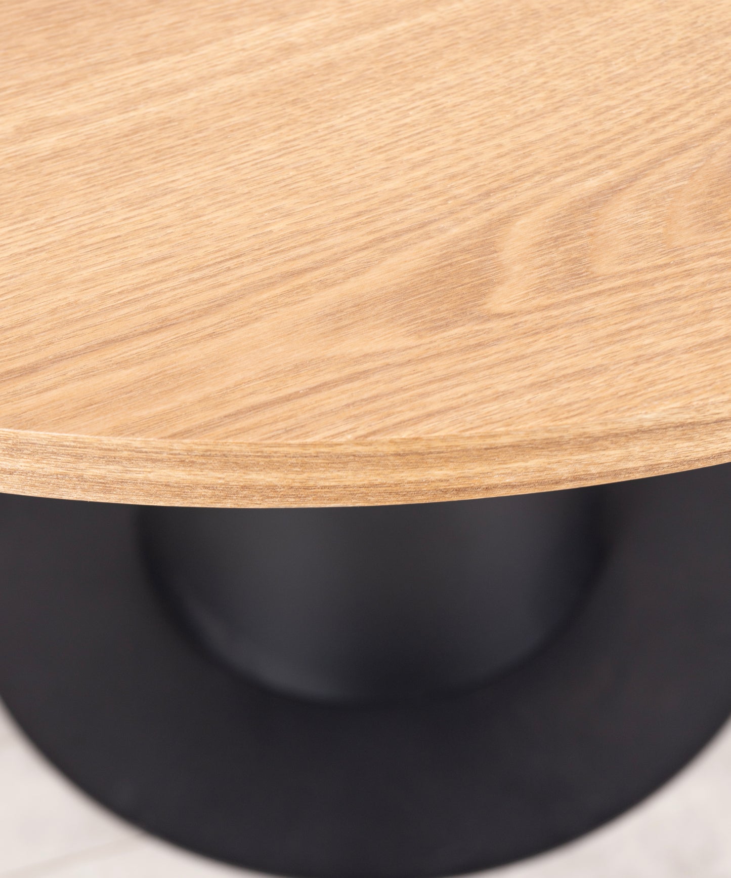 The table stands out with its solid conical base in a matte black finish. The round surface in natural oak plywood offers plenty of space for dinners or gatherings.