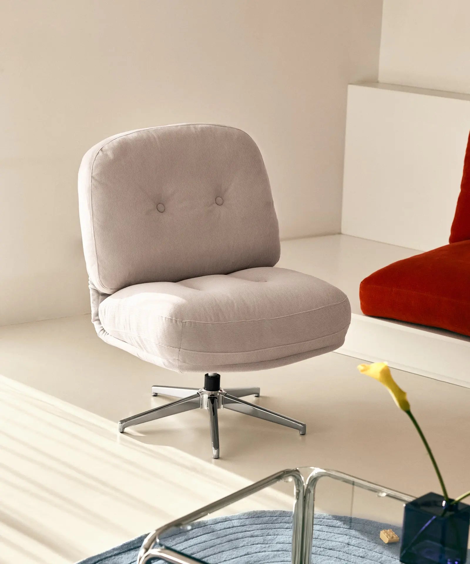 Its swivel metal base ensures stability and functionality, allowing smooth and comfortable movement. Without a doubt, the Orbit armchair will become the centerpiece of your home.