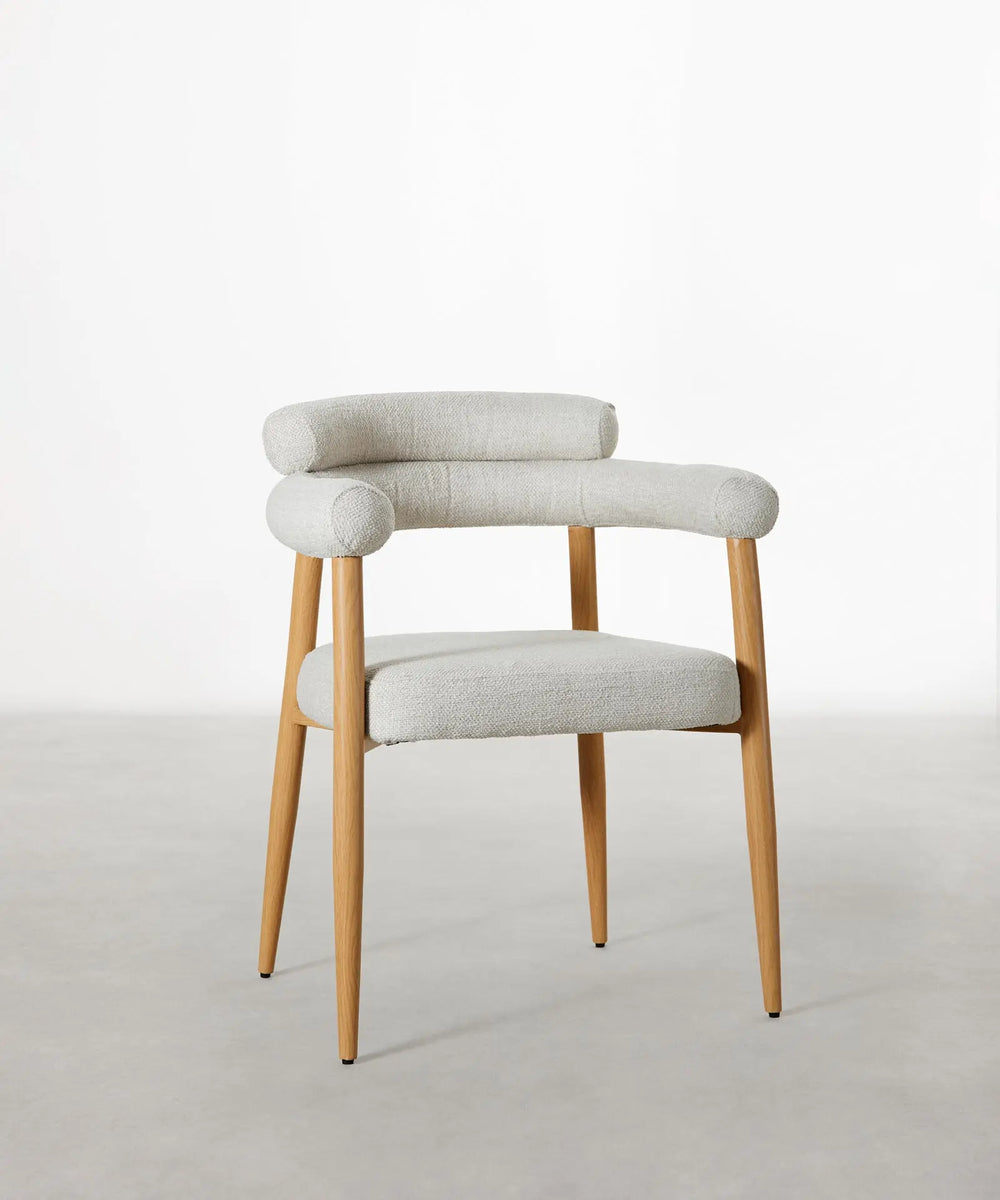 The Serena Chair combines a contemporary design with the elegance of natural materials. Its metallic structure adds warmth and sophistication, while the upholstered seat and backrest offer a harmonious and versatile contrast that adapts to different decorative styles.