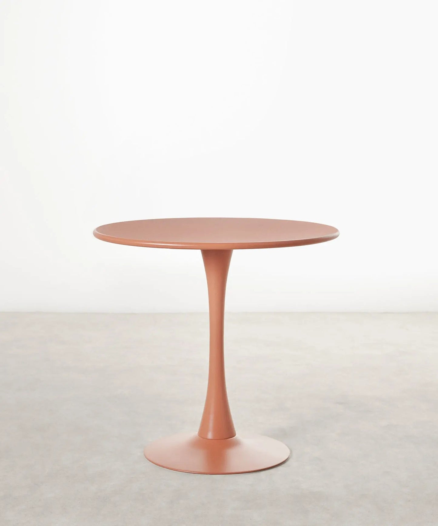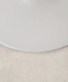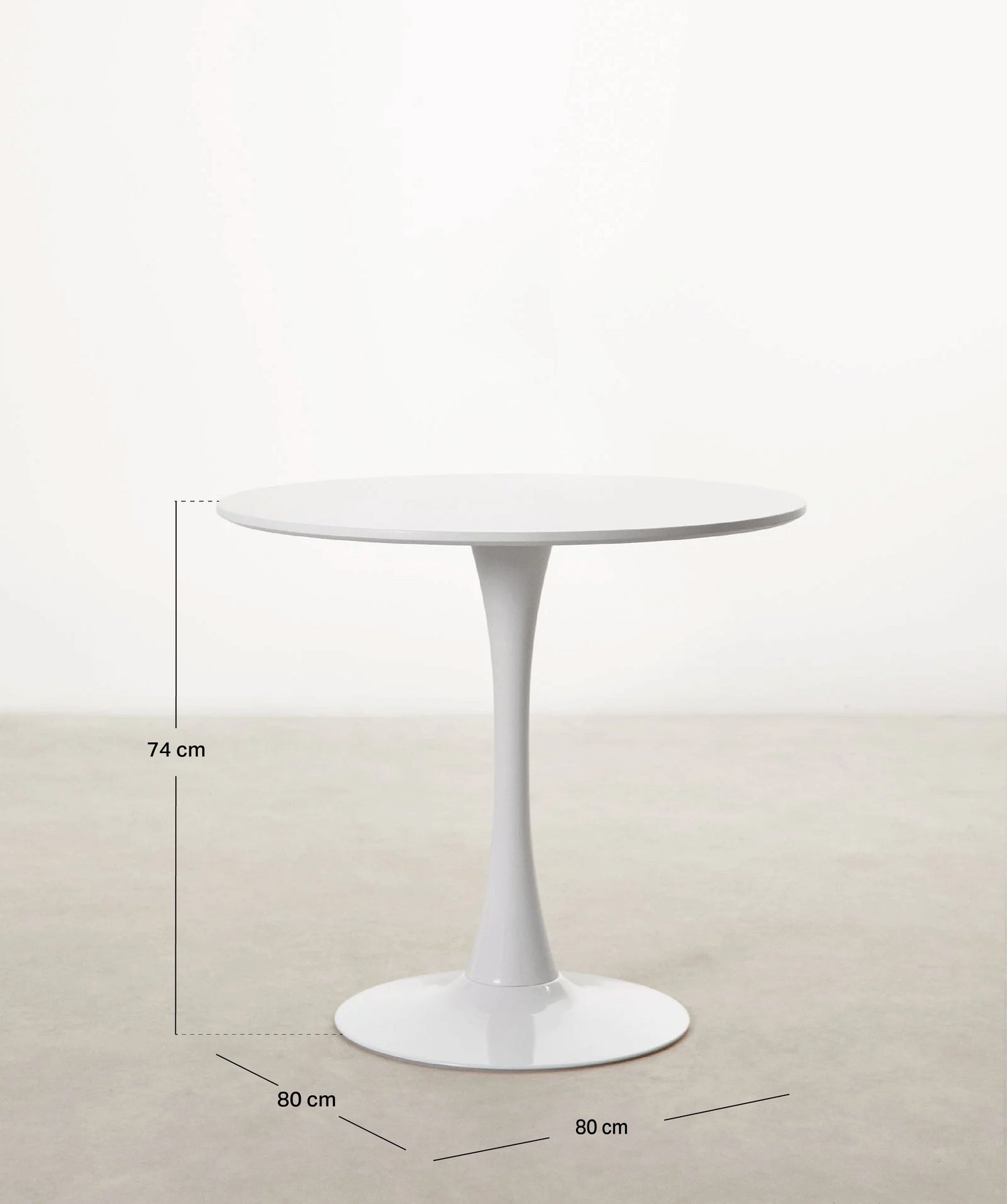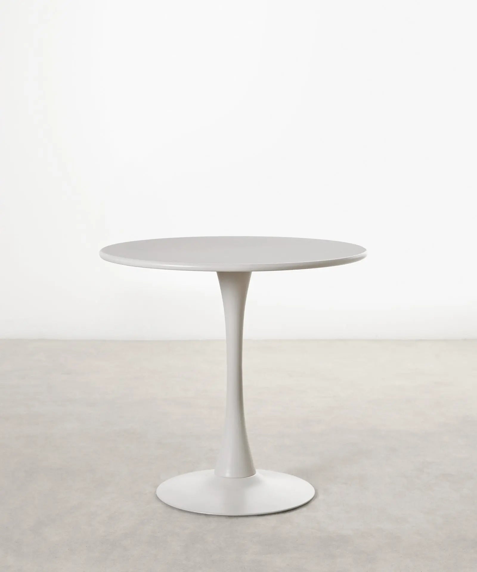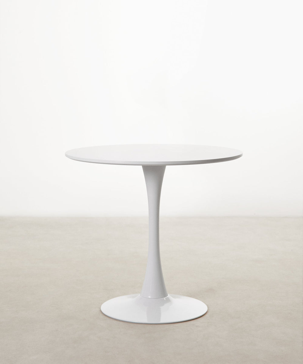 It is made of metal, coated in white lacquered fiberglass, with a smooth, glossy top. Ideal for dining rooms, kitchens, or contemporary spaces, its round surface encourages conversation and creates a warm, balanced atmosphere.