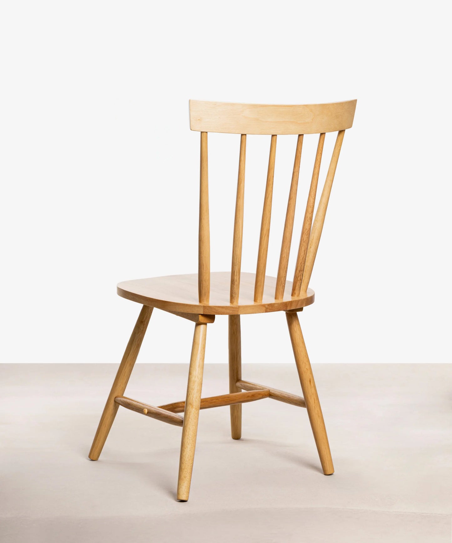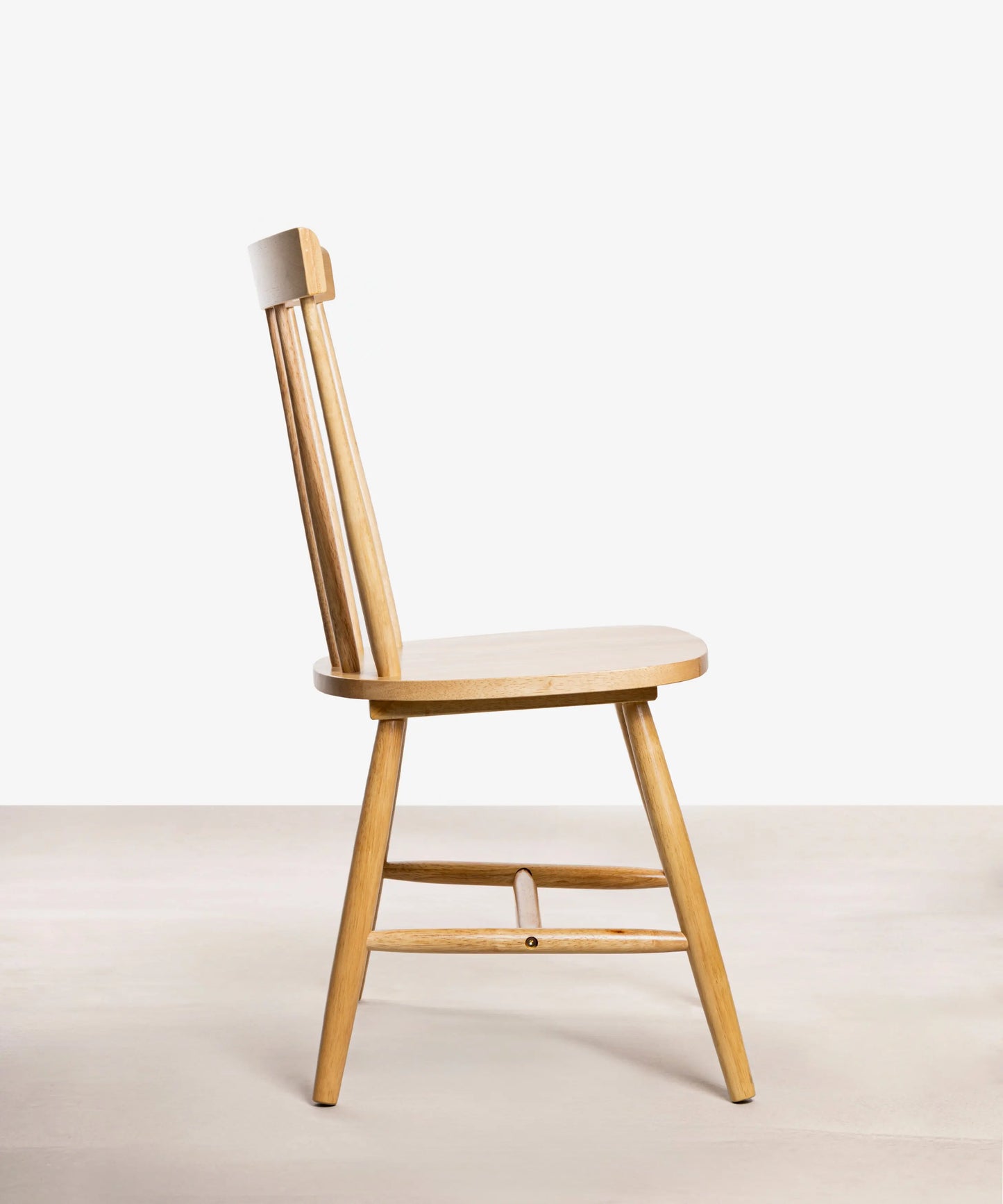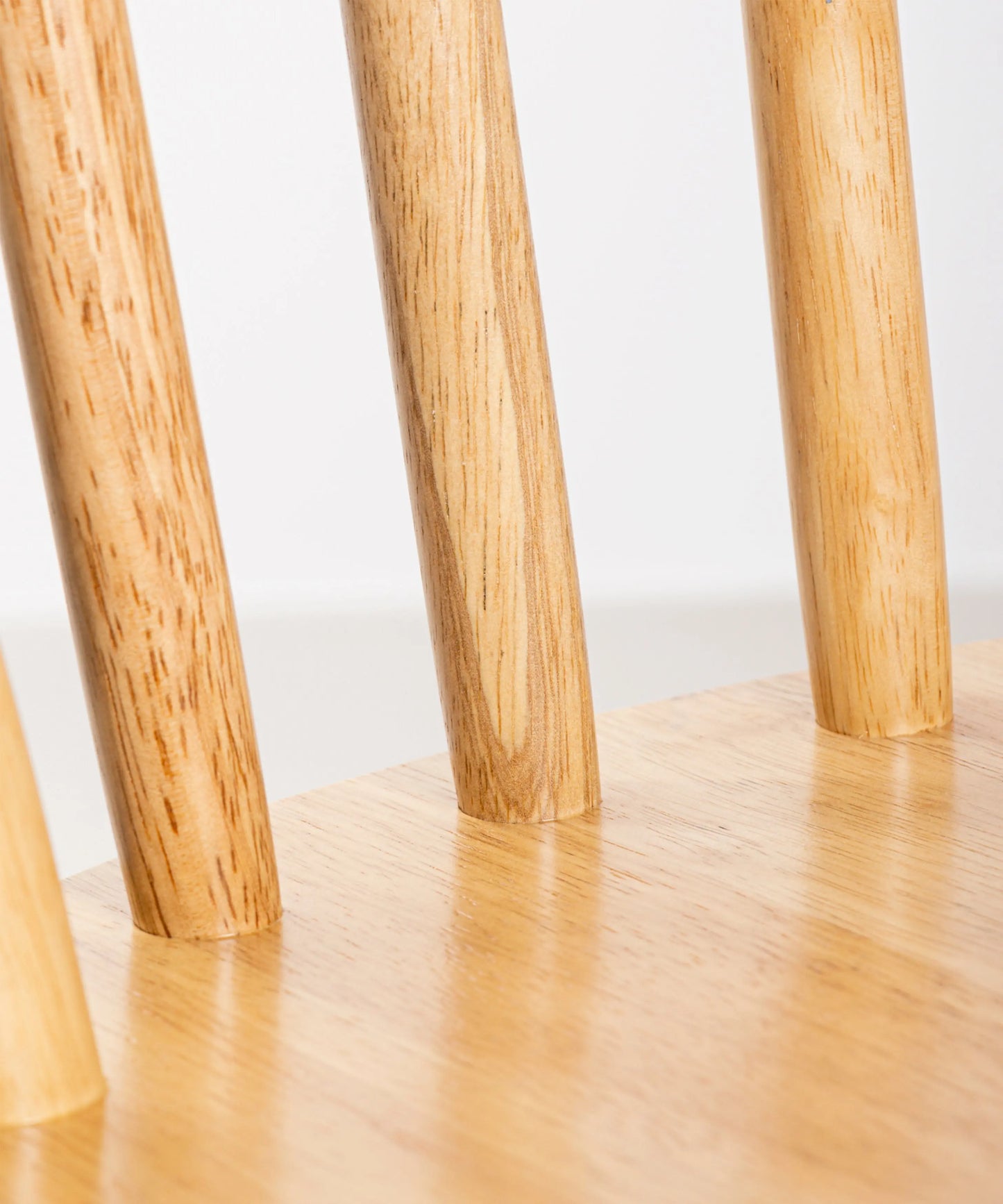 Its backrest with rods and its characteristic legs evoke the Nordic style of the 50s. Each rod is hand-carved, thus highlighting the authentic character of these chairs. Its oak wood structure is light and elegant.