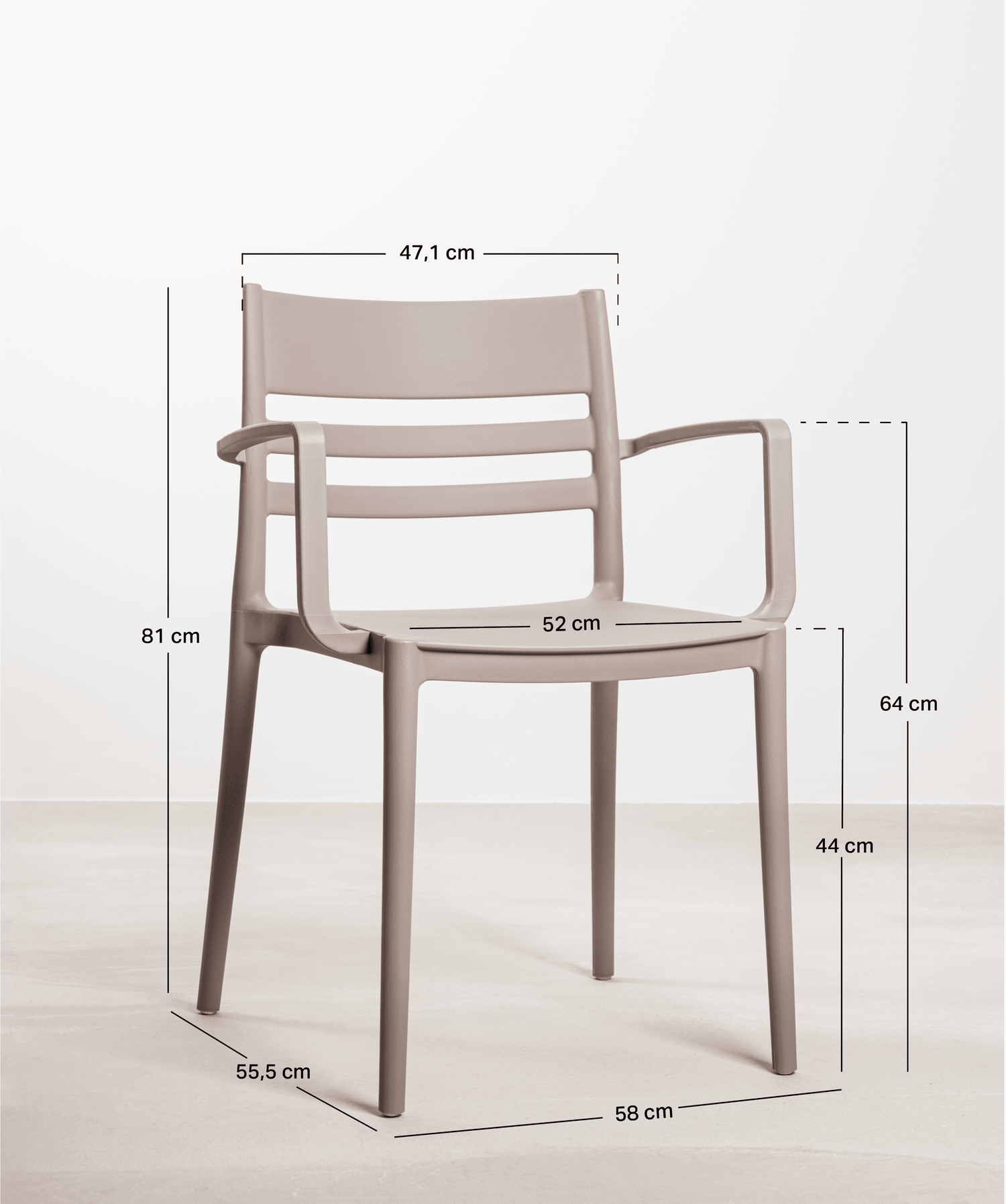 Nina Arms is a resistant chair, made of high quality polypropylene plastic. This material makes it an ideal chair for day-to-day use in dining rooms and living rooms or gardens, as it is easy to maintain and clean.