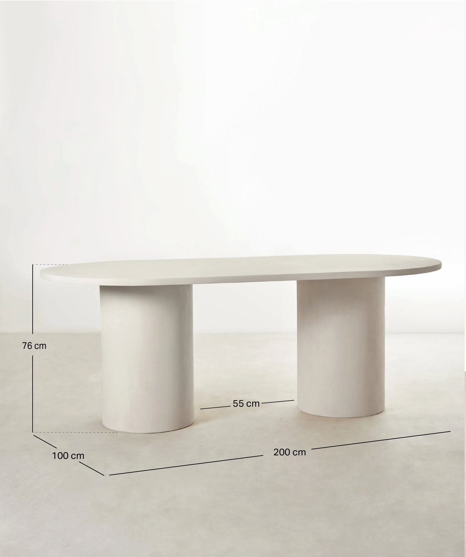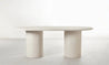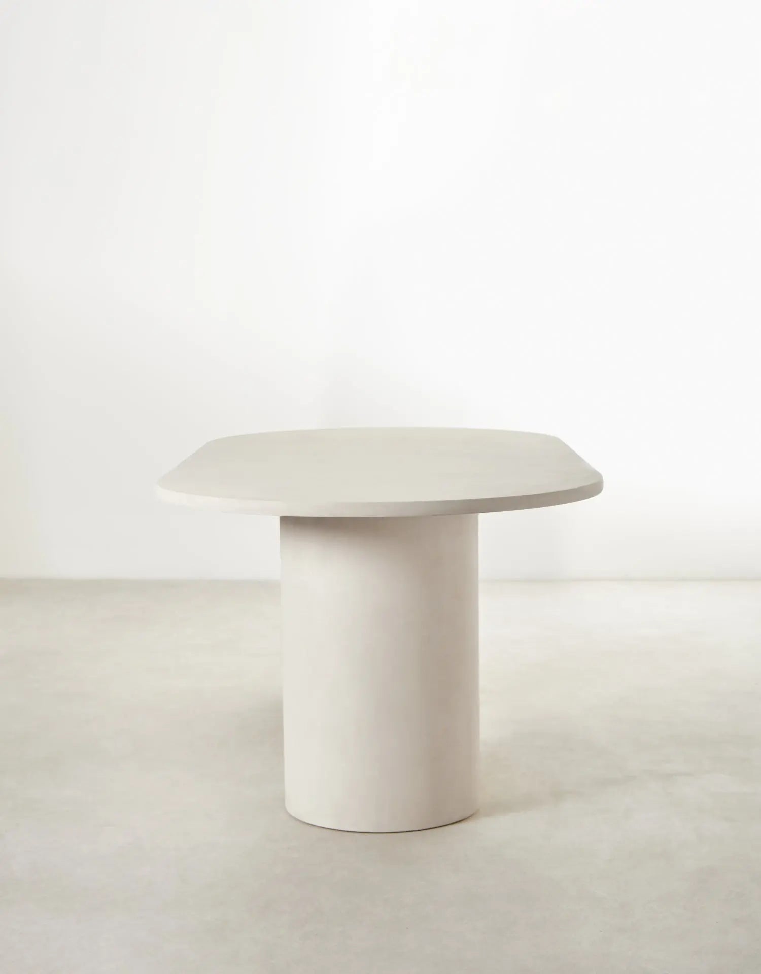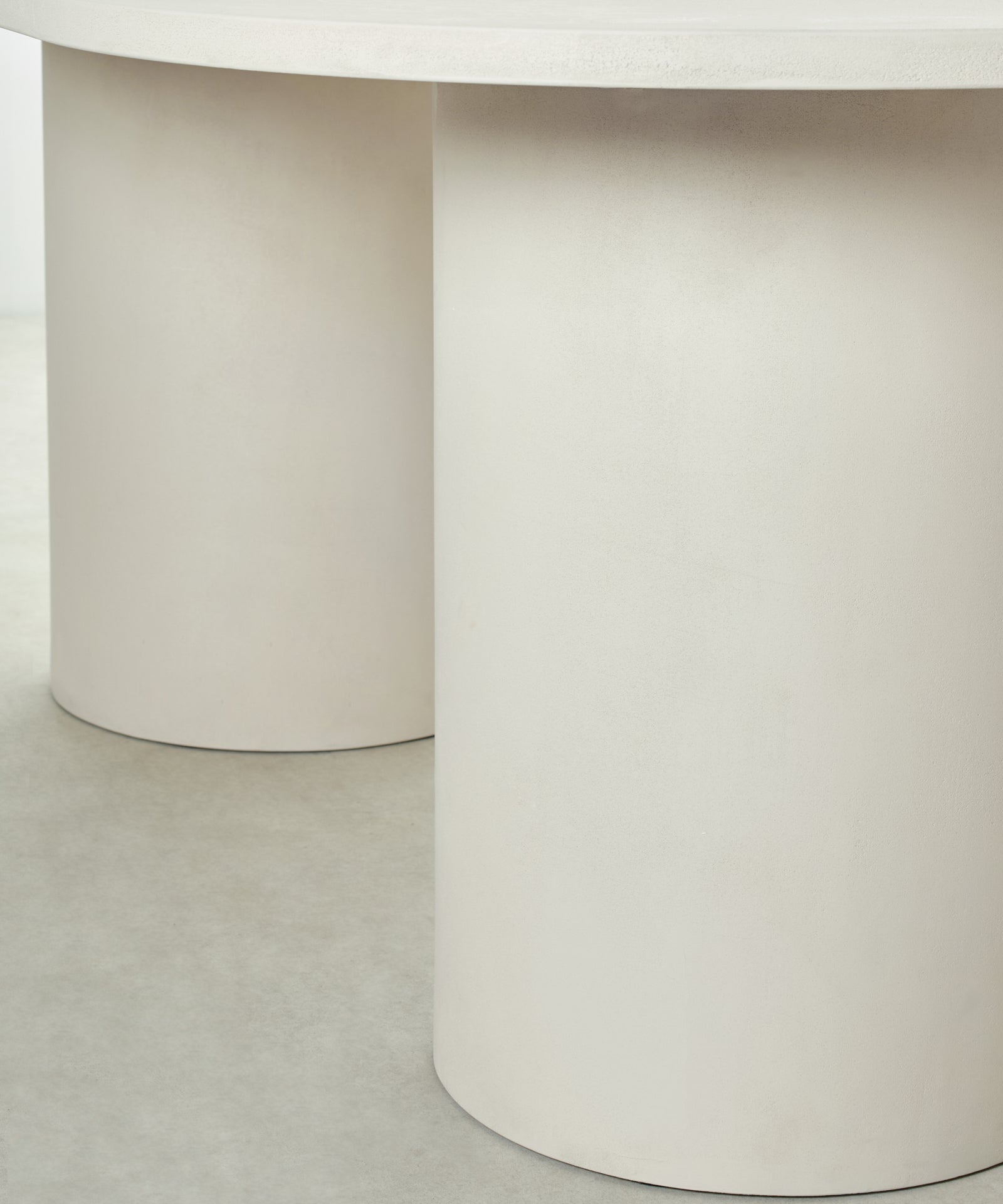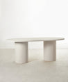 The Juno Oval Dining Table stands out for its minimalist and elegant design. It features an oval-shaped top supported by two robust cylindrical bases. Its off-white finish brings brightness and a contemporary style that easily blends with any décor.