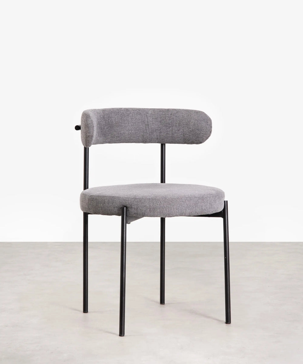 Its structure made of metal provides a solid and stable base. The curved backrest upholstered in fabric stands out for its minimalist aesthetics and ergonomics, ensuring maximum comfort during use.