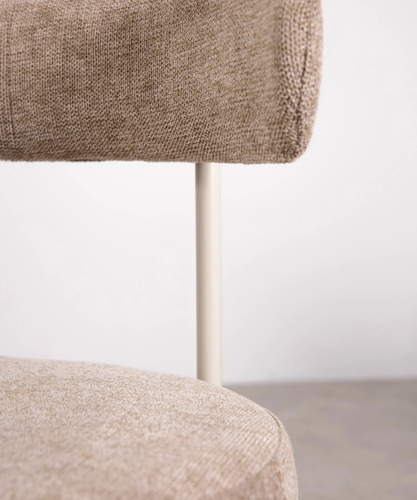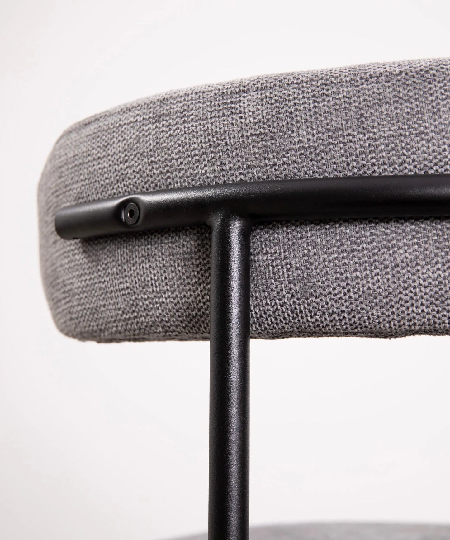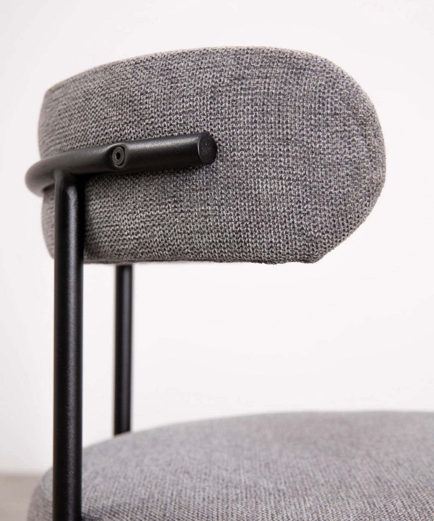 Its structure made of metal provides a solid and stable base. The curved backrest upholstered in fabric stands out for its minimalist aesthetics and ergonomics, ensuring maximum comfort during use.