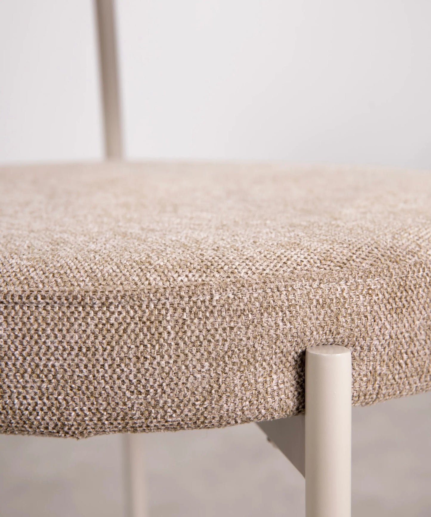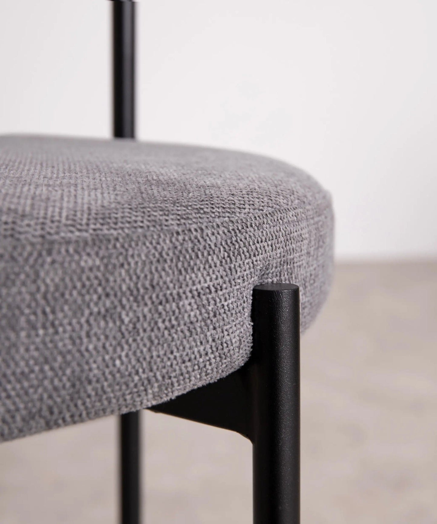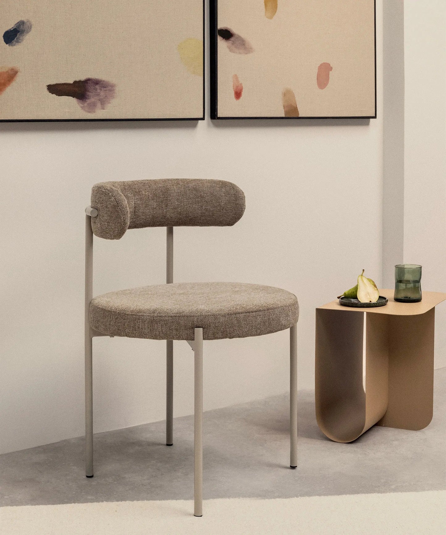 Its structure made of metal provides a solid and stable base. The curved backrest upholstered in fabric stands out for its minimalist aesthetics and ergonomics, ensuring maximum comfort during use.