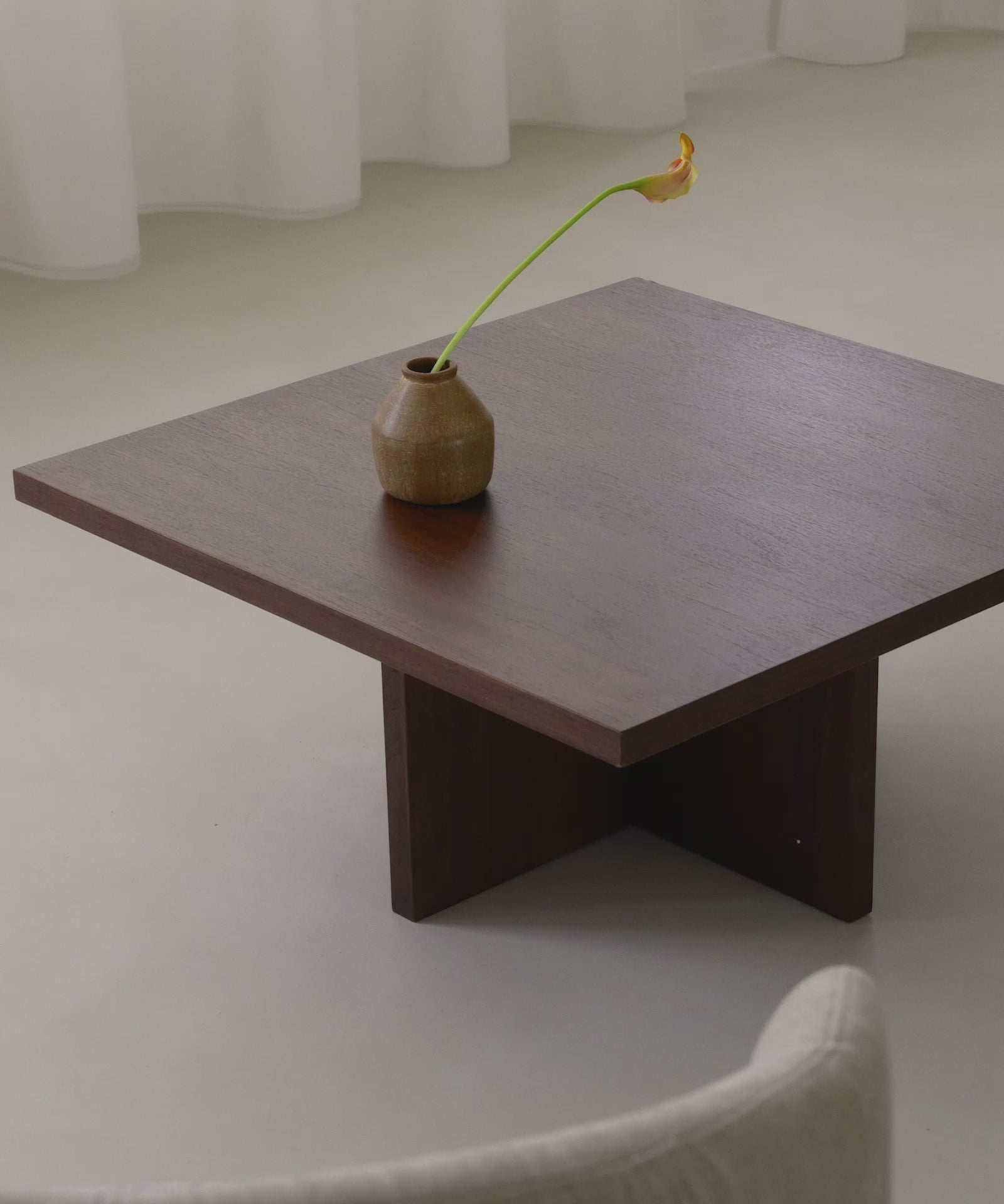 Its square natural wood tabletop highlights the grain of the wood. The central cross-shaped base provides stability and offers a timeless architectural style.