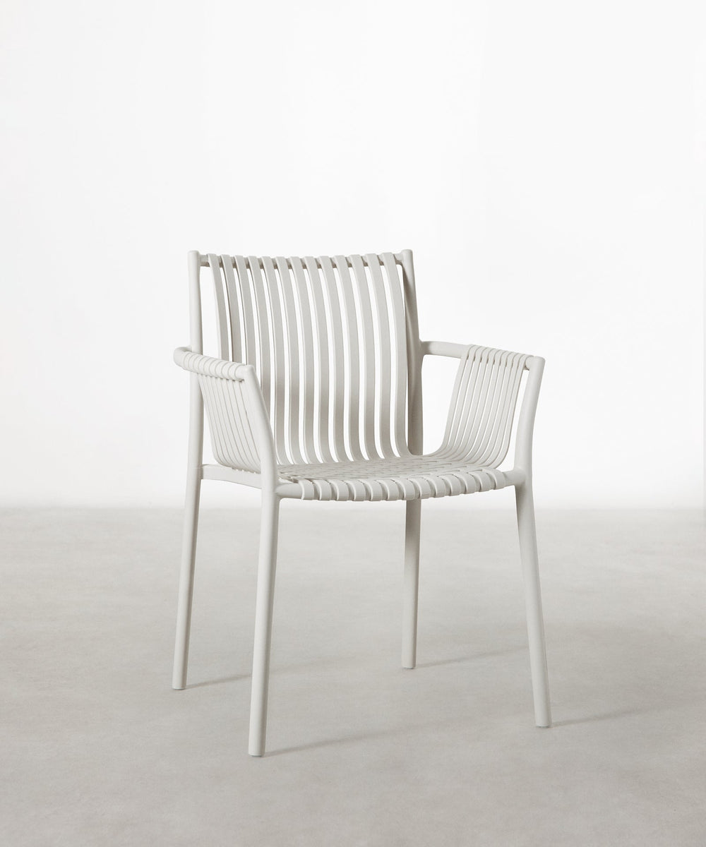 It is made of durable, high-quality polypropylene, ideal for daily use thanks to its strength and easy maintenance. The integrated armrests and slatted backrest provide extra comfort and ventilation.