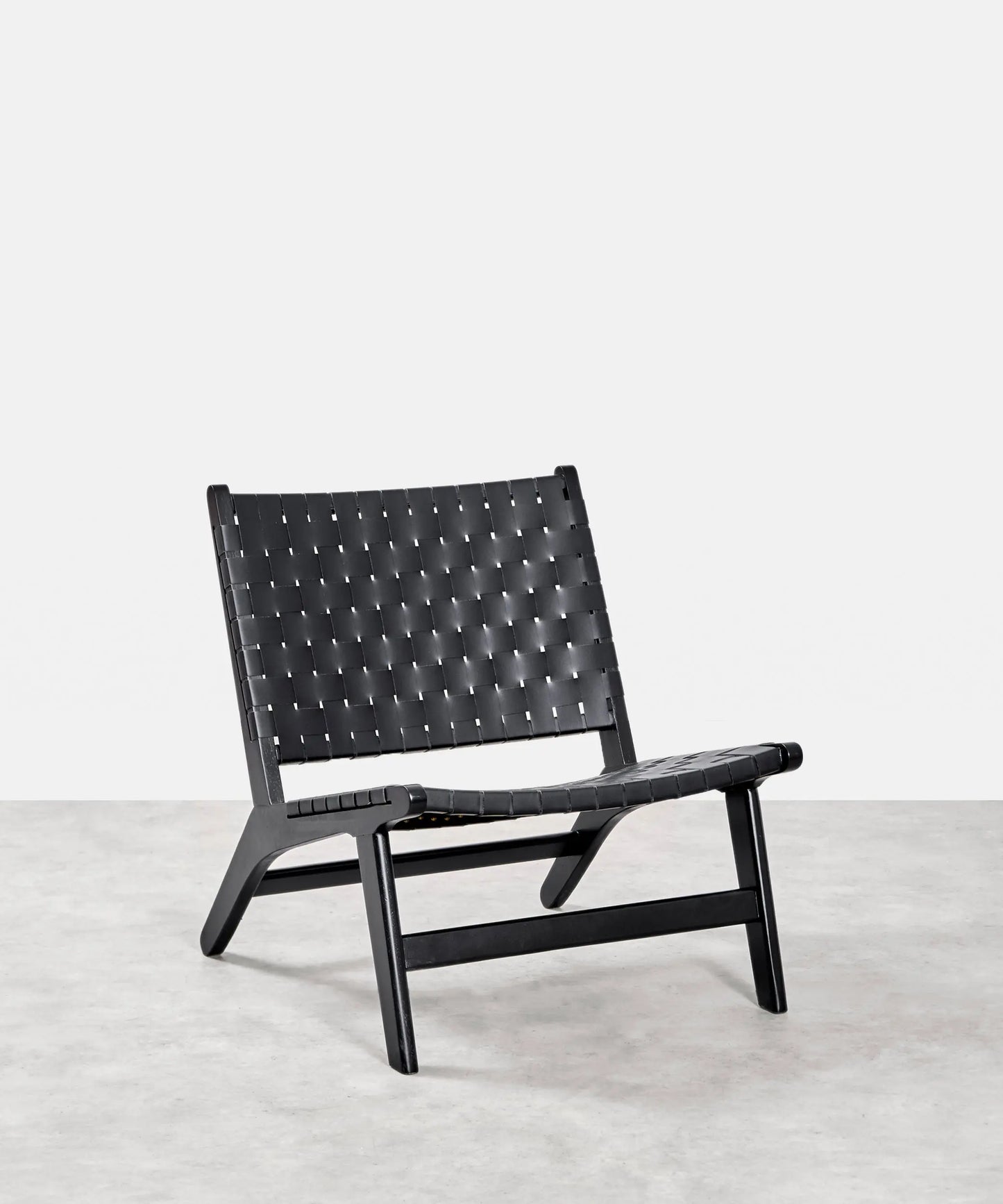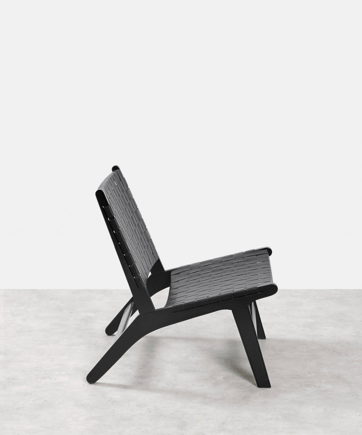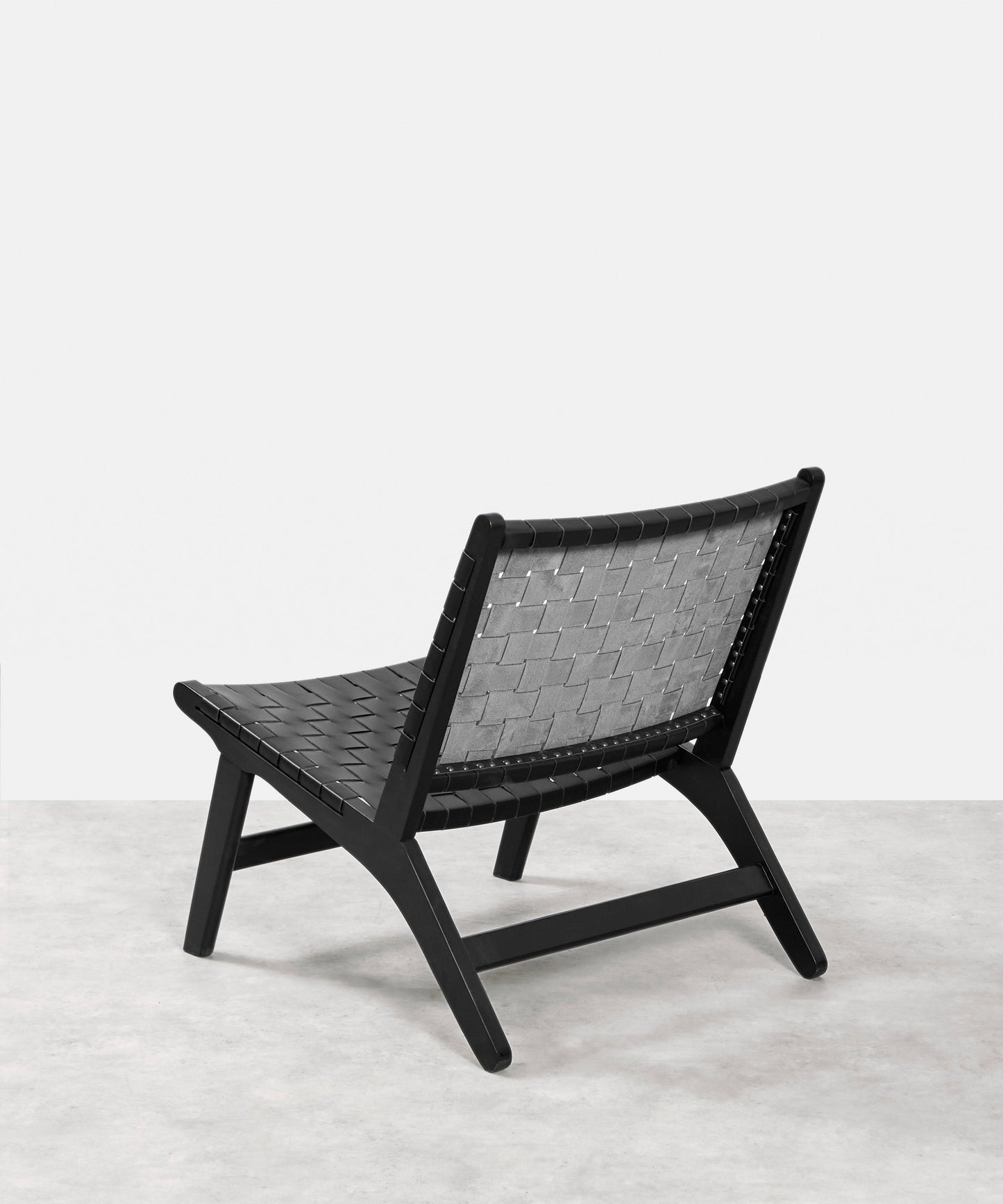 Its sturdy frame is made of solid wood with a black lacquered finish. The seat and backrest are crafted with woven synthetic leather straps, offering not only aesthetic appeal but also an ergonomic fit that adapts to the body.