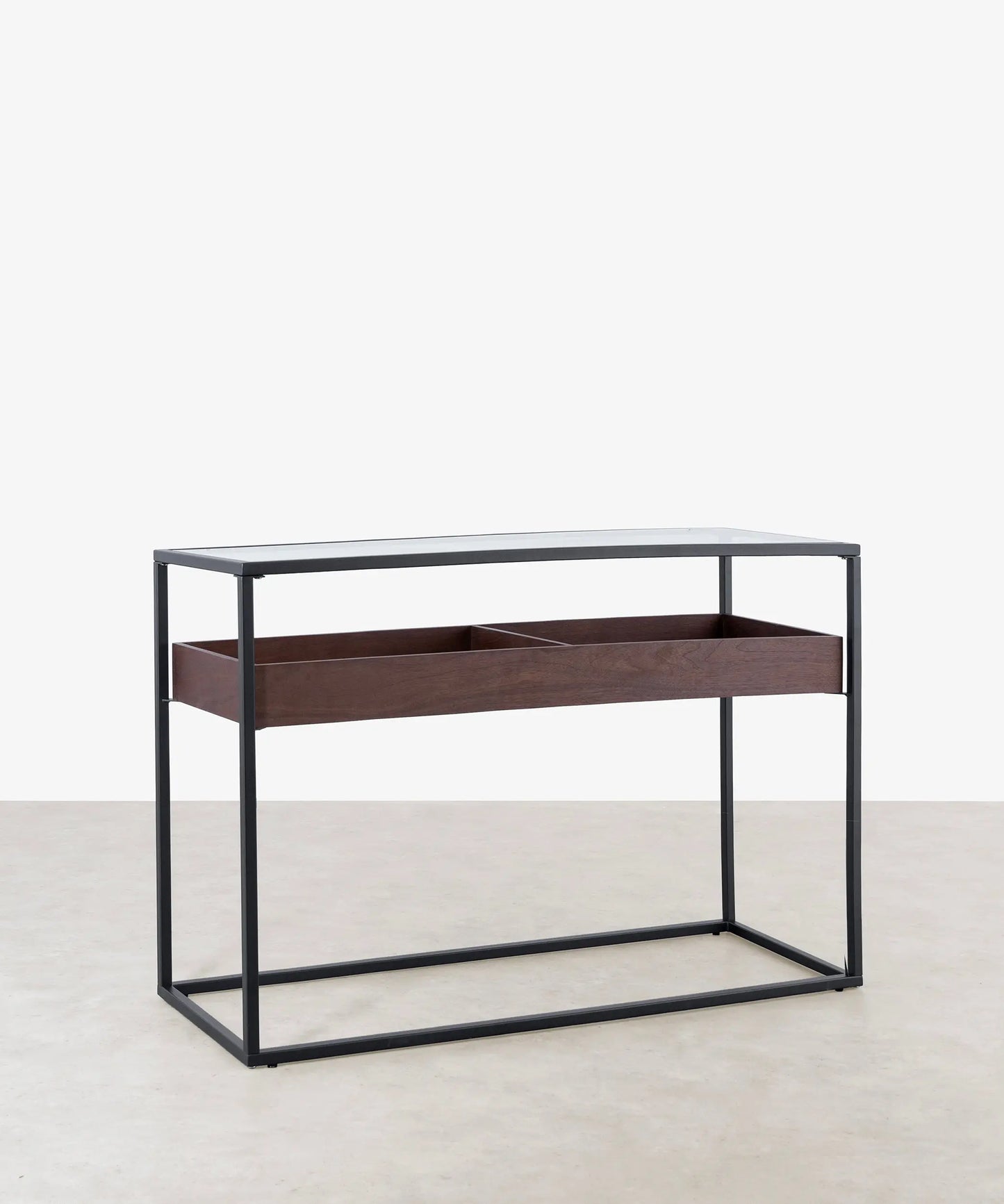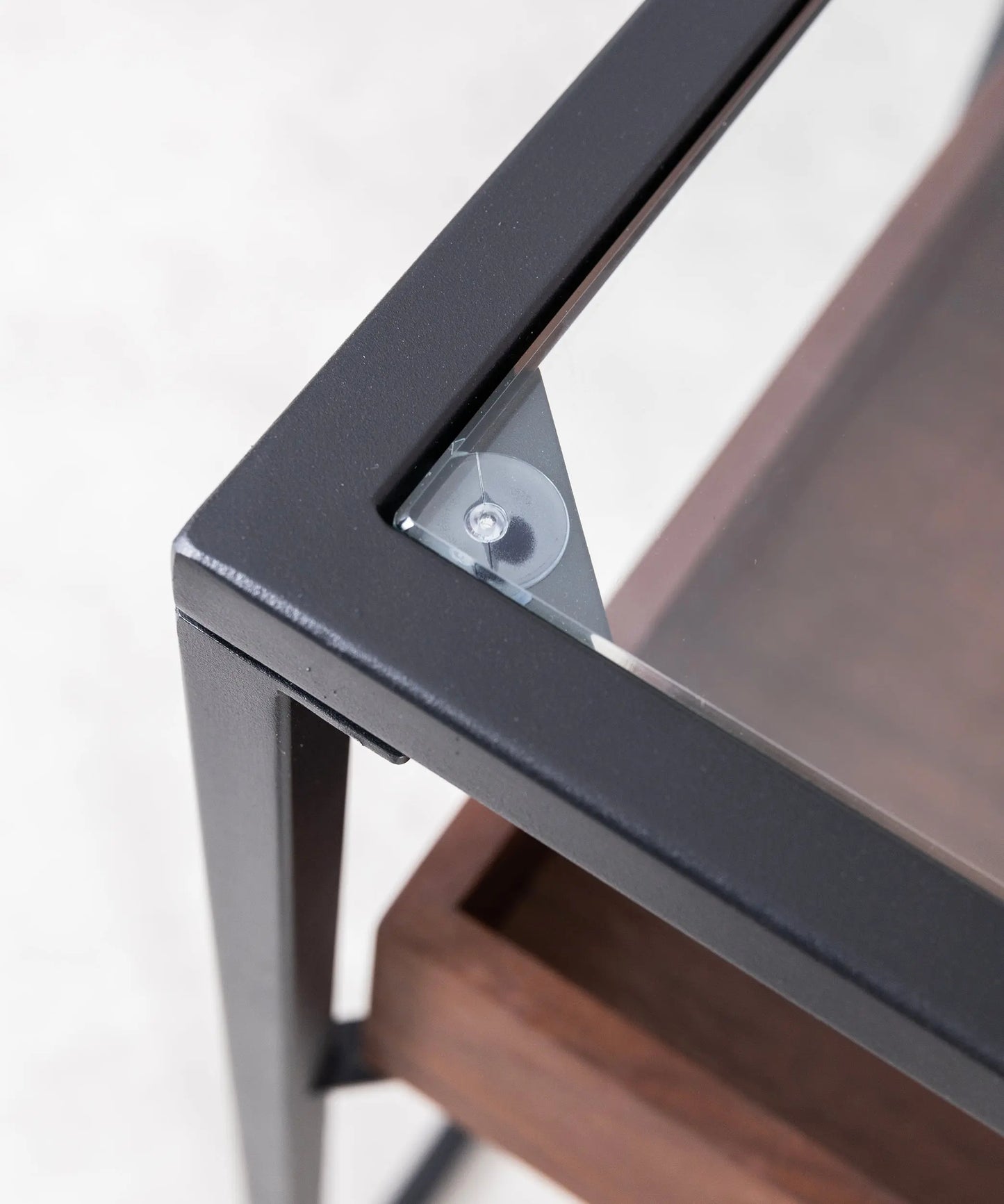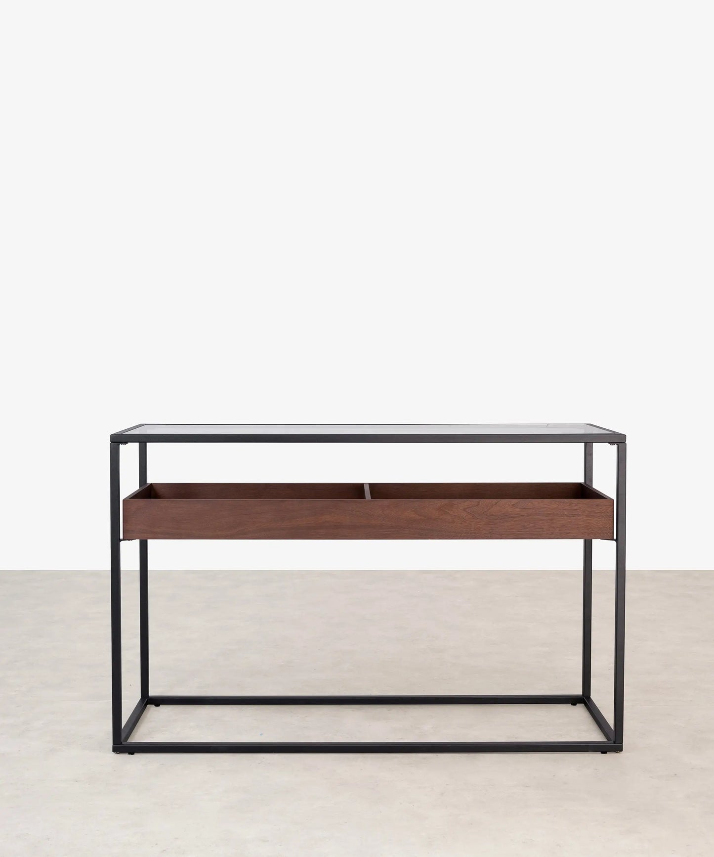 Il est composé d'une structure en fer laqué noir et d'une surface en verre trempé de 10 mm d'épaisseur. Il dispose également d'un plateau en bois de noyer MDF. C'est idéal pour tout organiser !