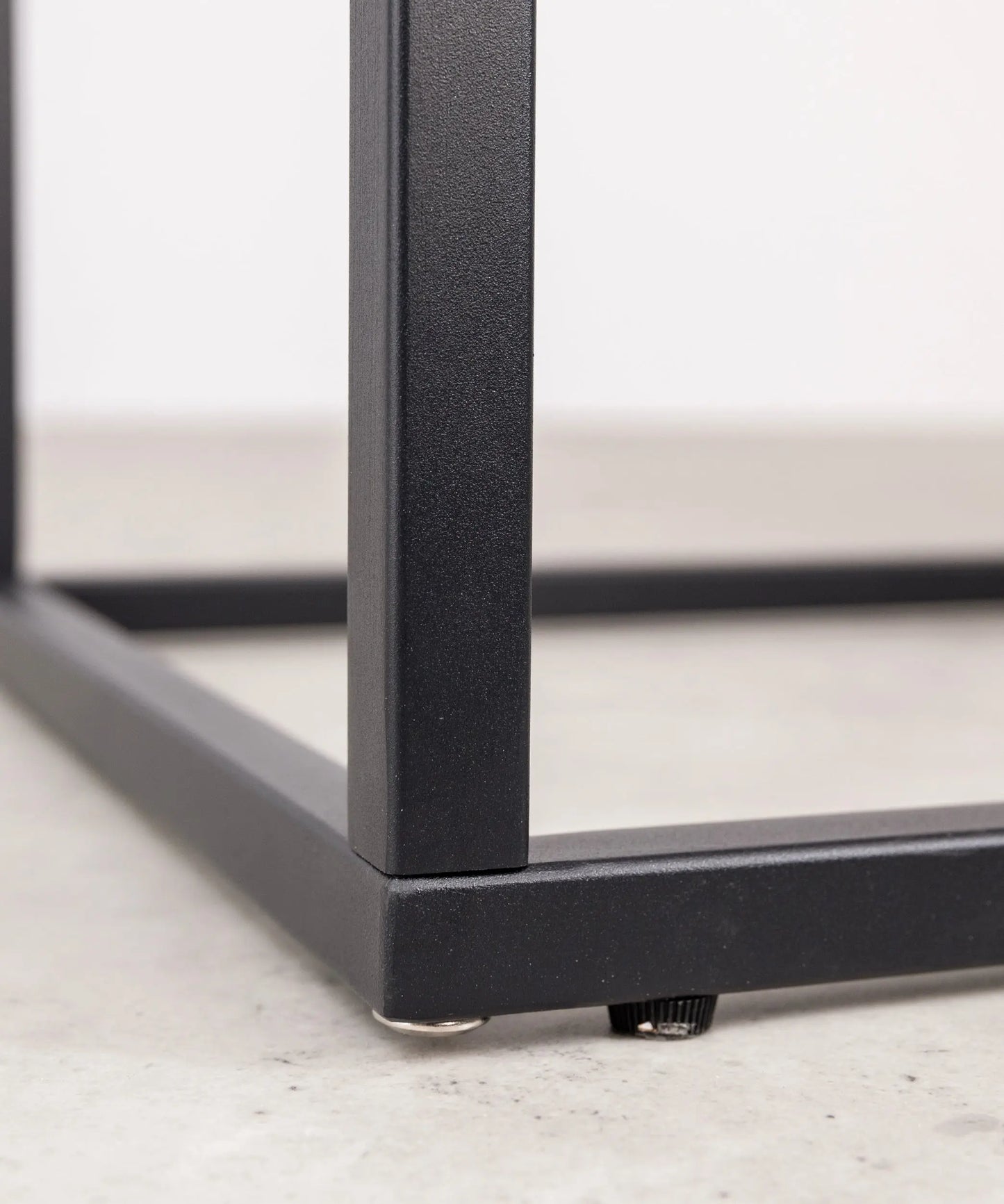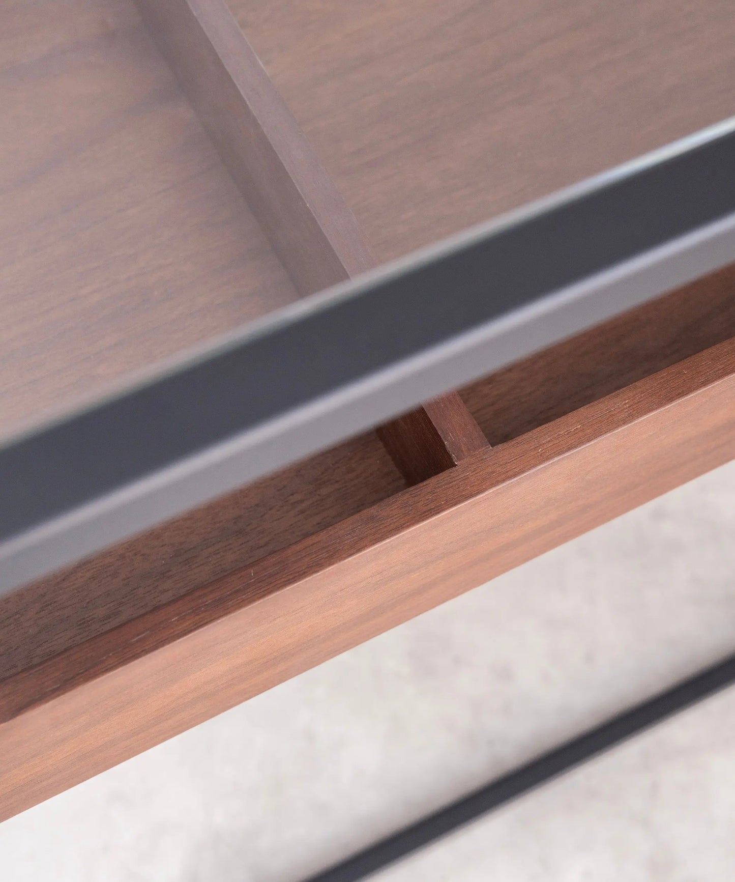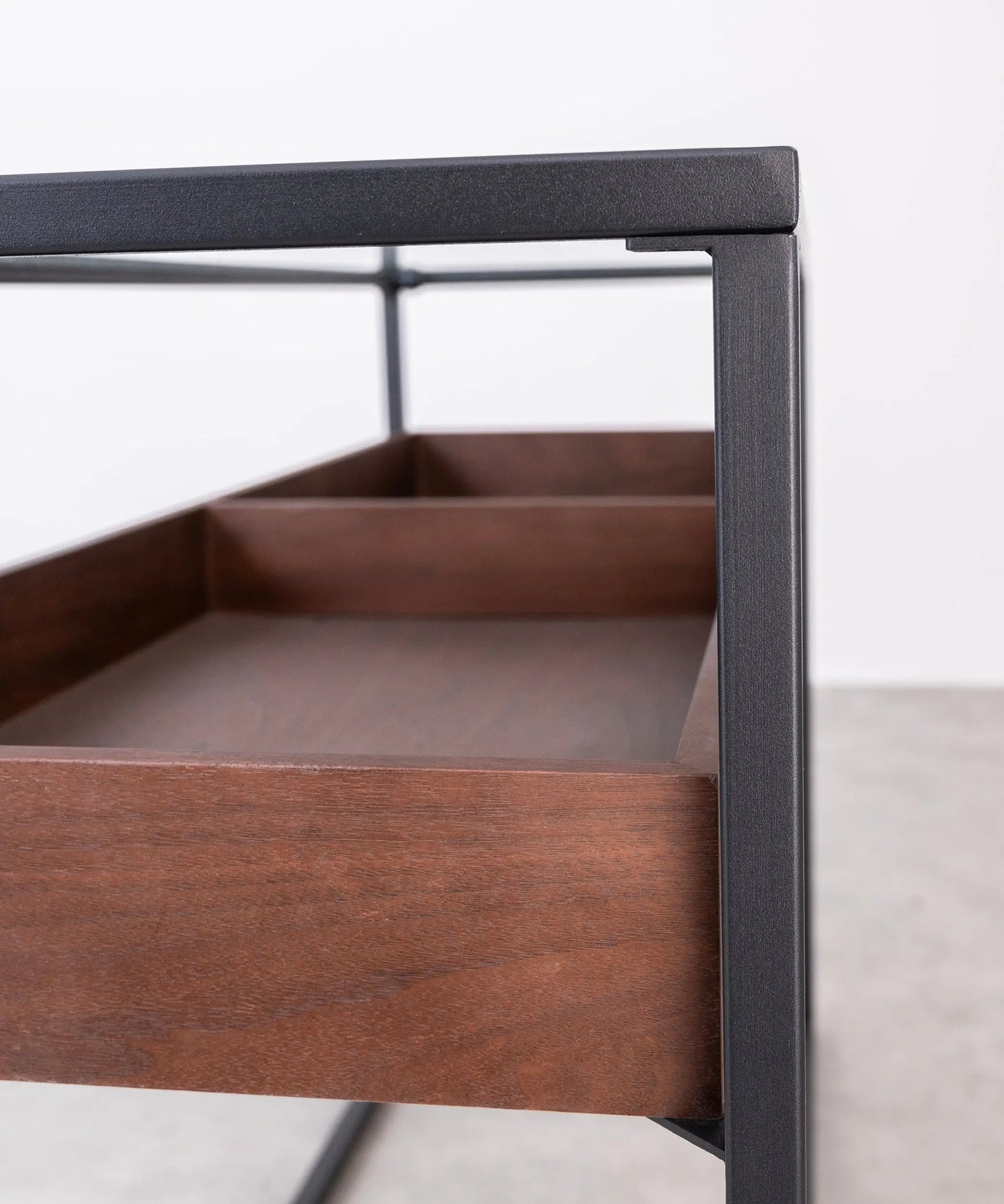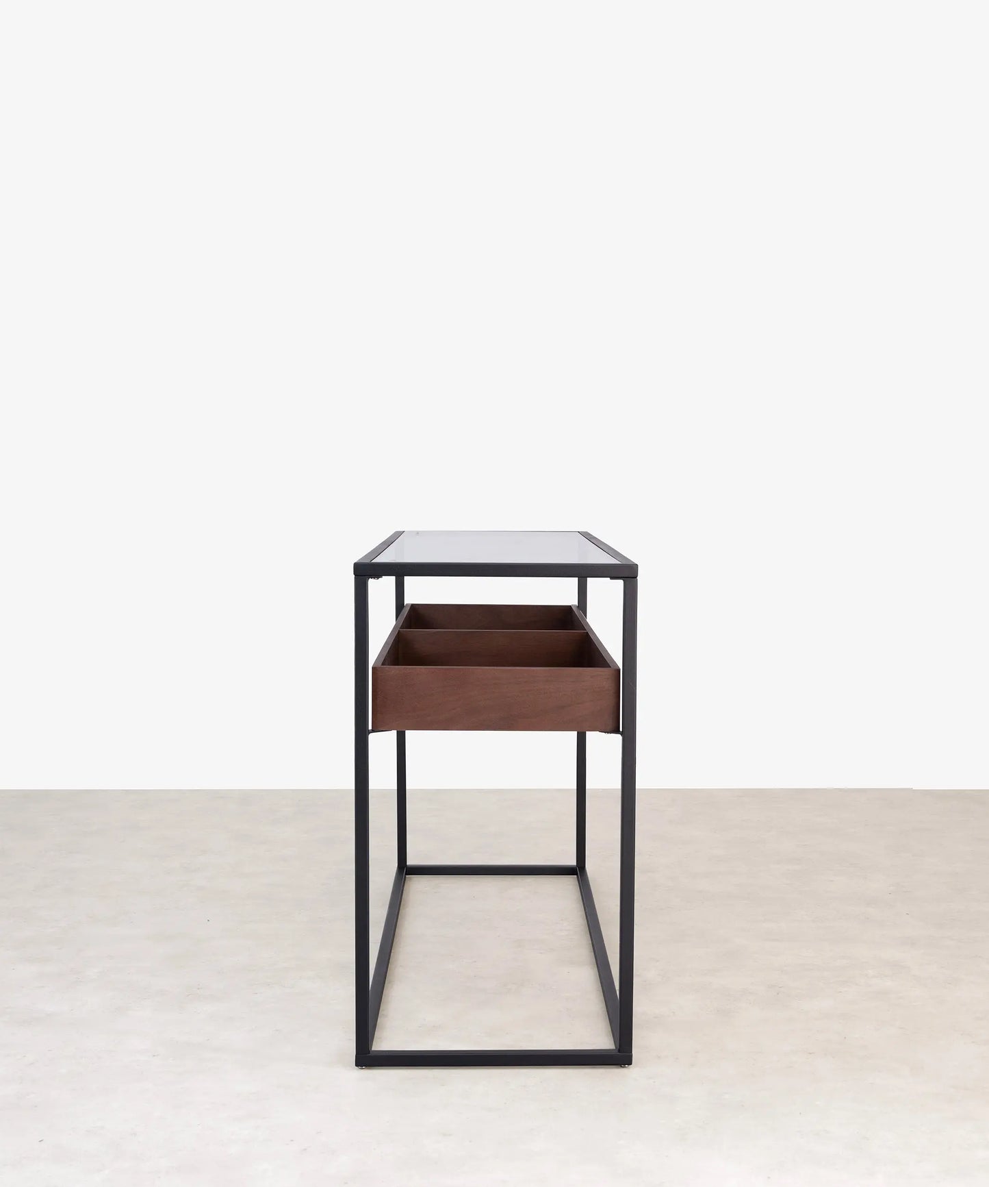 Il est composé d'une structure en fer laqué noir et d'une surface en verre trempé de 10 mm d'épaisseur. Il dispose également d'un plateau en bois de noyer MDF. C'est idéal pour tout organiser !