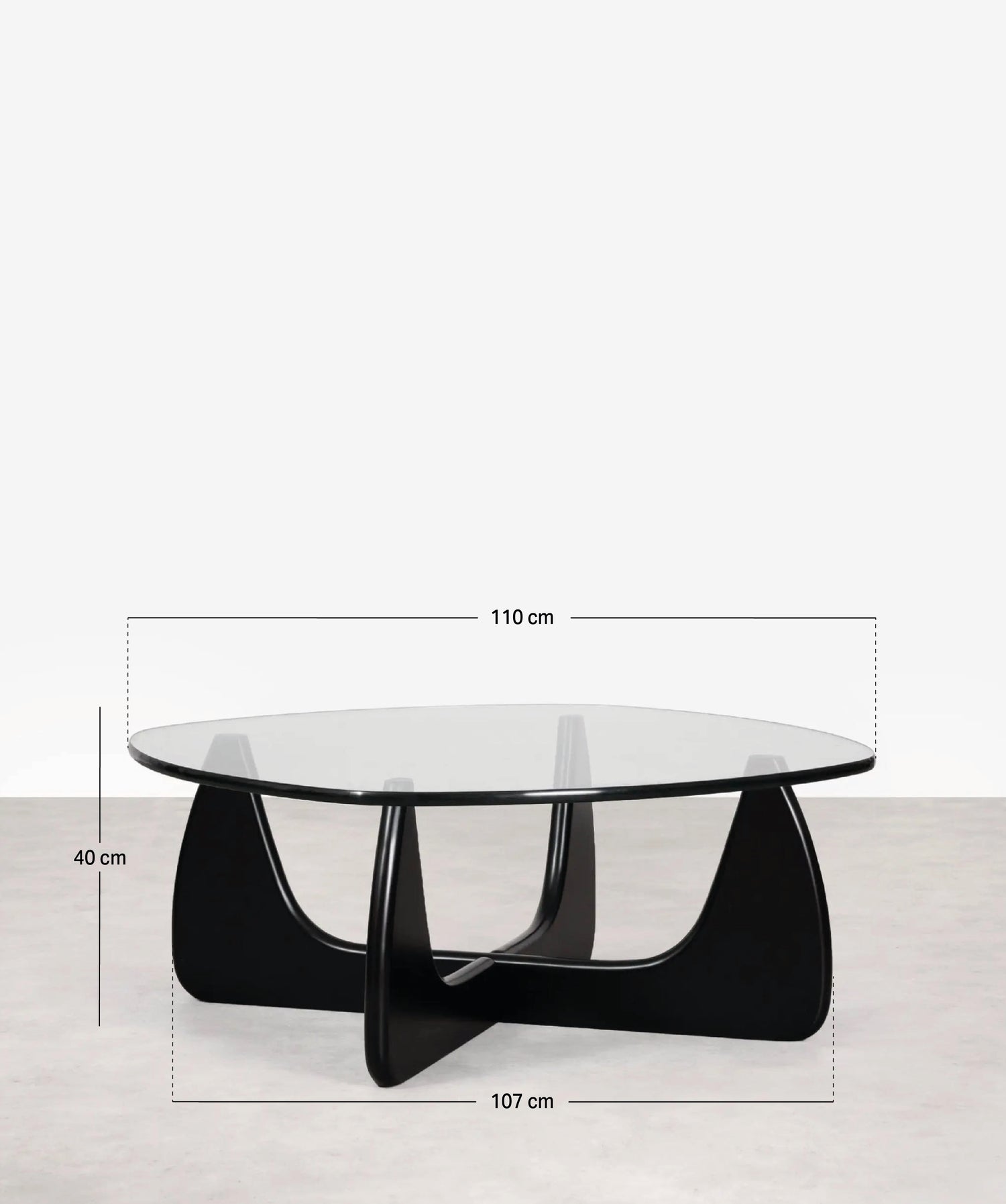 Cette table basse en verre est entièrement fabriquée en verre courbé de 19 mm d'épaisseur, reposant sur deux pieds sculptés en bois massif.