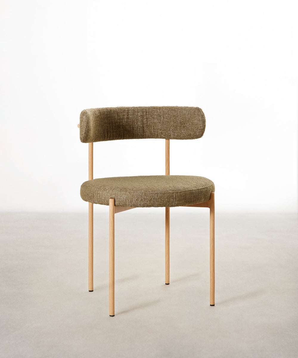 Sa structure en bois offre une base solide et stable. Le dossier incurvé et rembourré se distingue par son esthétique minimaliste et son ergonomie, garantissant un confort maximal pendant l’utilisation.