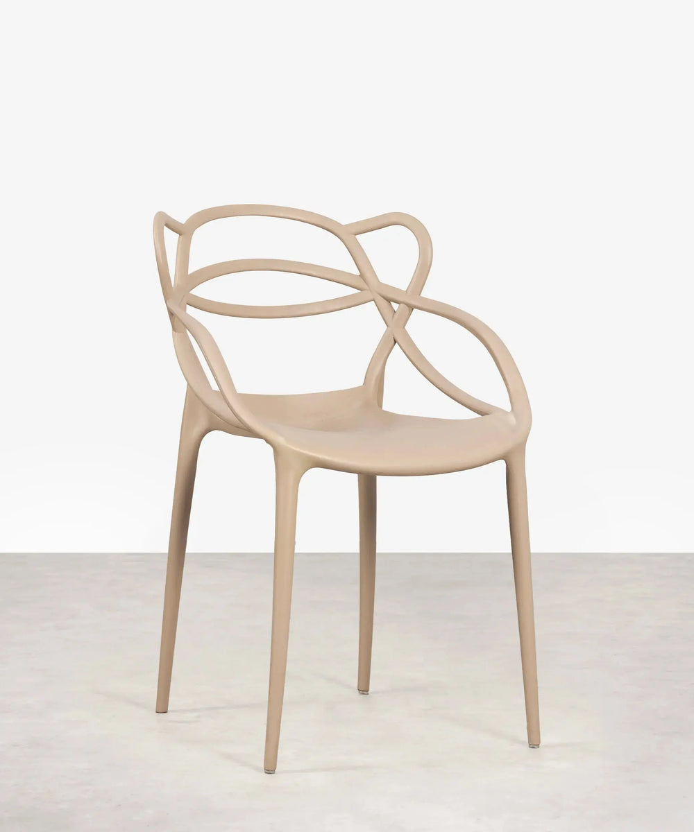 Disponible en différentes couleurs. Le dossier de la chaise présente des lignes courbes qui se croisent, créant des zones vides qui ajoutent une touche distinctive au design. Les accoudoirs se prolongent subtilement vers l'avant, en parfaite harmonie avec le reste de l'ensemble.