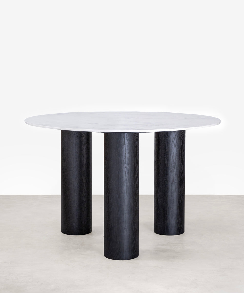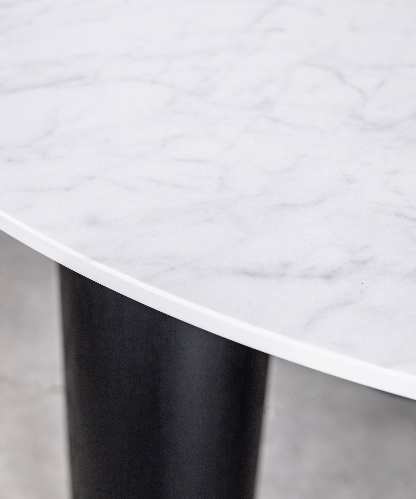 È composto da un piano in marmo bianco con venature naturali, che aggiunge un tocco di lusso ed esclusività. Le sue gambe cilindriche in legno offrono calore e stabilità, creando un contrasto visivo molto accattivante.