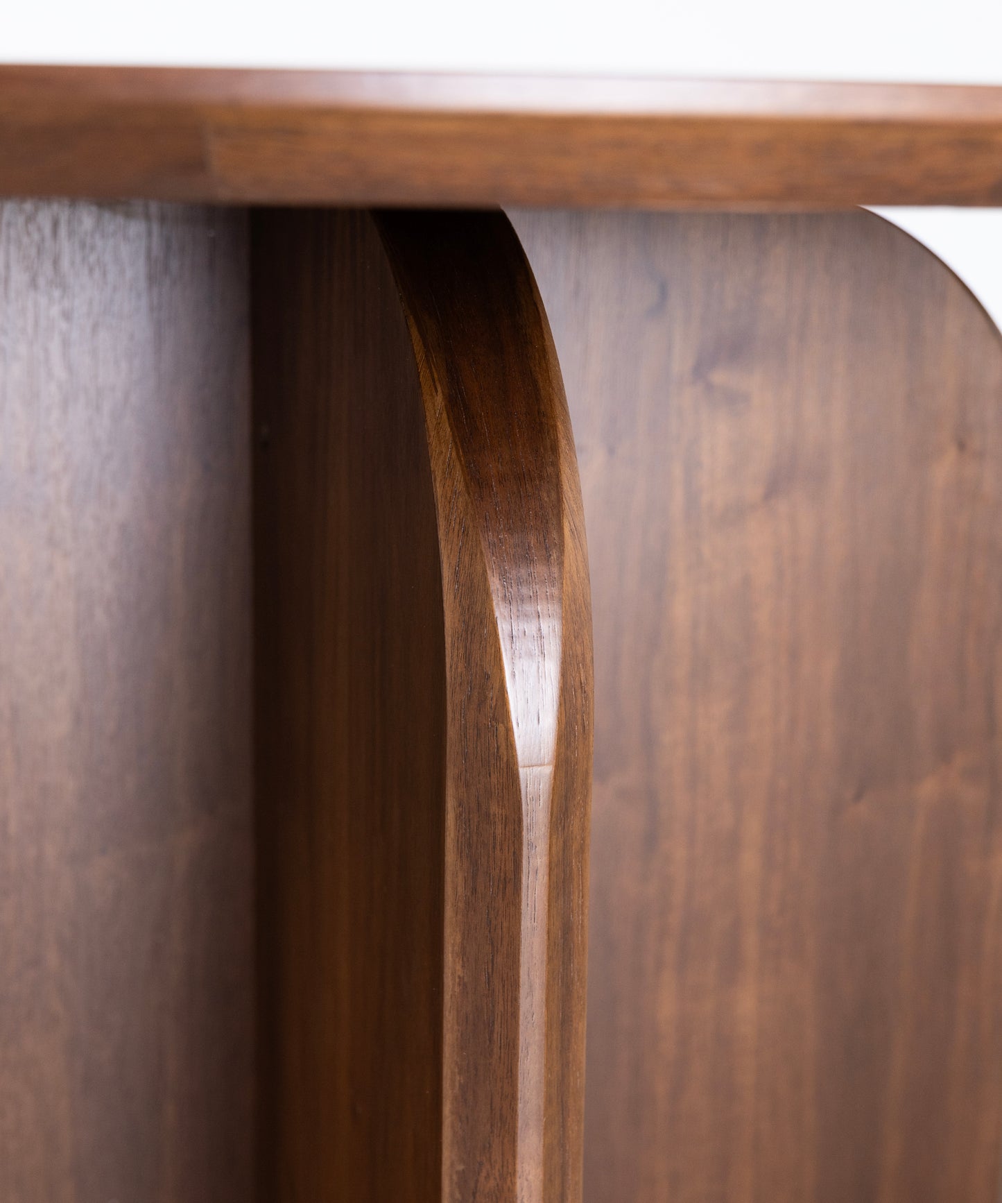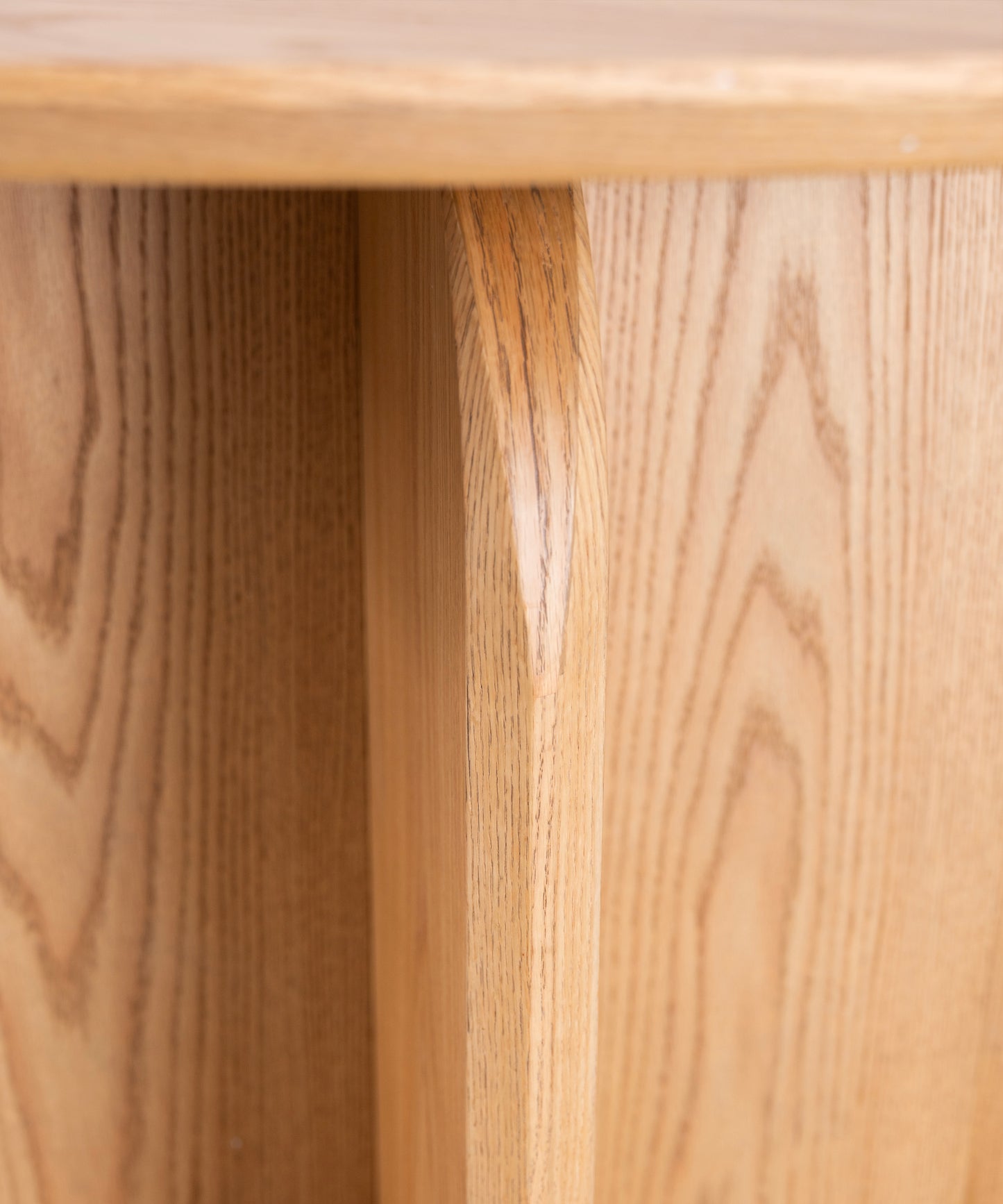 Il piano in legno valorizza la calda venatura, conferendo un tocco sofisticato. La base composta da pannelli curvi e incrociati garantisce stabilità e un carattere unico.