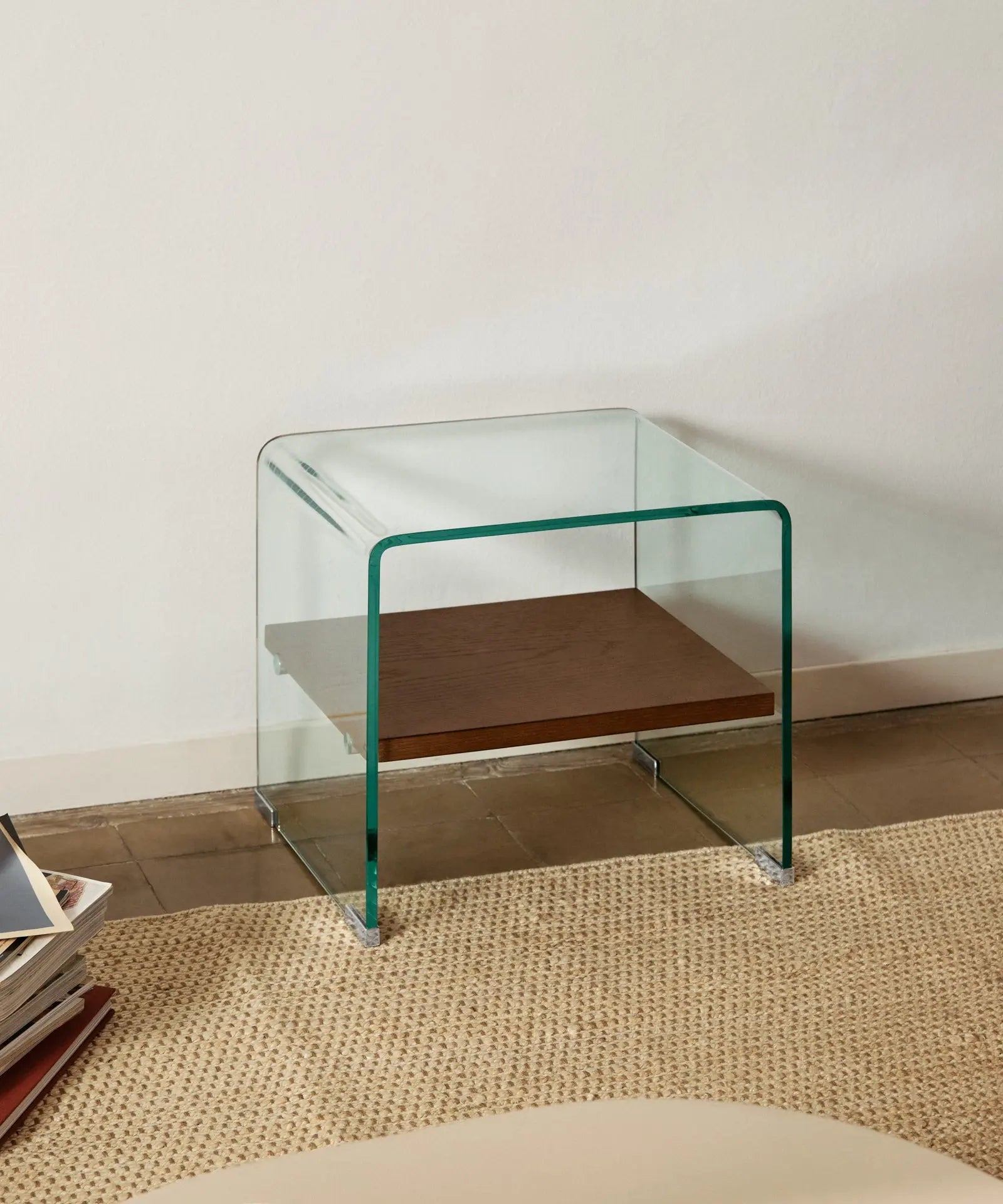 Il tavolino Aris combina vetro temperato e legno di noce in un design pulito e moderno. La sua struttura trasparente conferisce leggerezza visiva, rendendolo facile da integrare in qualsiasi ambiente.