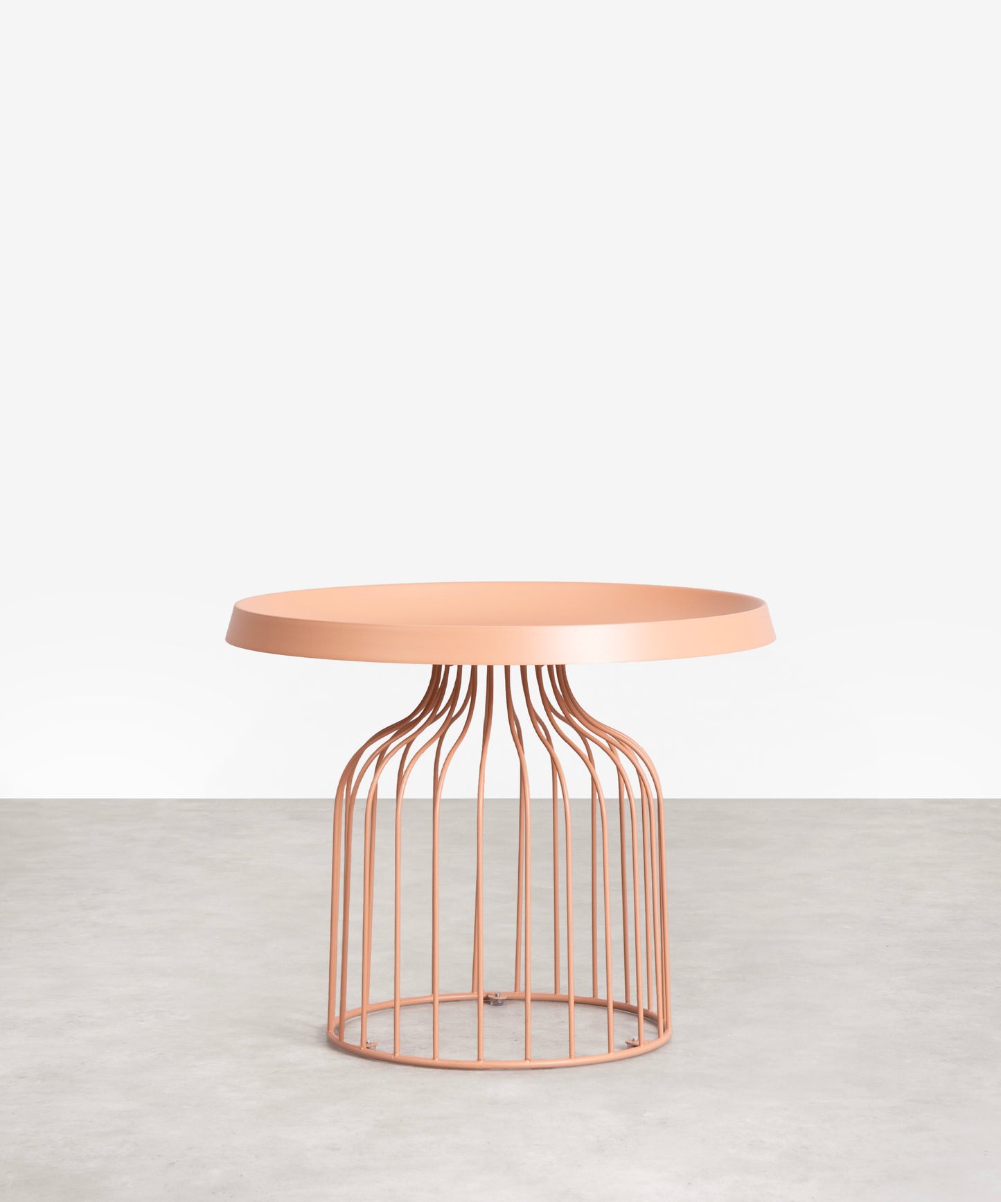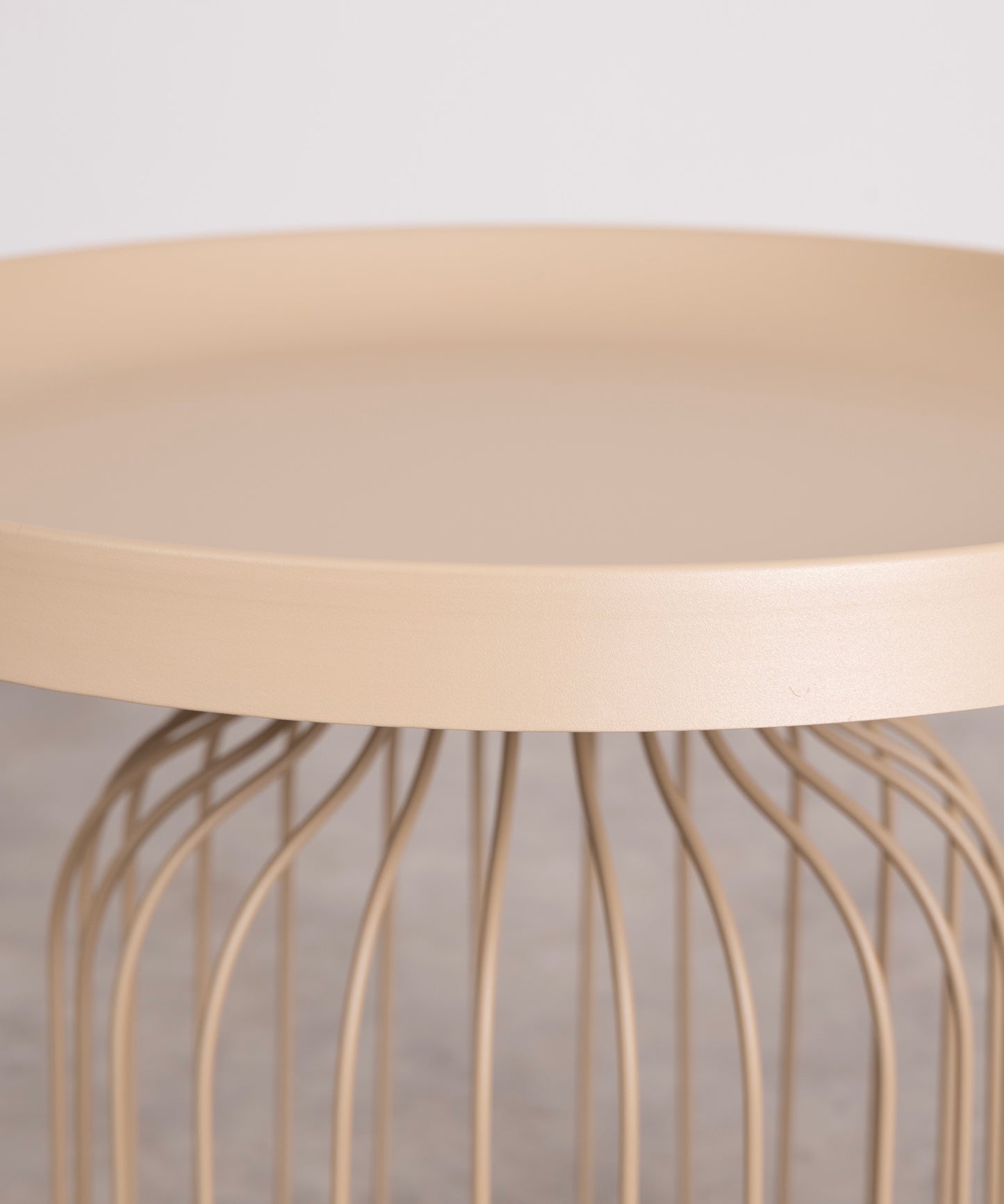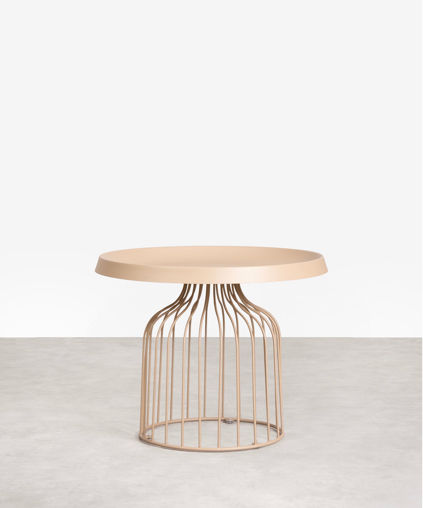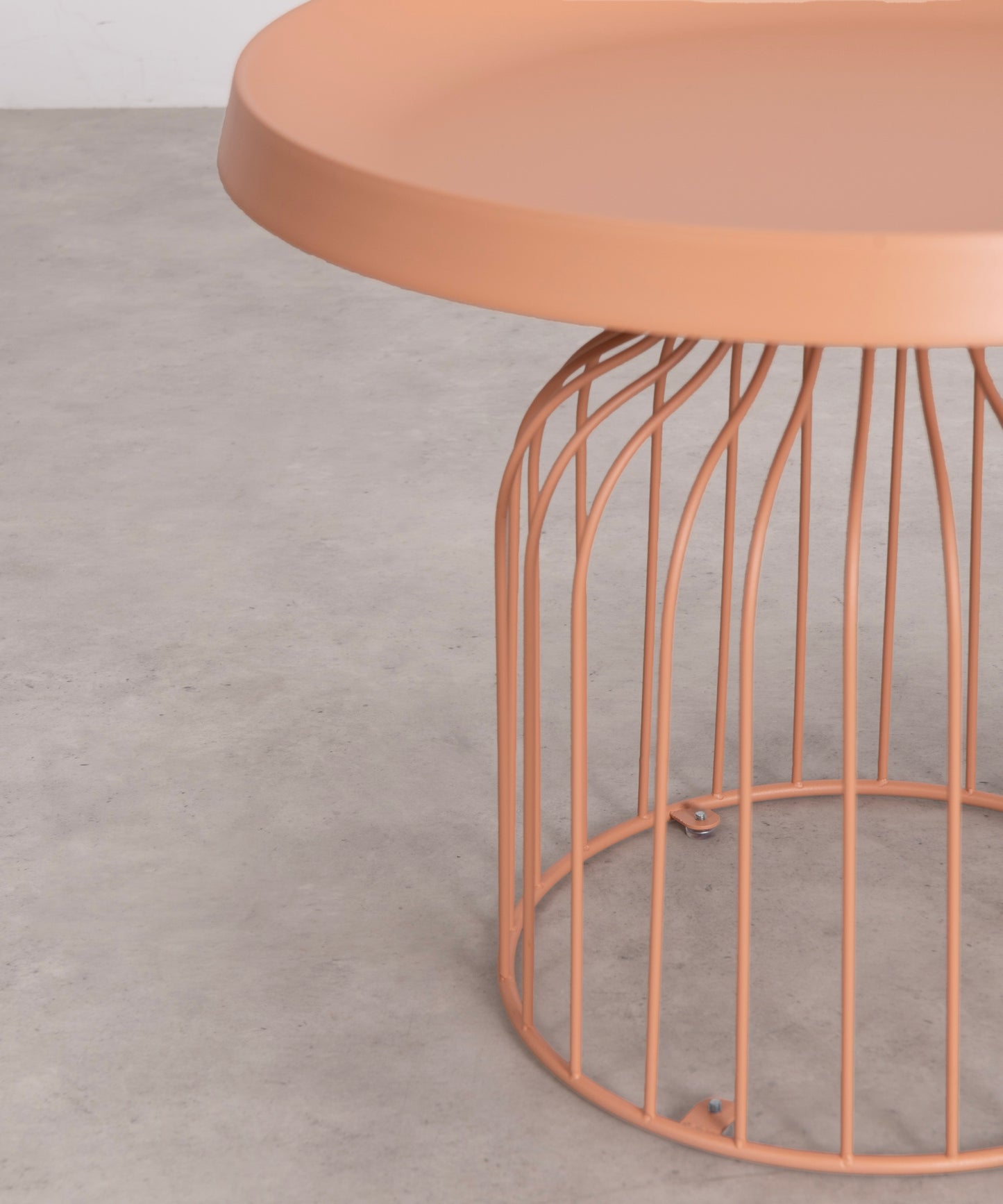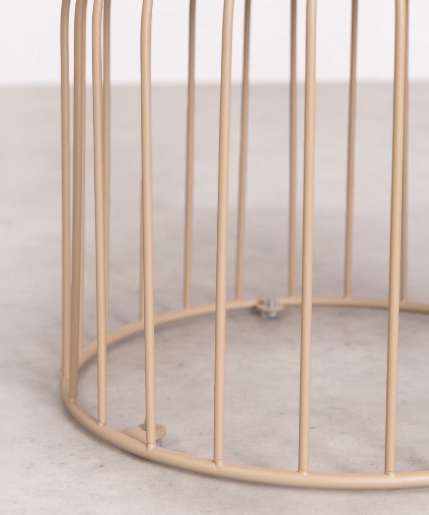 Realizzato in metallo di alta qualità. La sua base è composta da sottili aste metalliche disposte a forma di gabbia, creando una struttura aperta e ariosa. Il piano tondo e minimalista offre una superficie ampia e stabile.