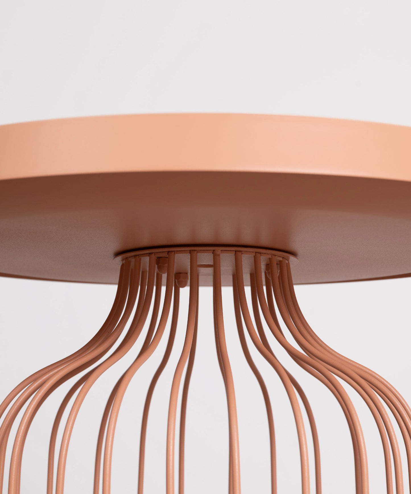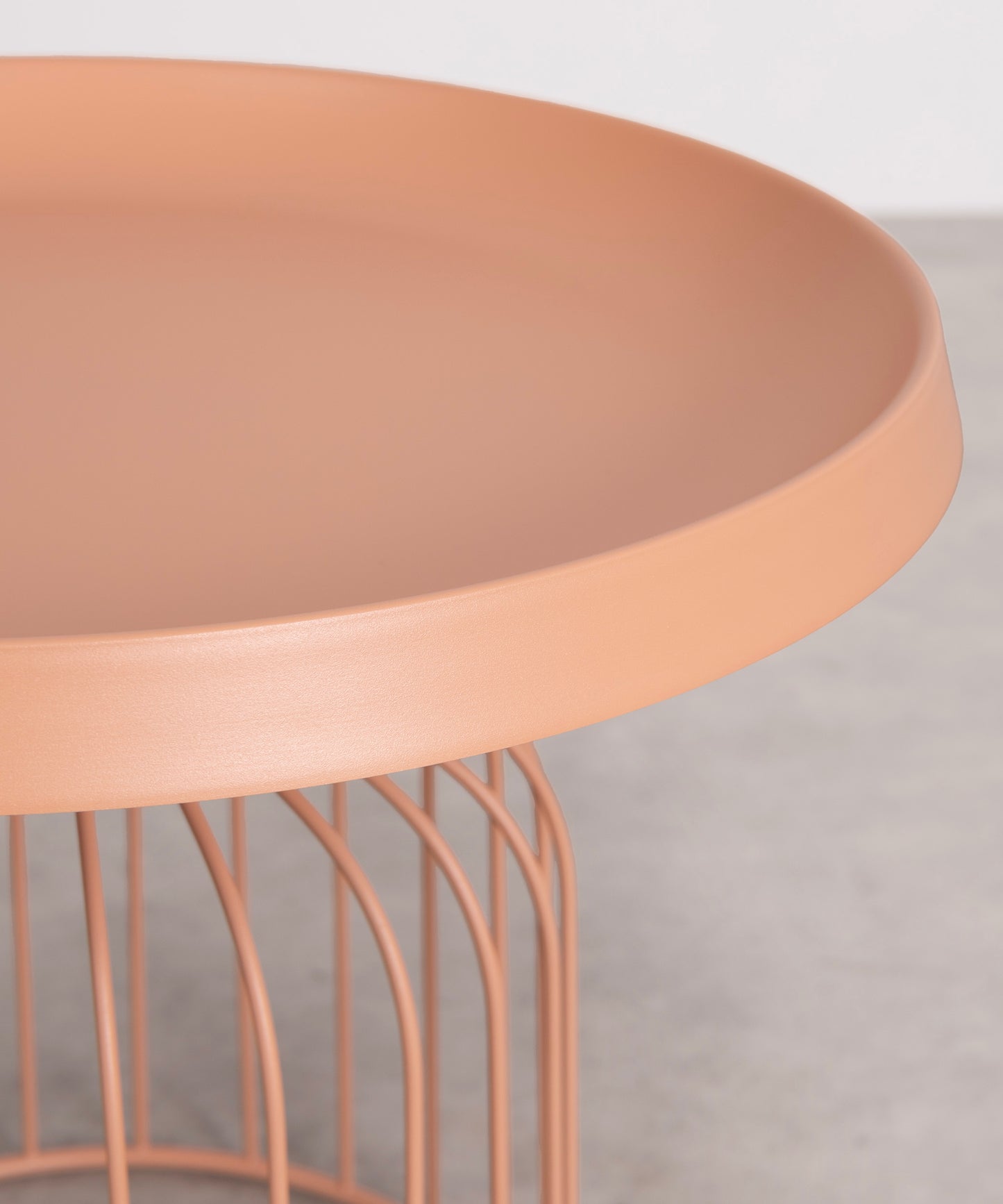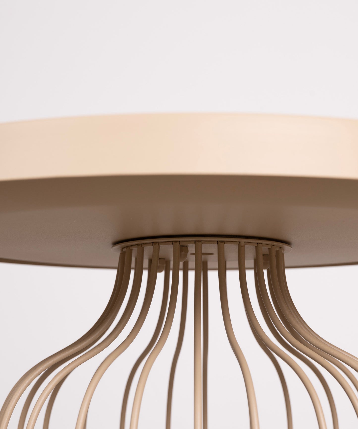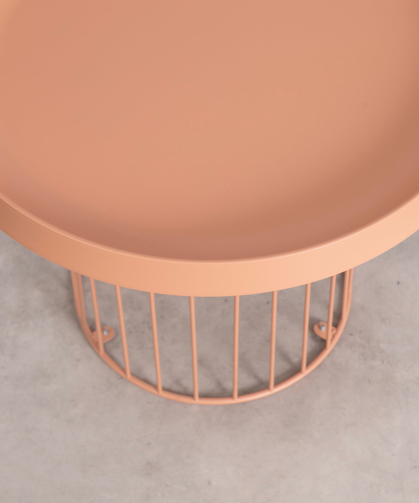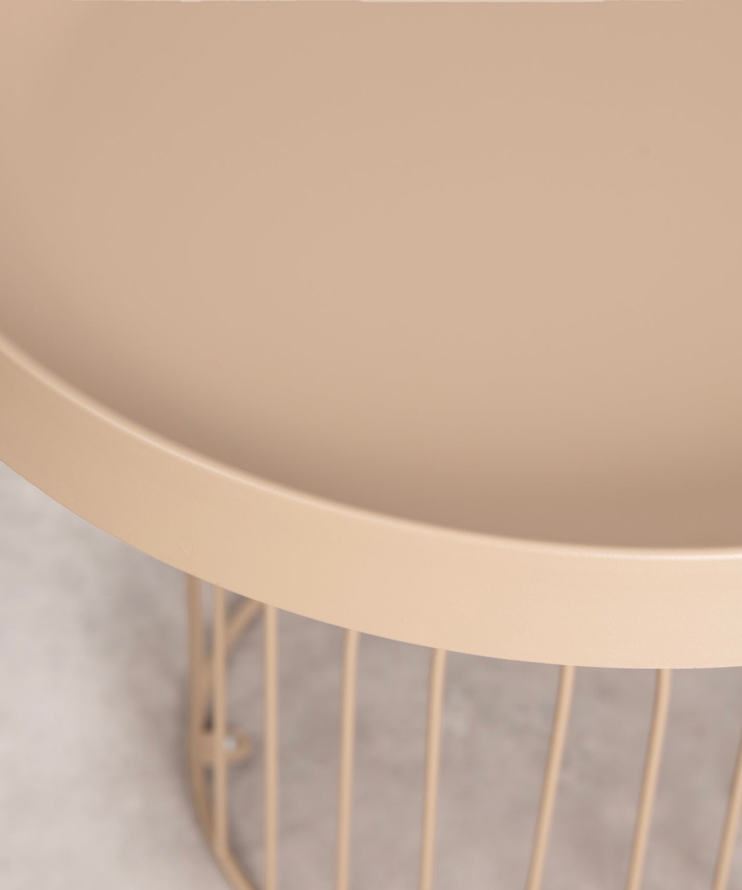Realizzato in metallo di alta qualità. La sua base è composta da sottili aste metalliche disposte a forma di gabbia, creando una struttura aperta e ariosa. Il piano tondo e minimalista offre una superficie ampia e stabile.