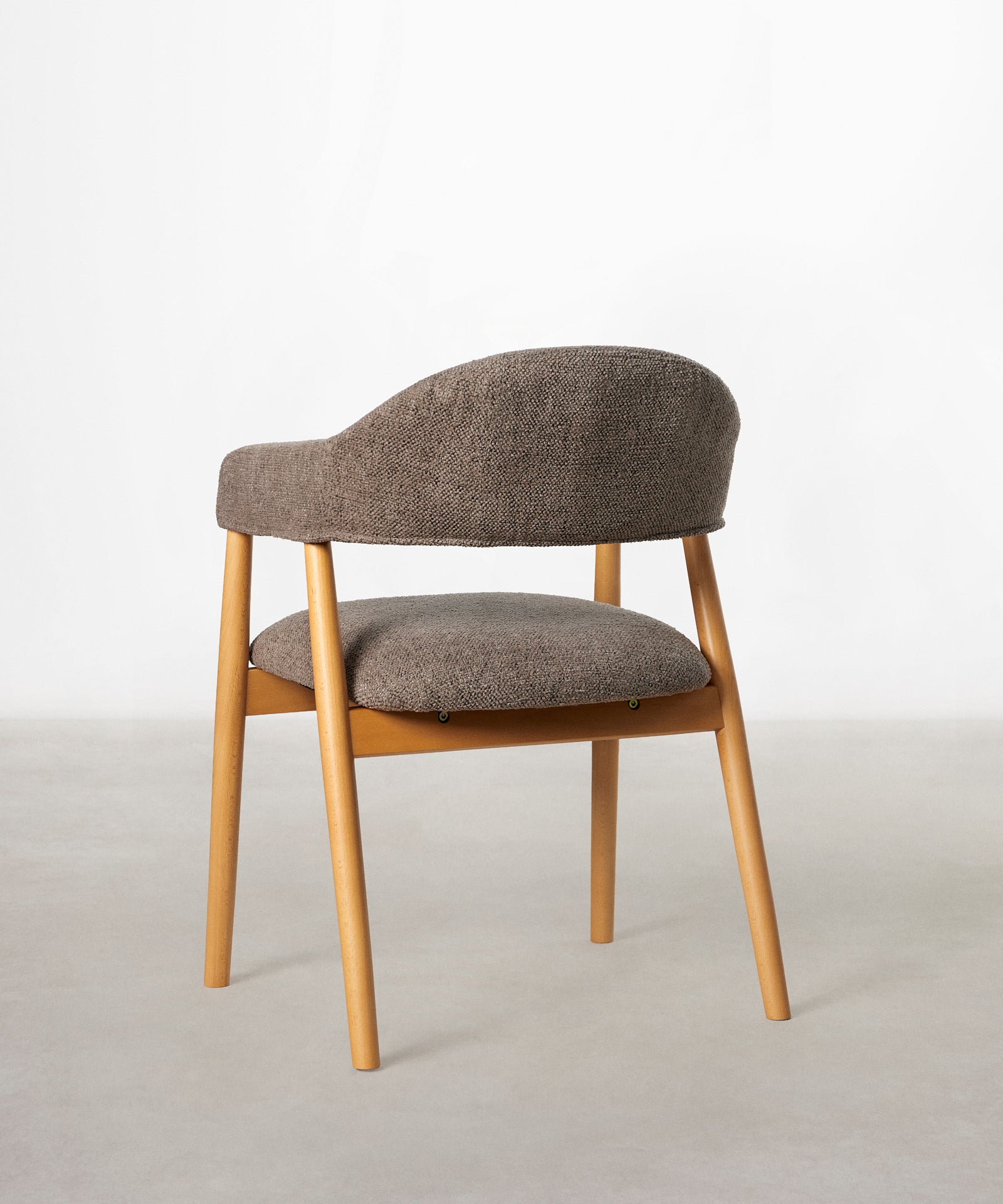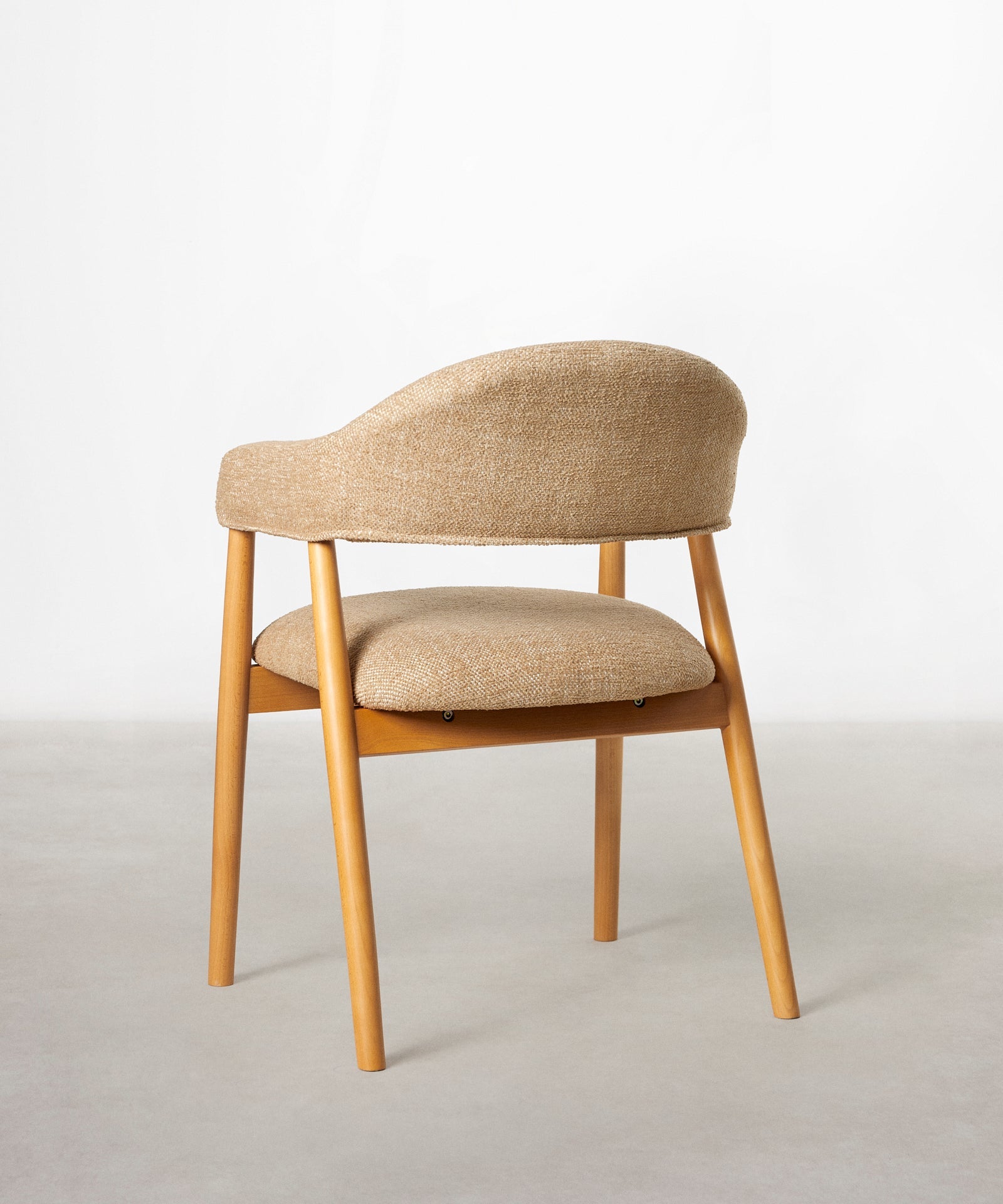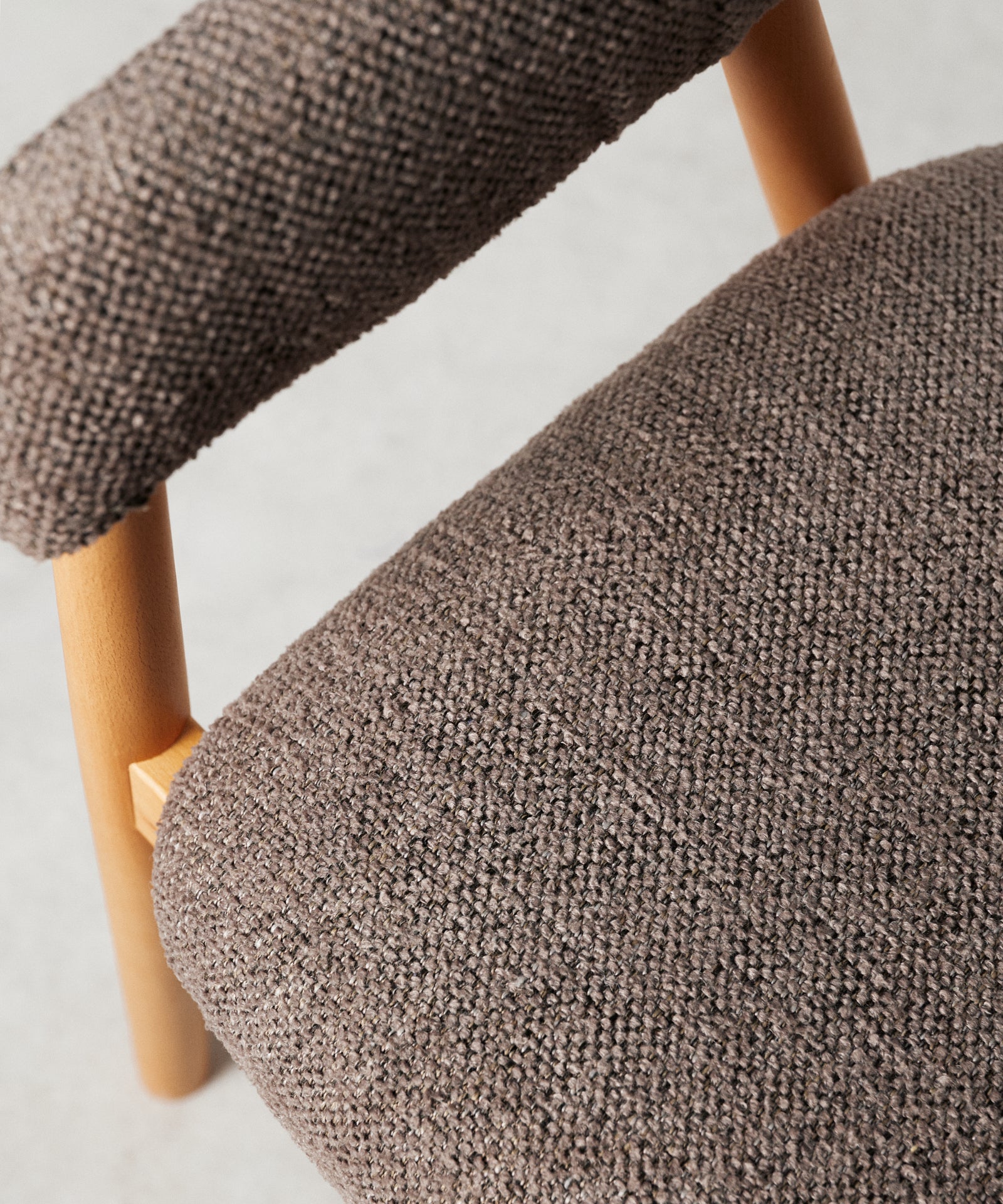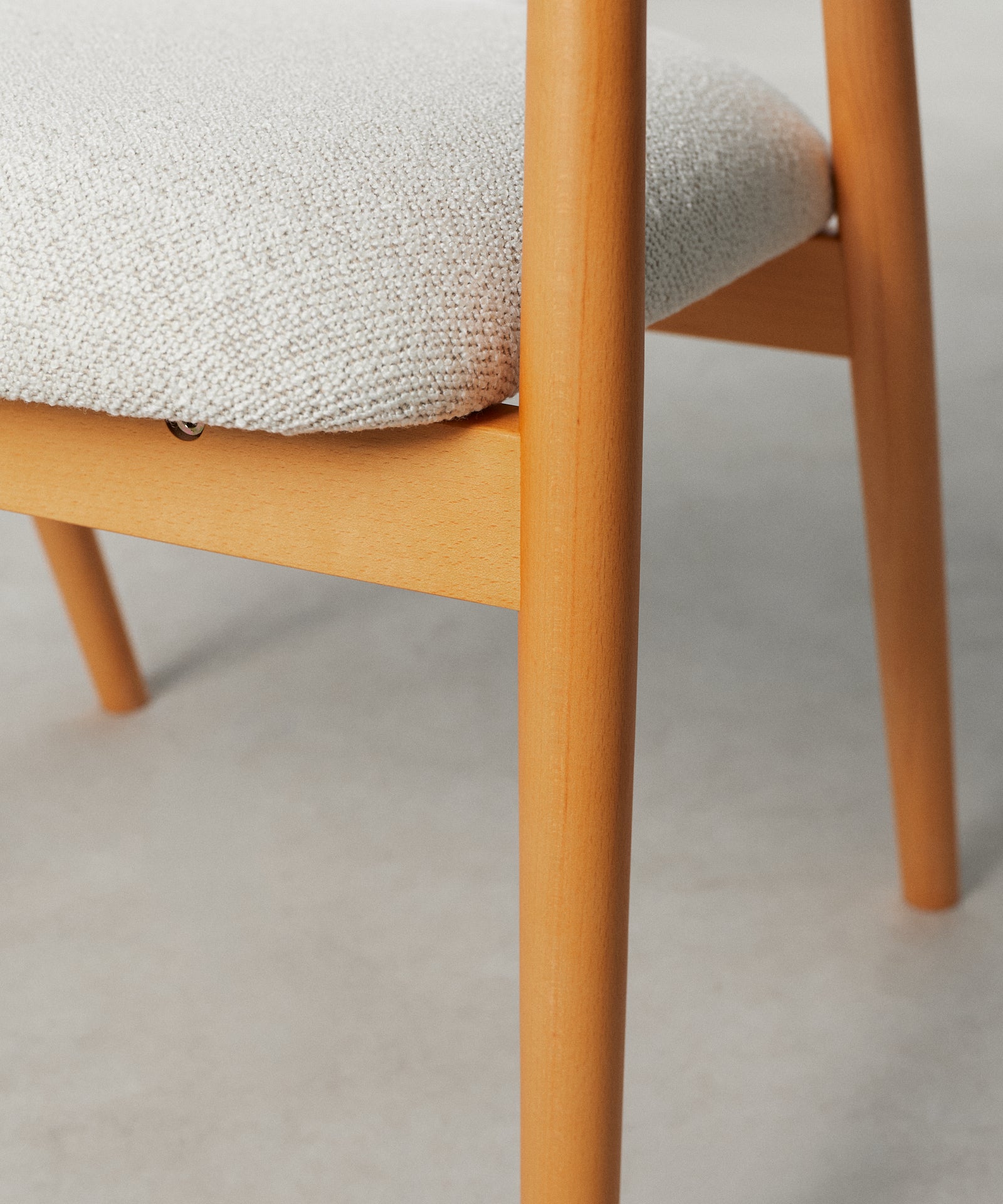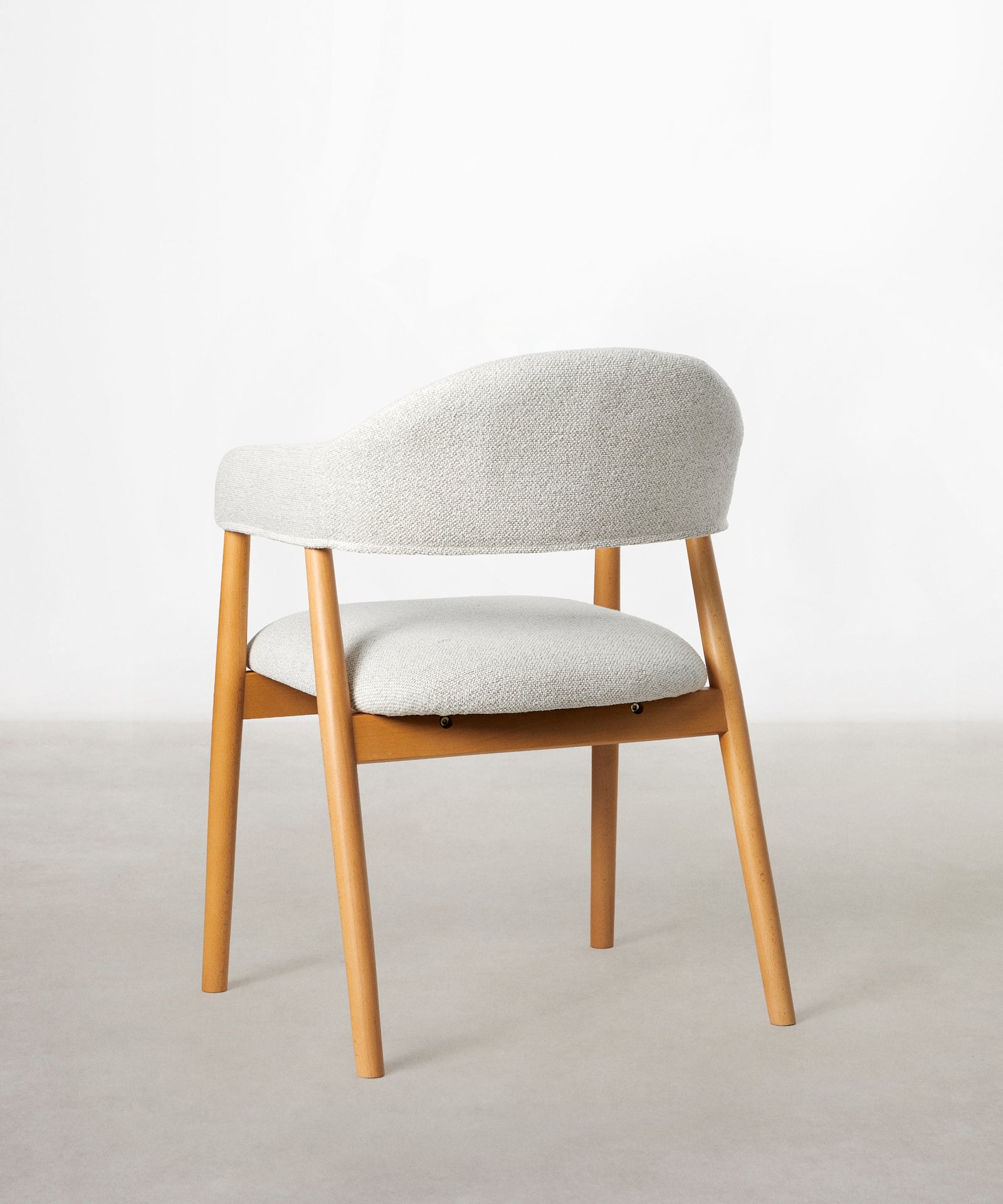 È composta da uno schienale curvato e rivestito in tessuto morbido che offre comfort e stile. La sua struttura in legno massello di faggio è caratterizzata da linee pulite e robuste.