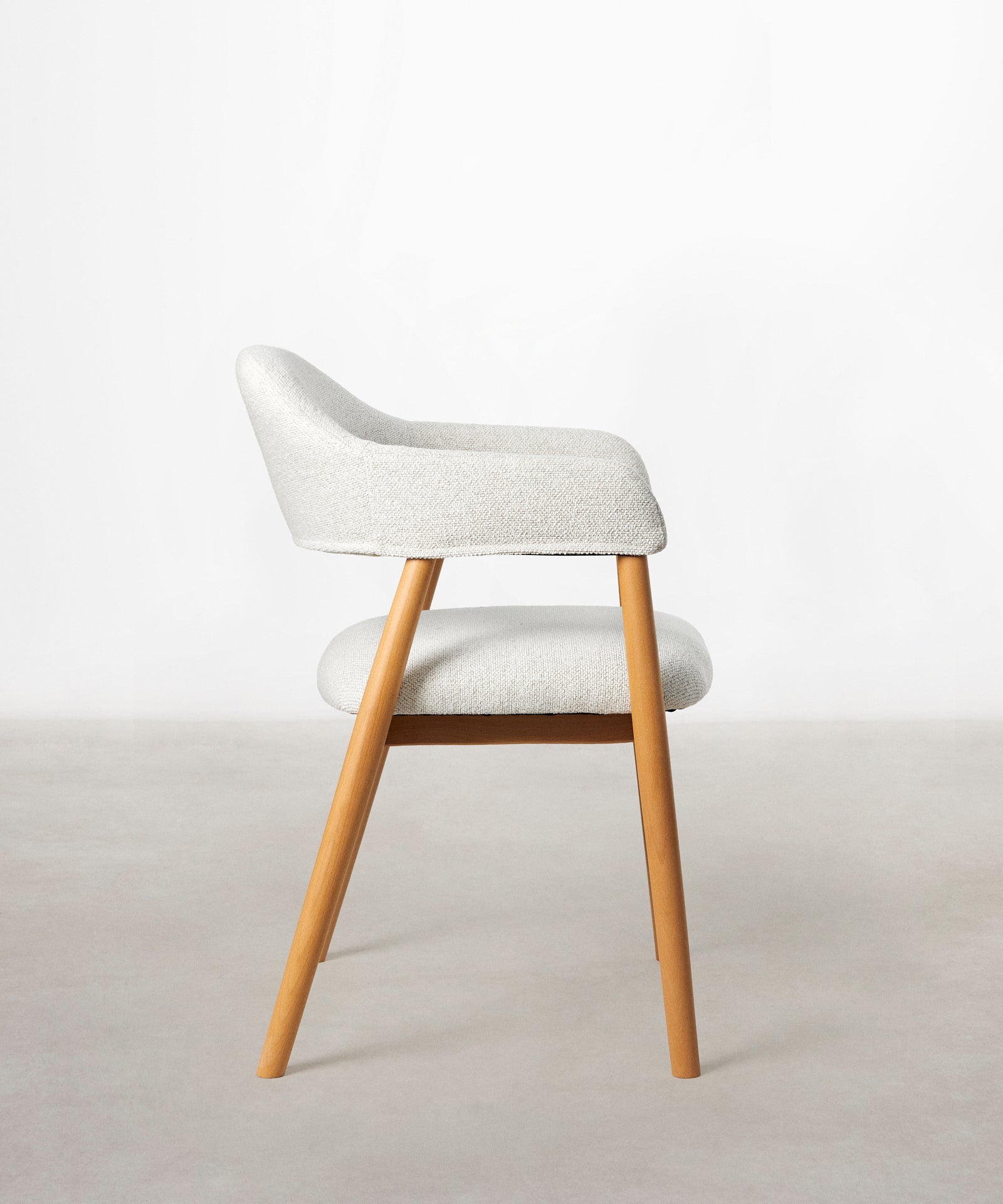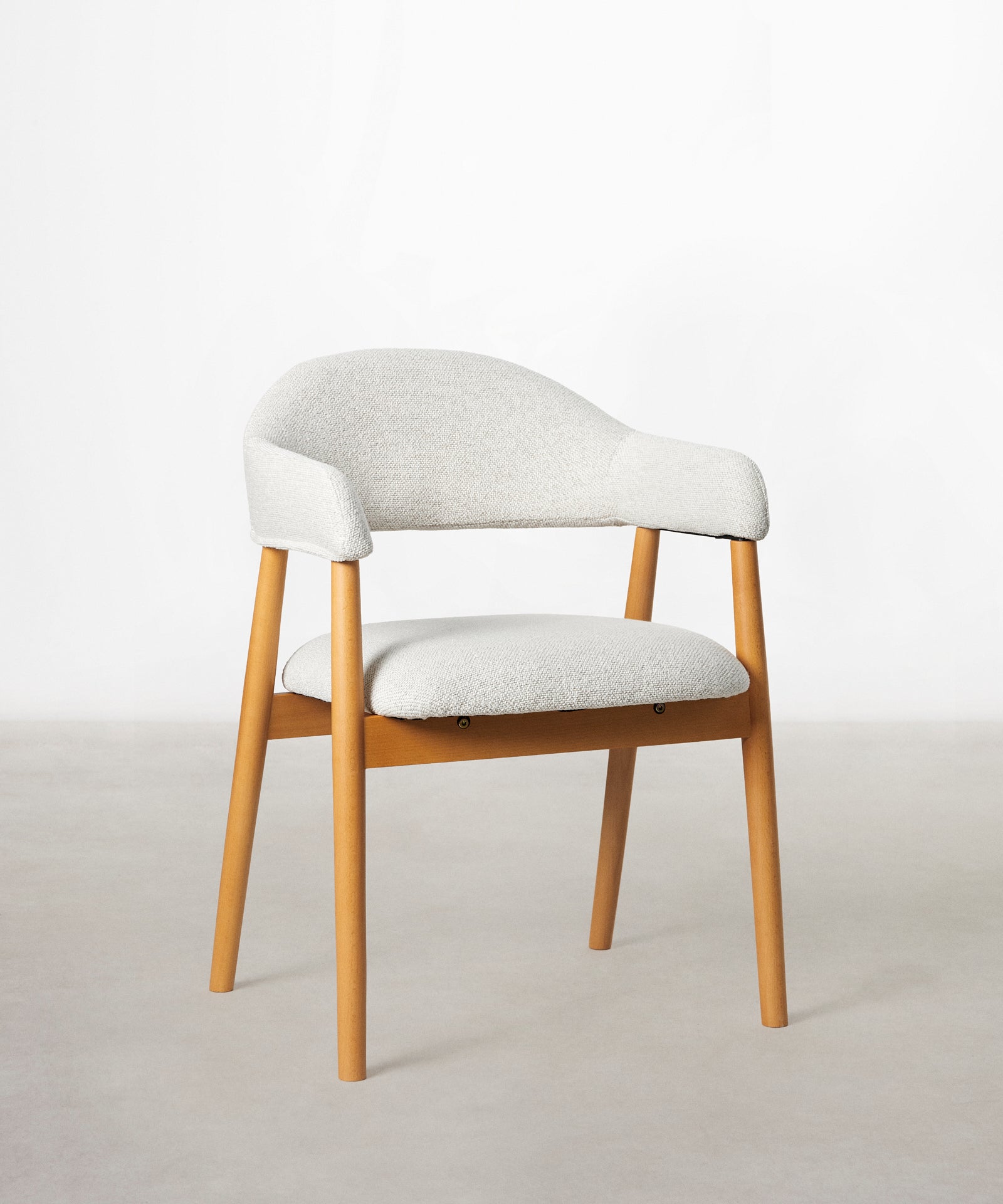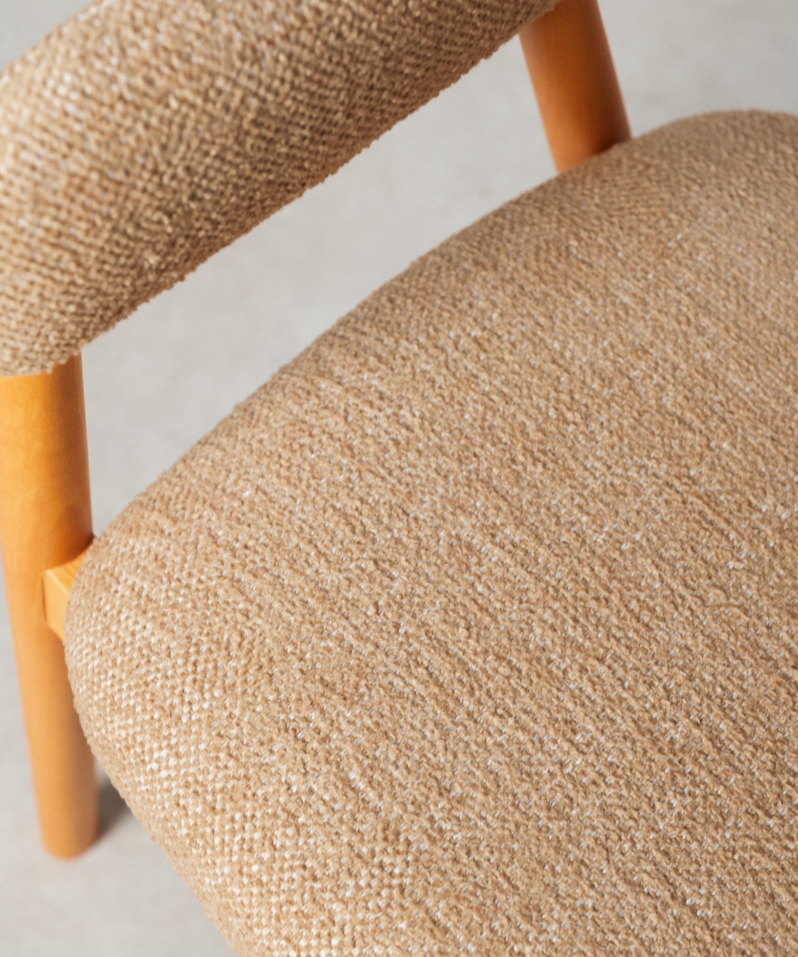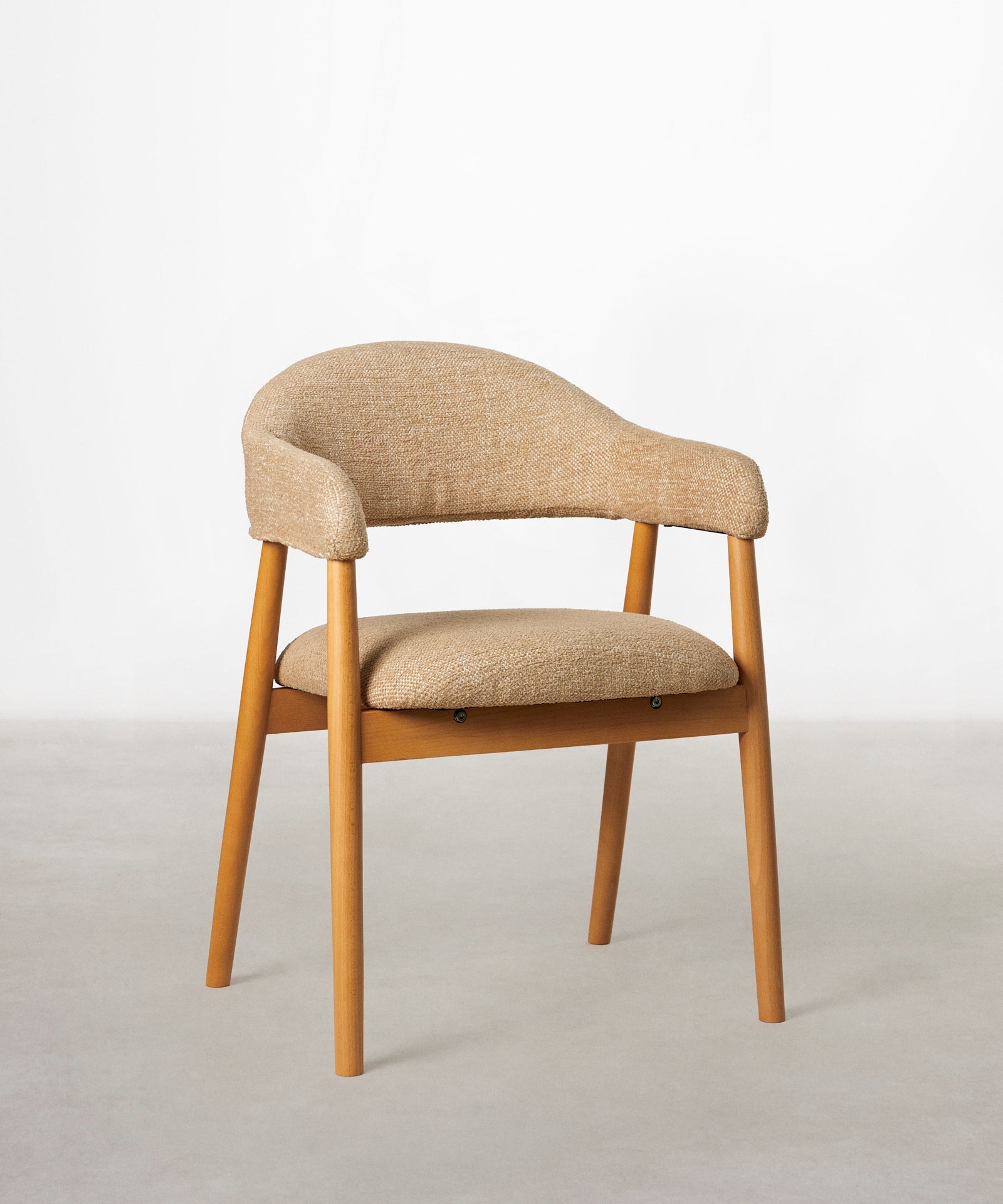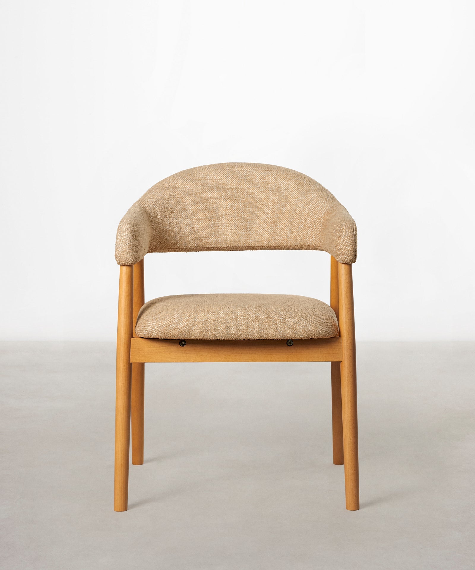 È composta da uno schienale curvato e rivestito in tessuto morbido che offre comfort e stile. La sua struttura in legno massello di faggio è caratterizzata da linee pulite e robuste.