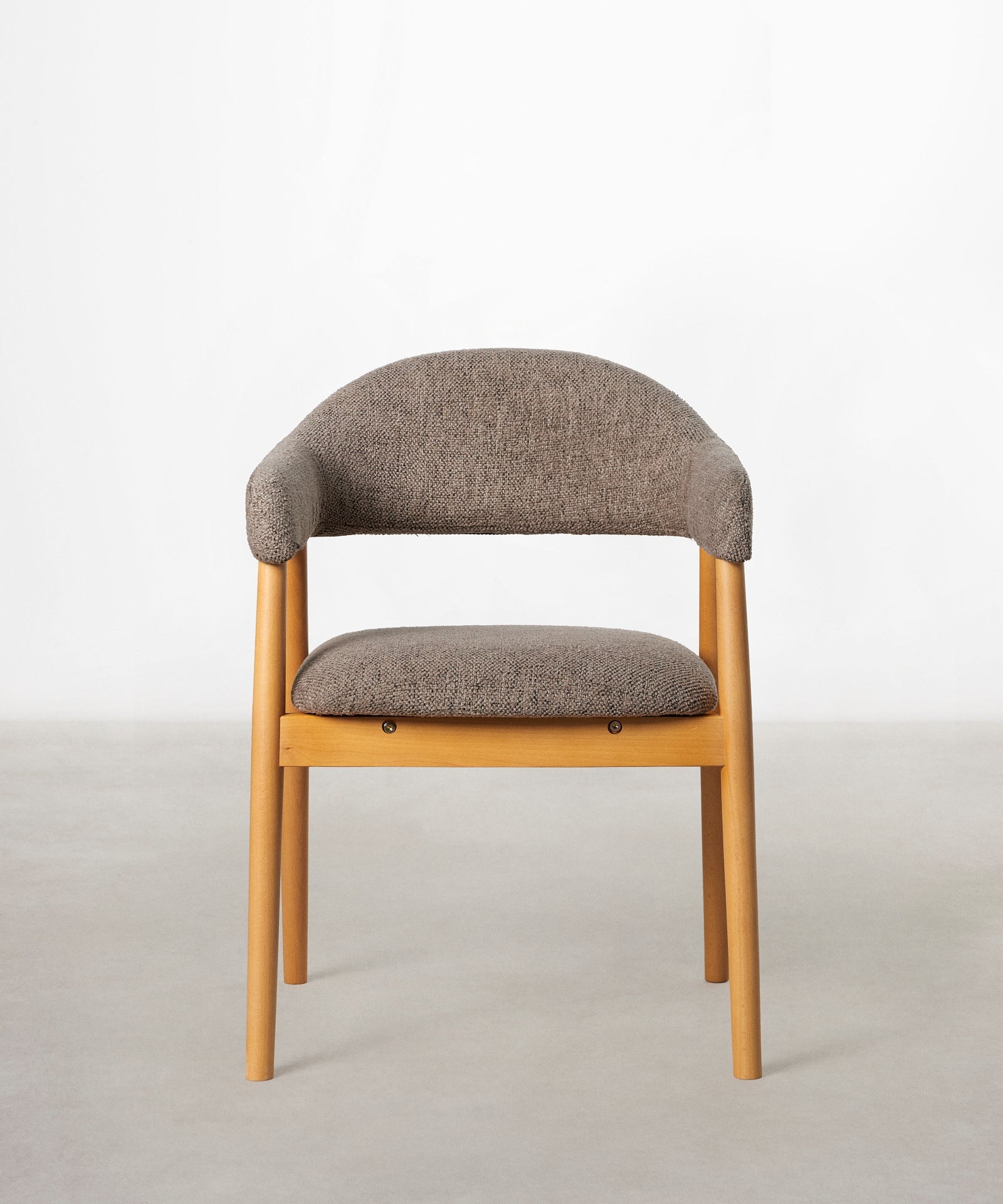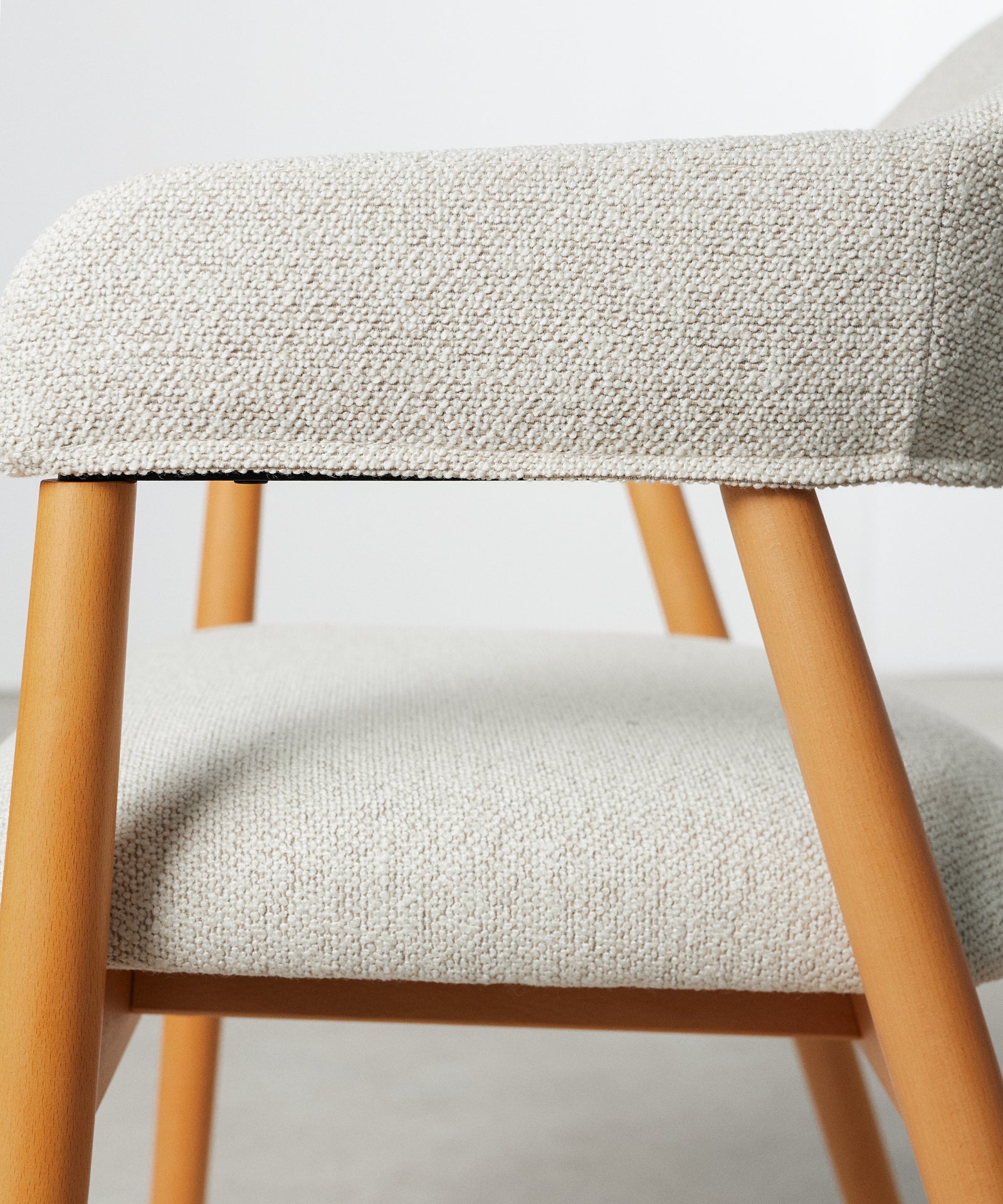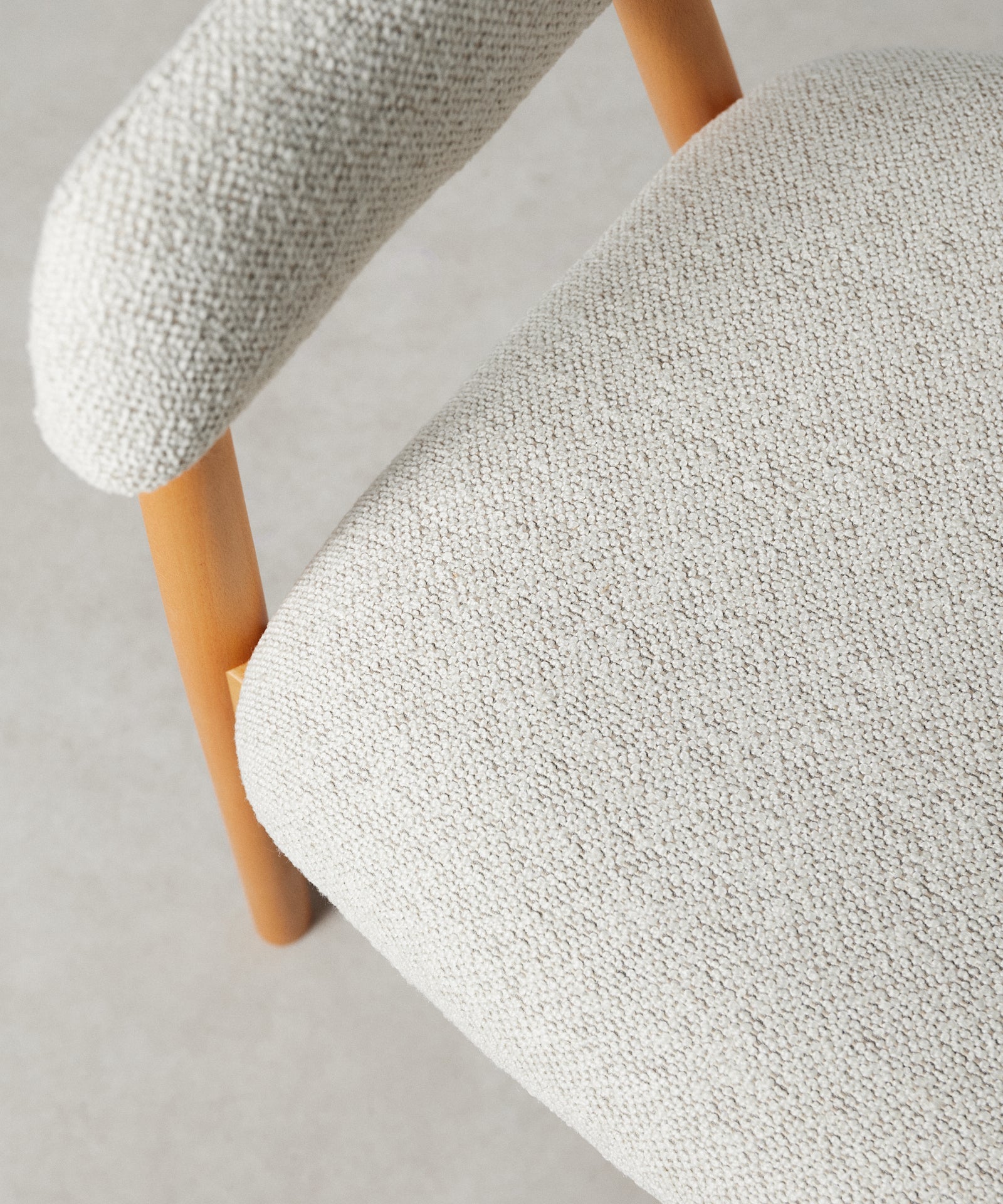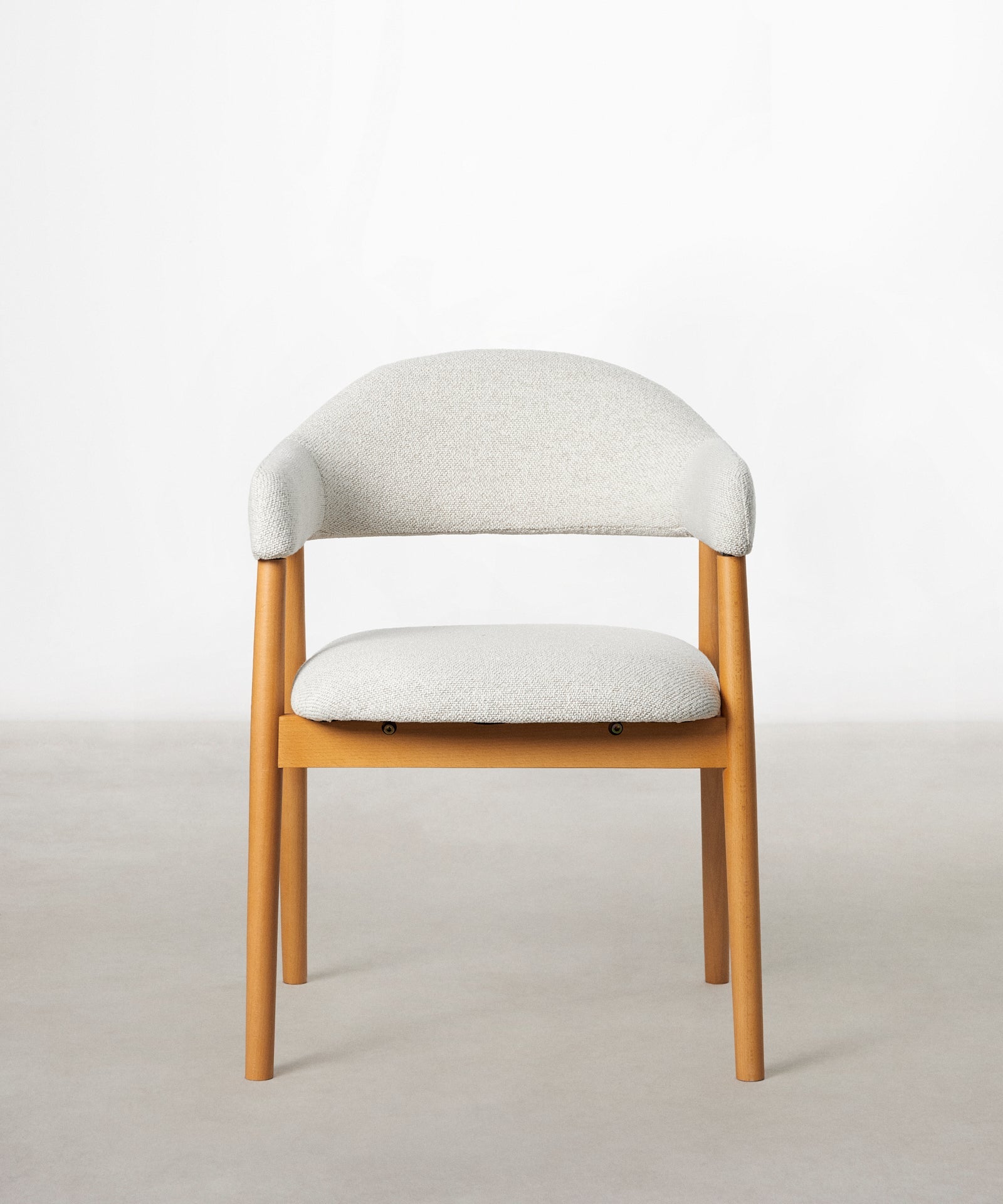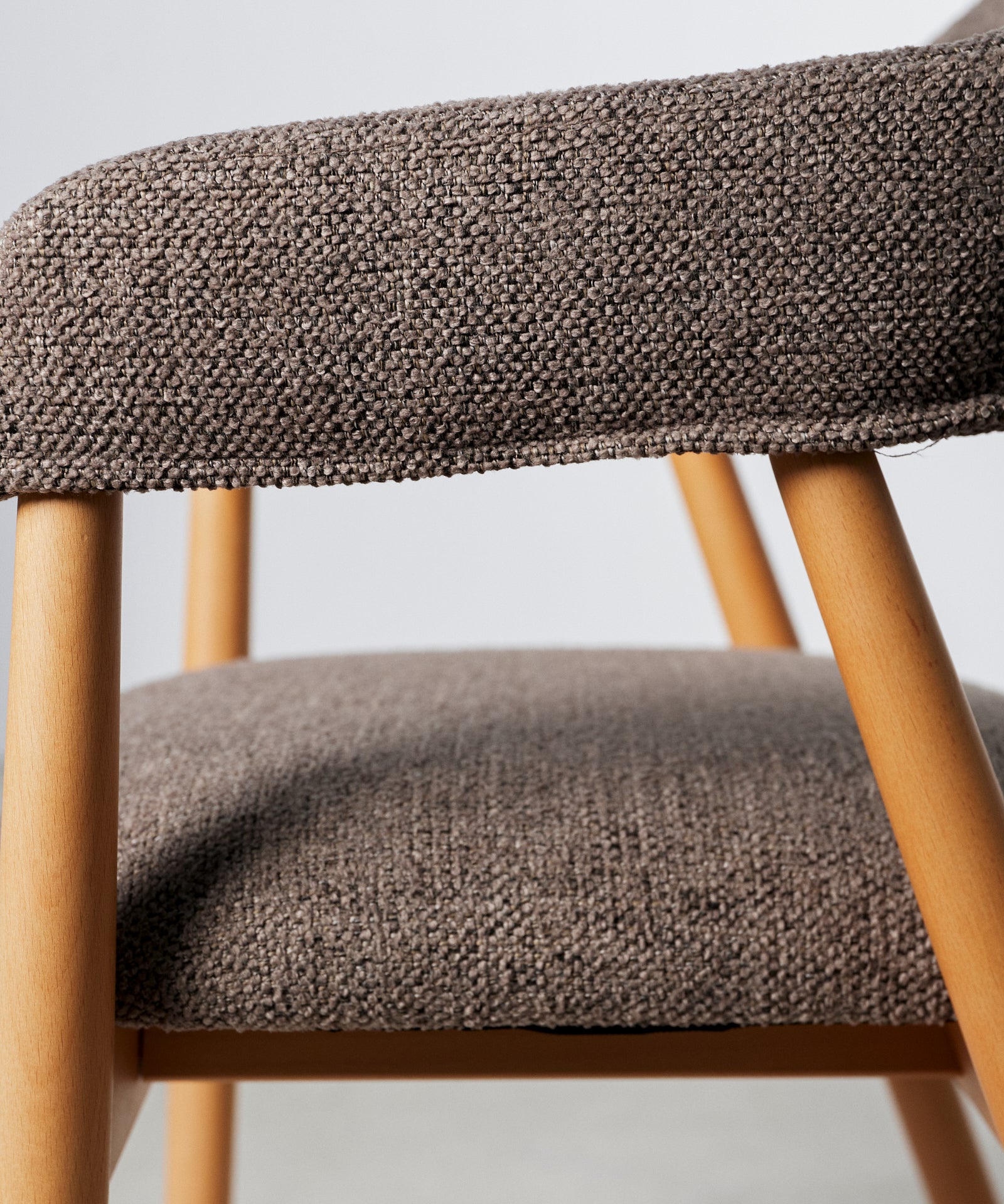È composta da uno schienale curvato e rivestito in tessuto morbido che offre comfort e stile. La sua struttura in legno massello di faggio è caratterizzata da linee pulite e robuste.