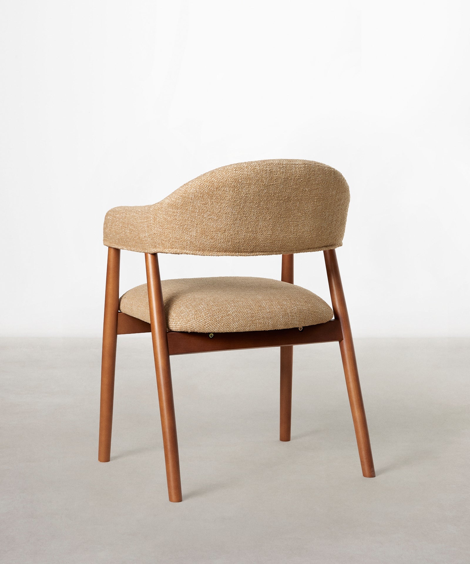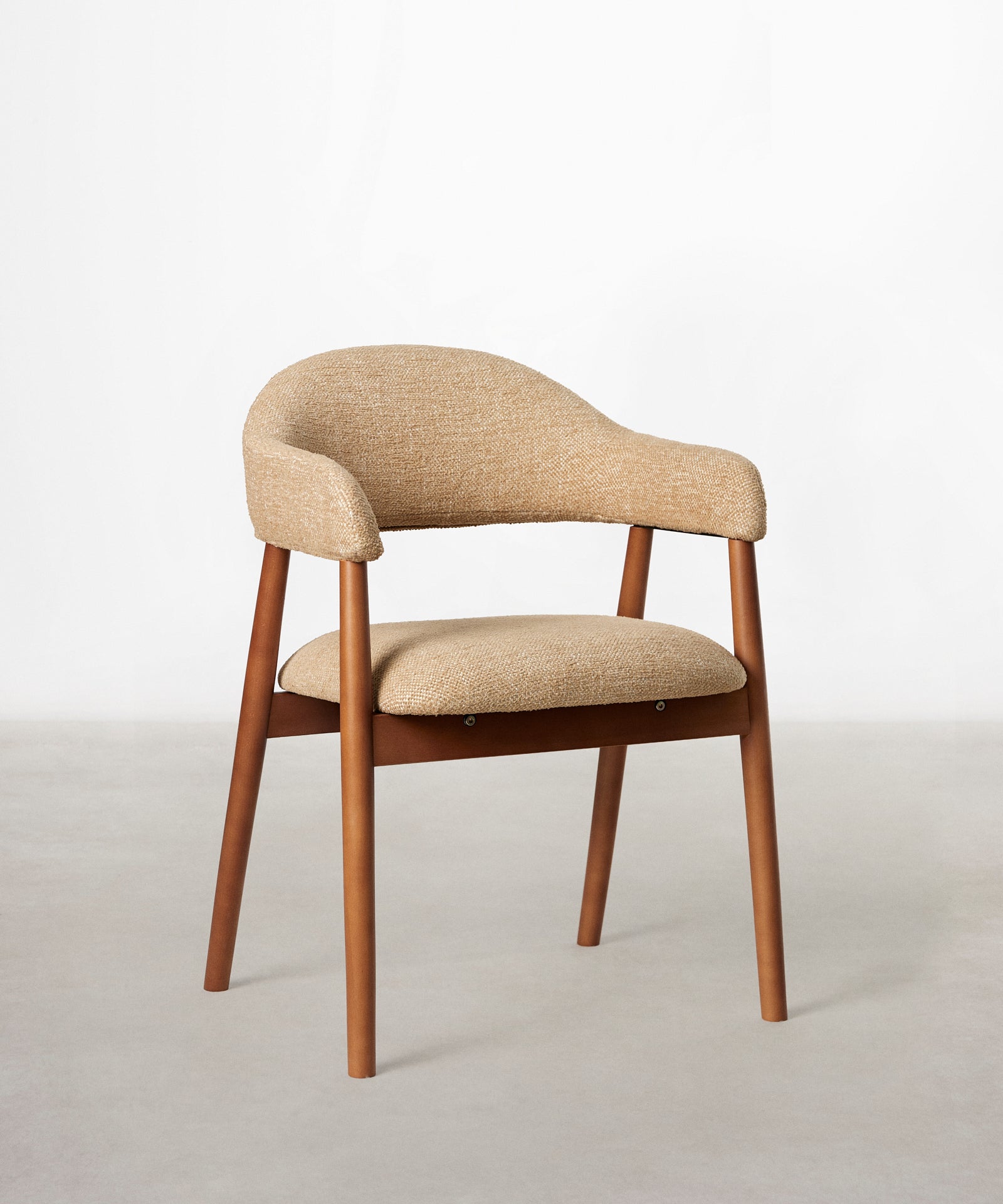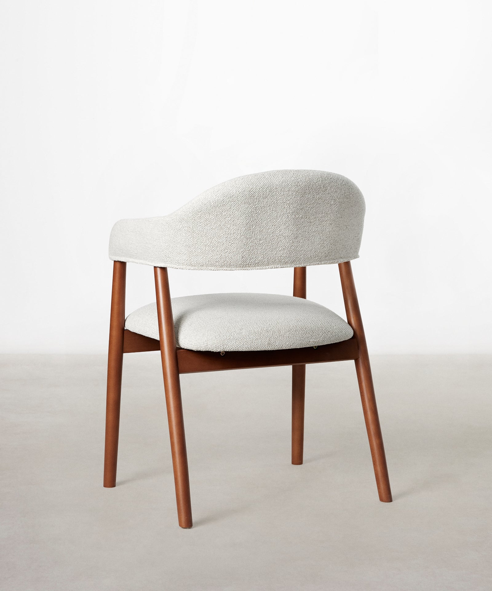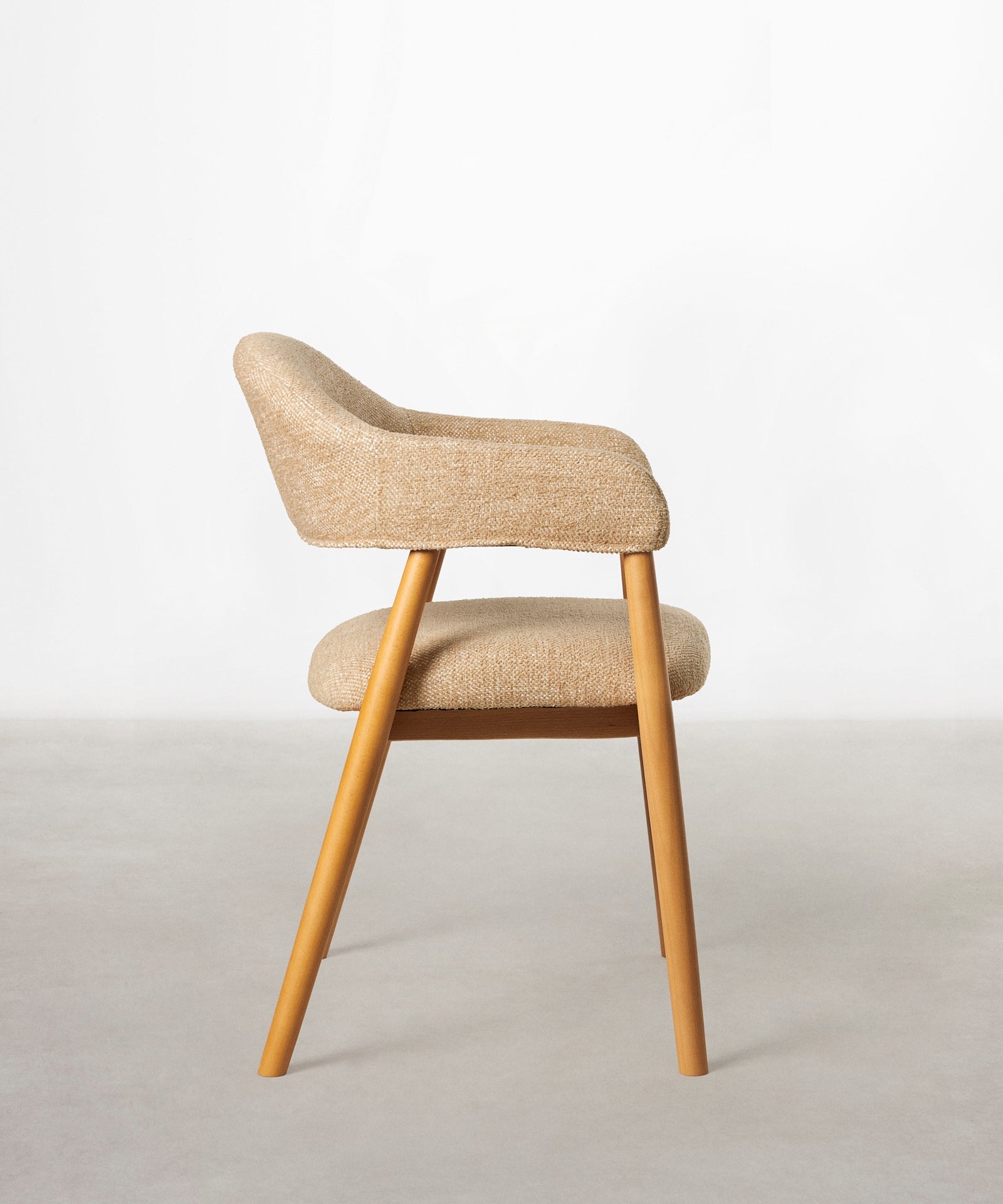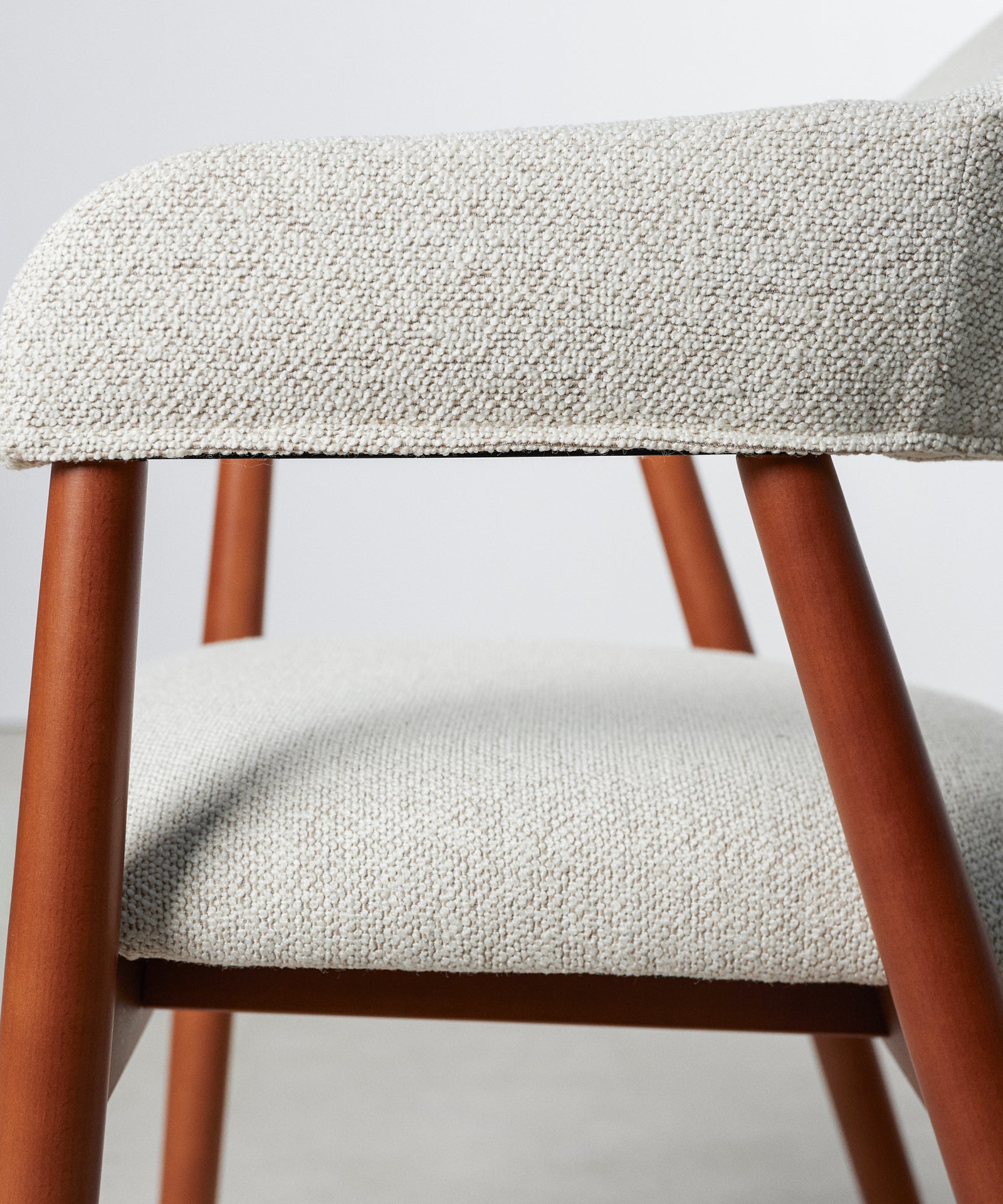 È composta da uno schienale curvato e rivestito in tessuto morbido che offre comfort e stile. La sua struttura in legno massello di faggio è caratterizzata da linee pulite e robuste.