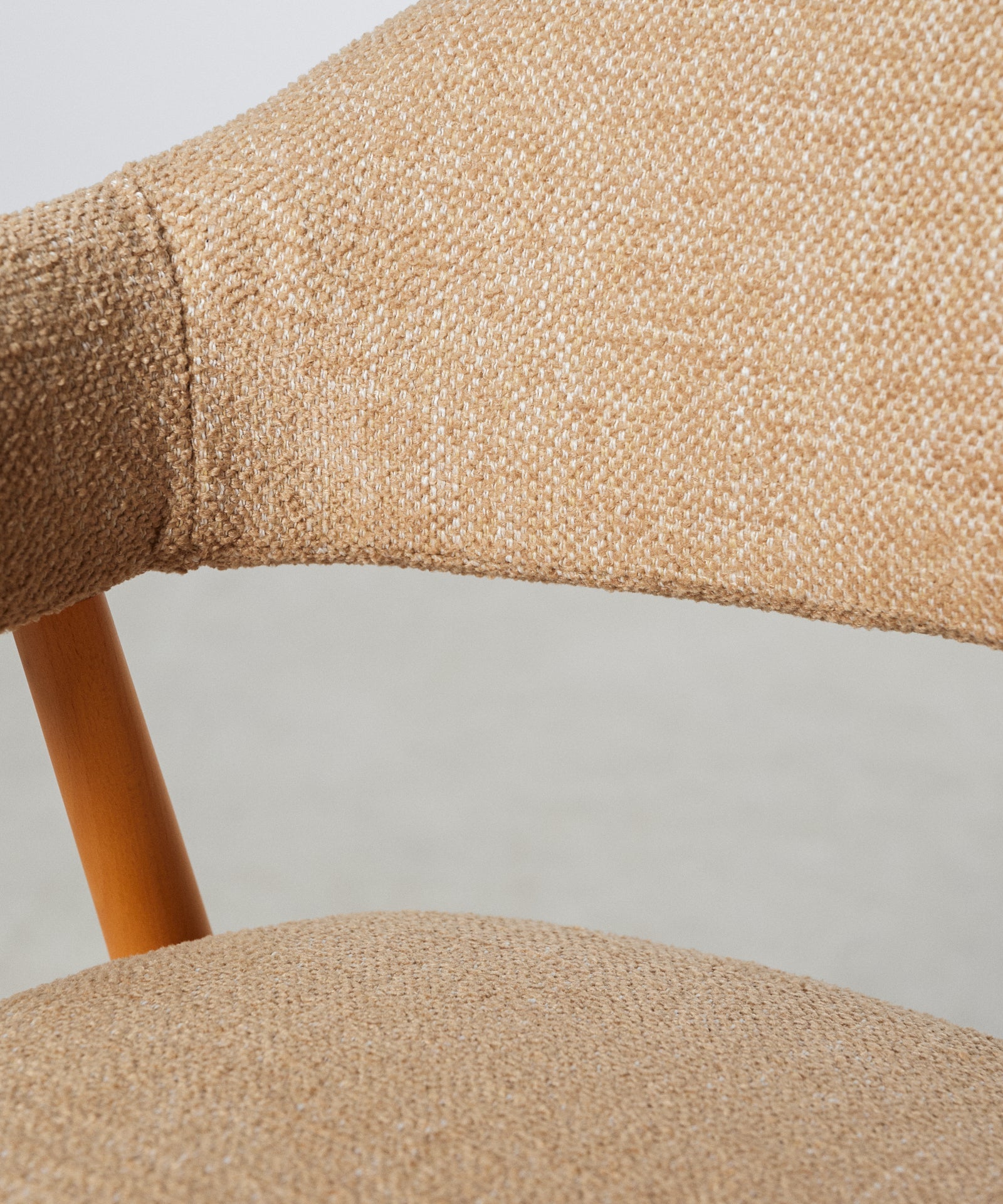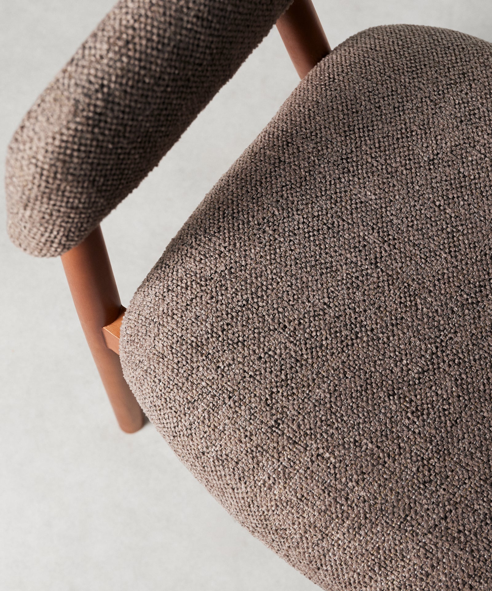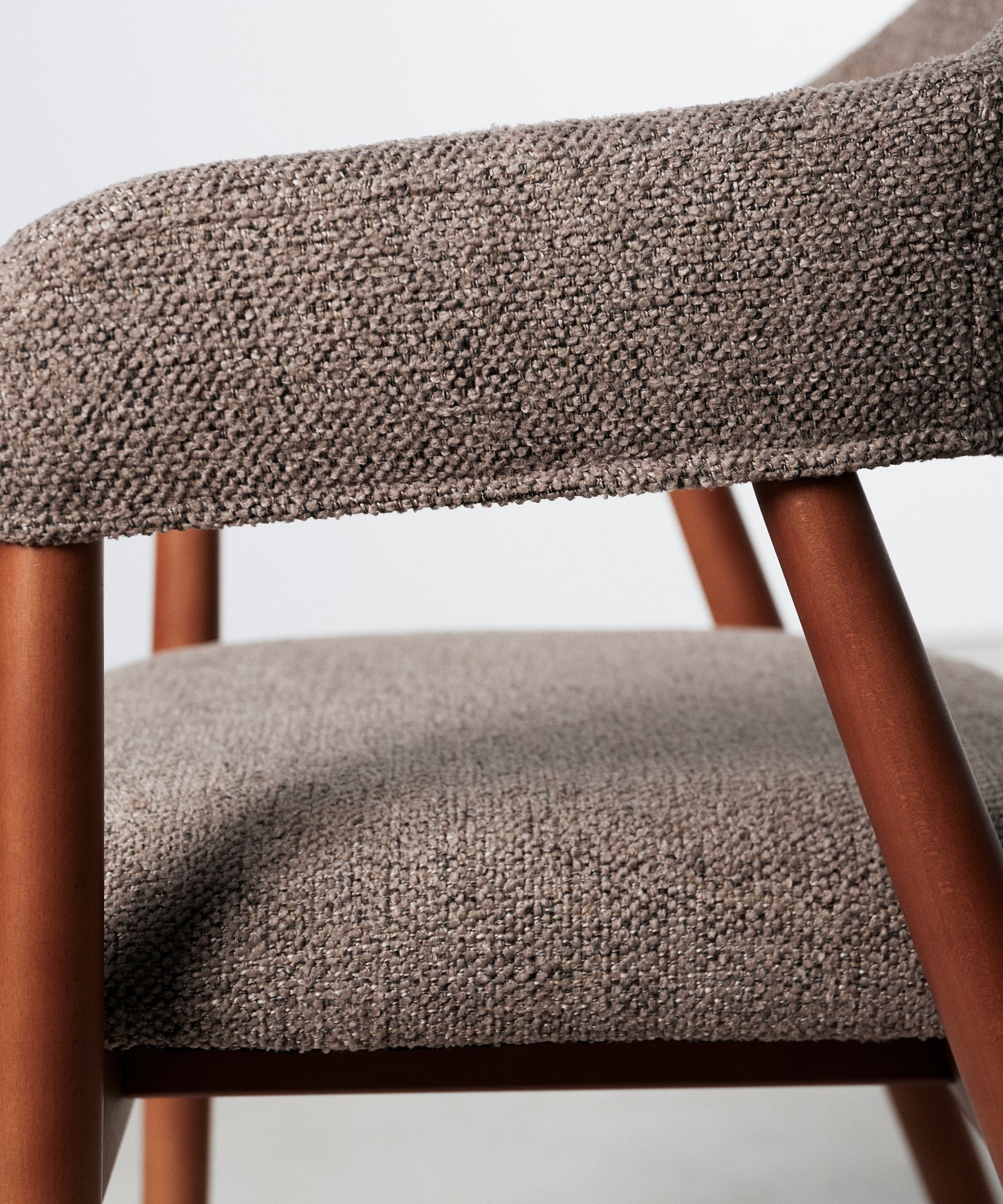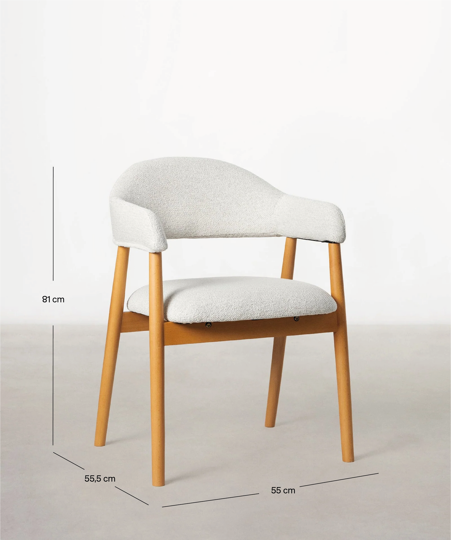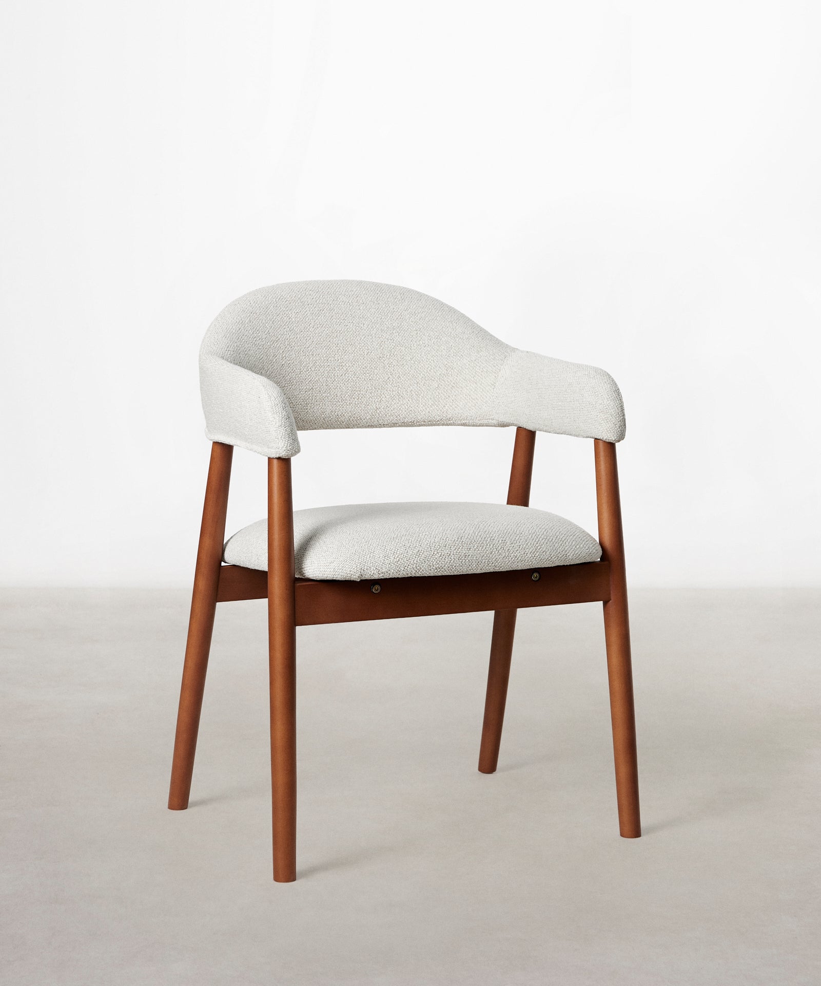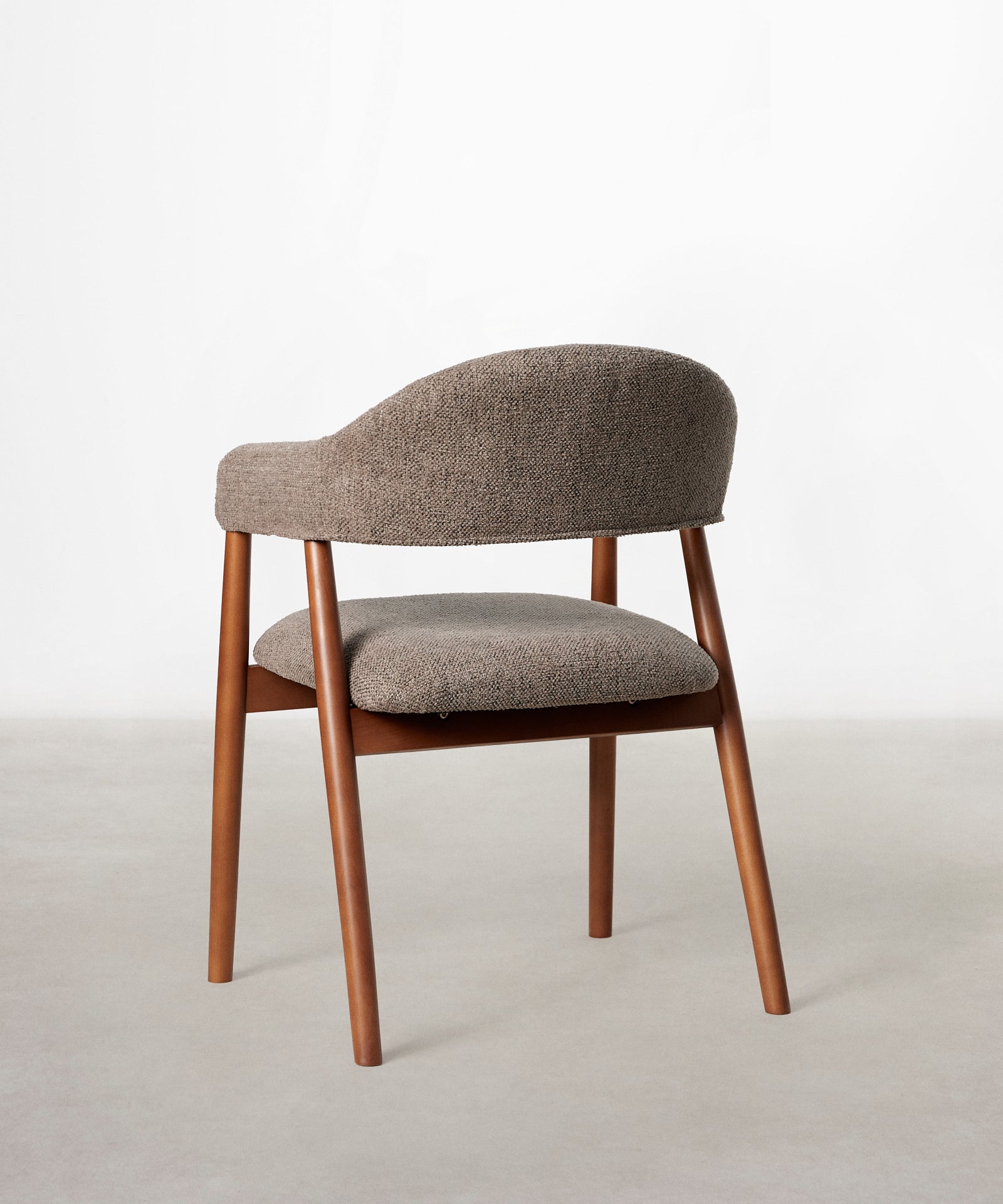 È composta da uno schienale curvato e rivestito in tessuto morbido che offre comfort e stile. La sua struttura in legno massello di faggio è caratterizzata da linee pulite e robuste.