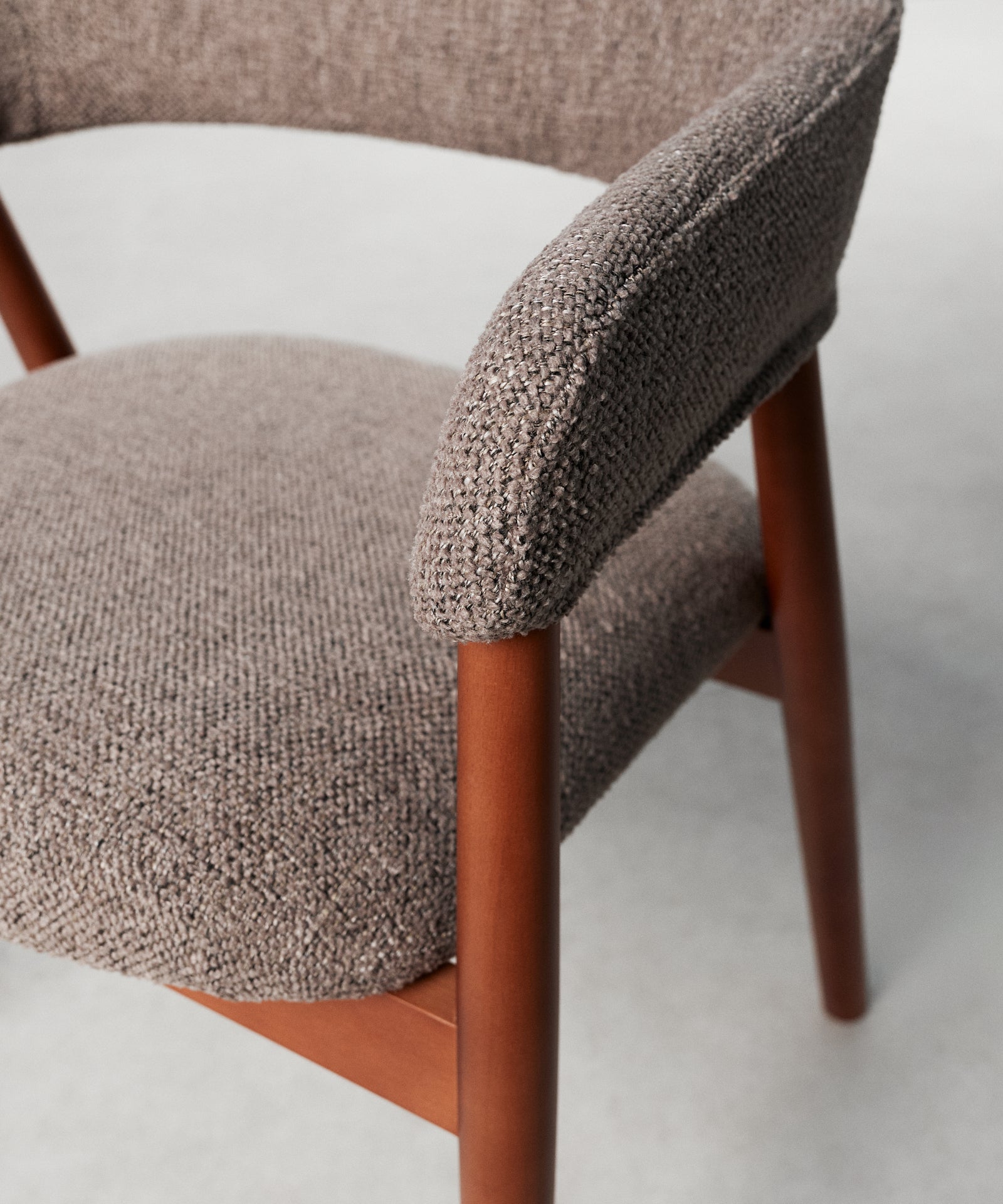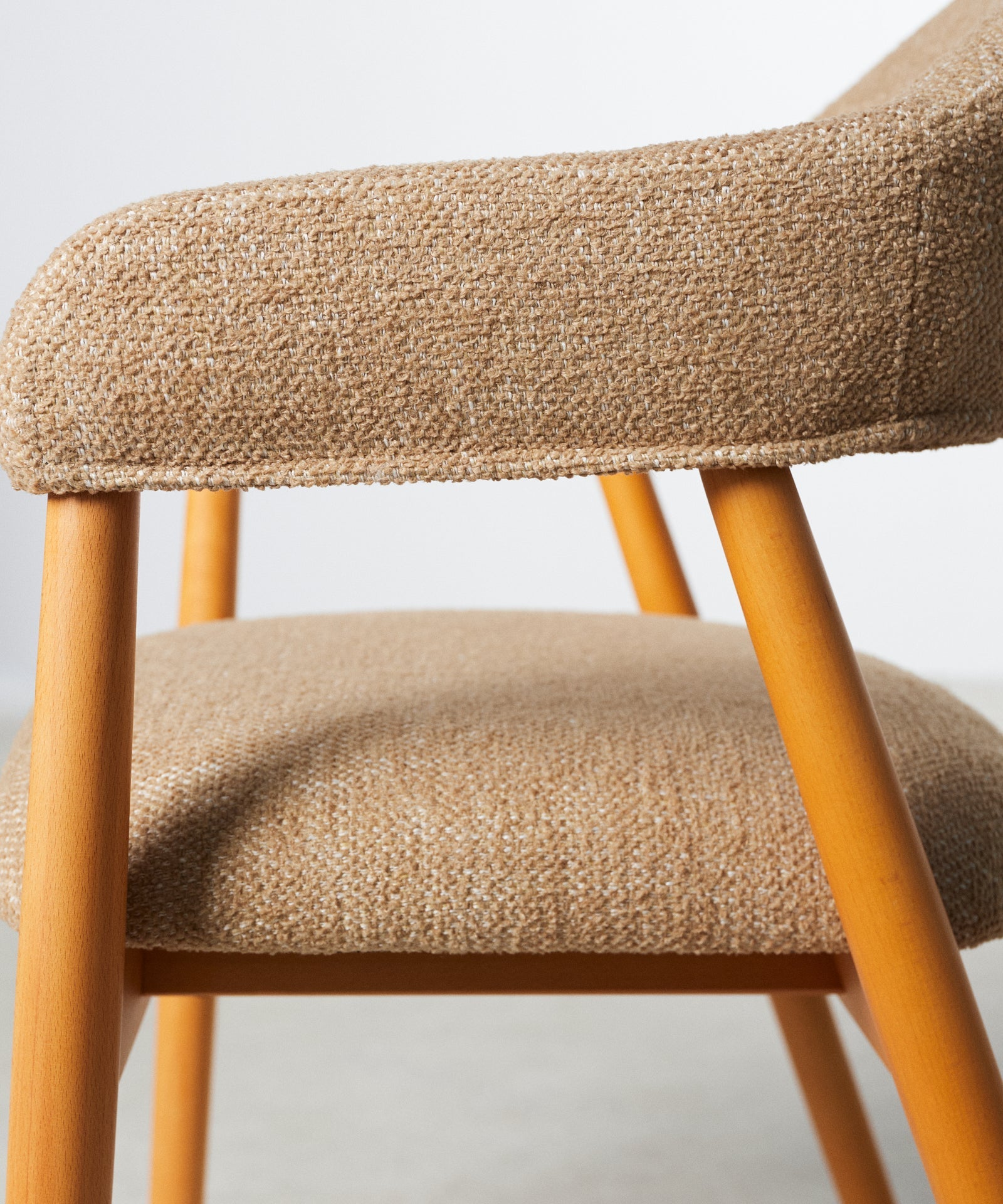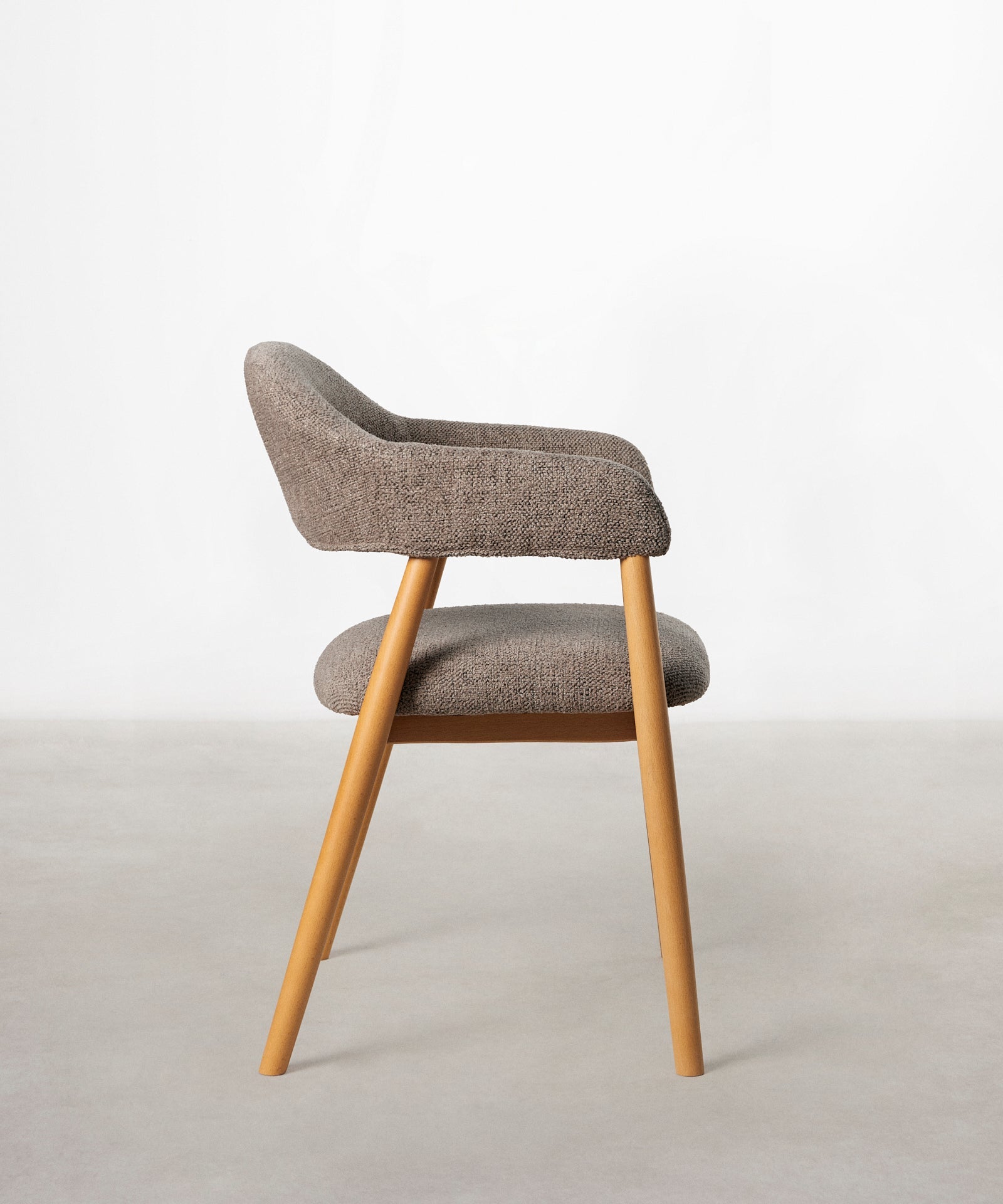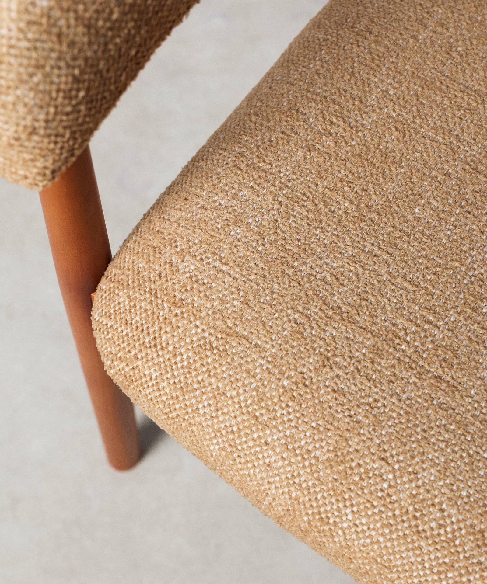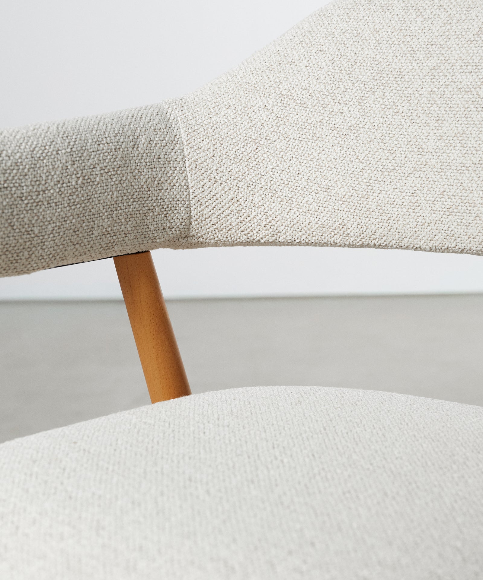 È composta da uno schienale curvato e rivestito in tessuto morbido che offre comfort e stile. La sua struttura in legno massello di faggio è caratterizzata da linee pulite e robuste.