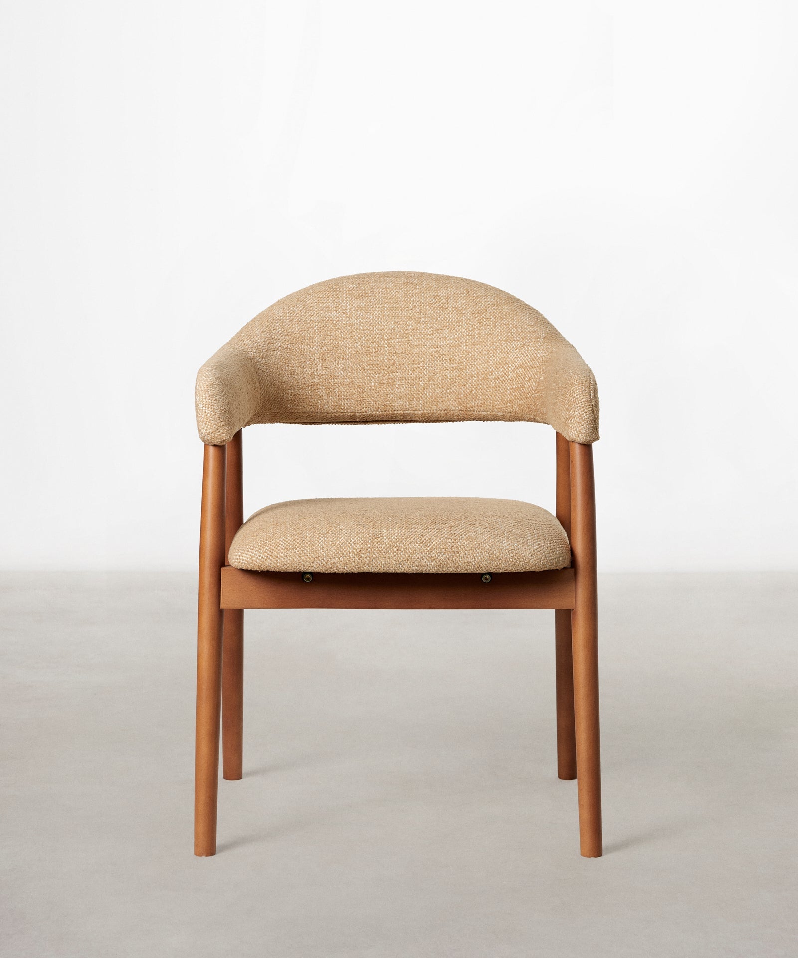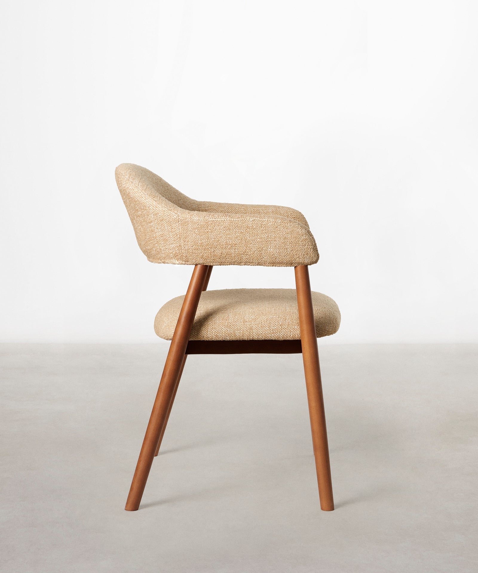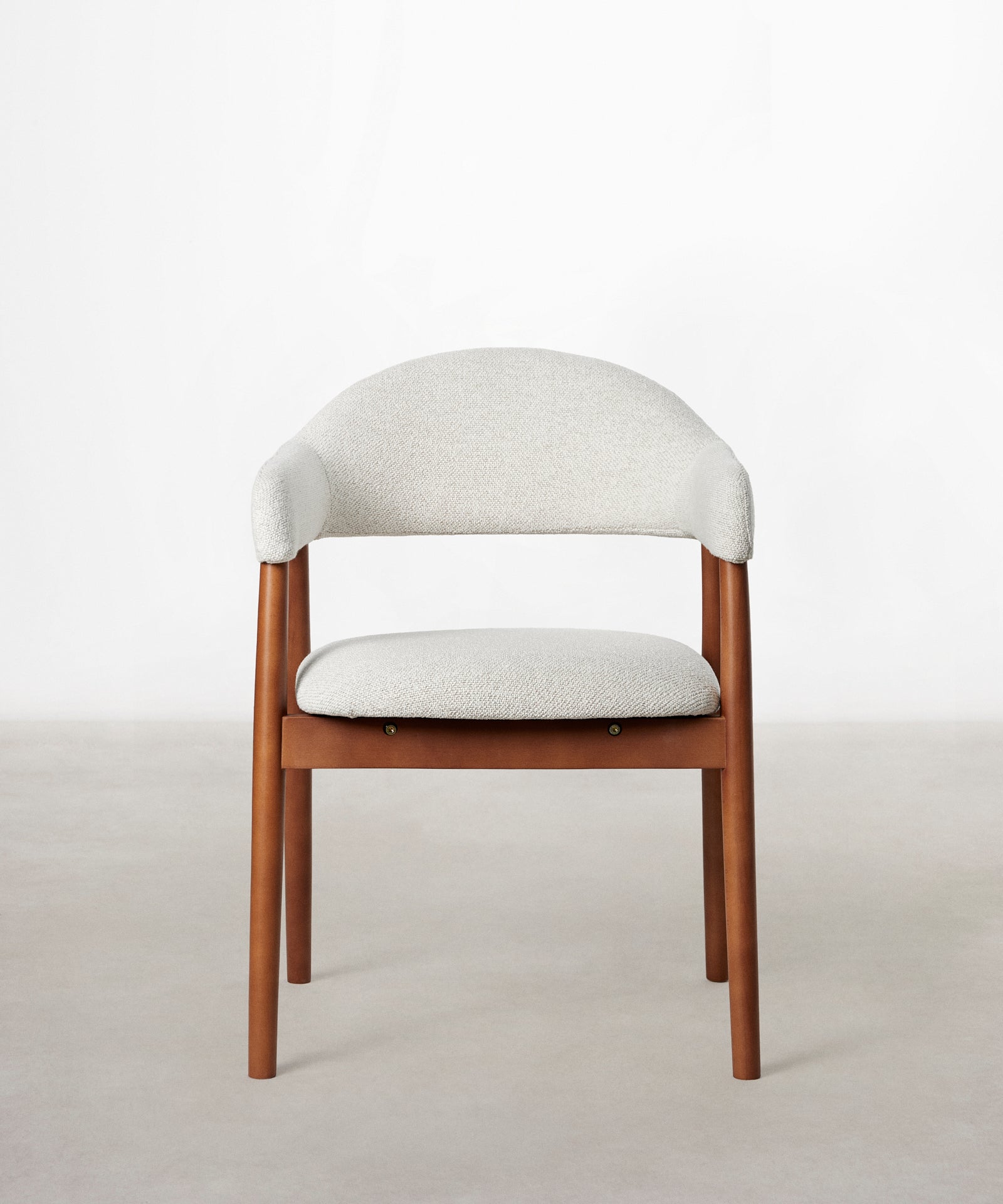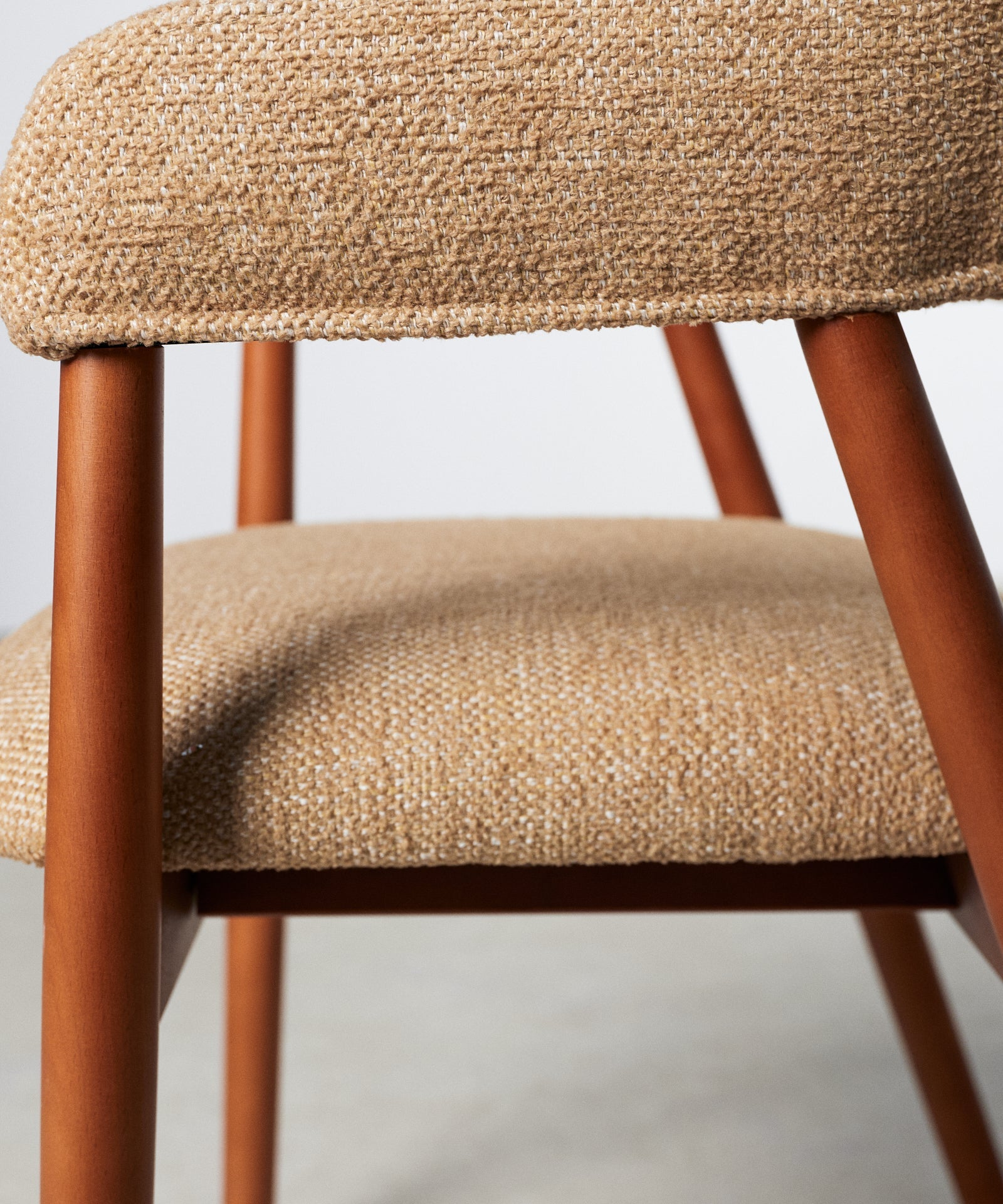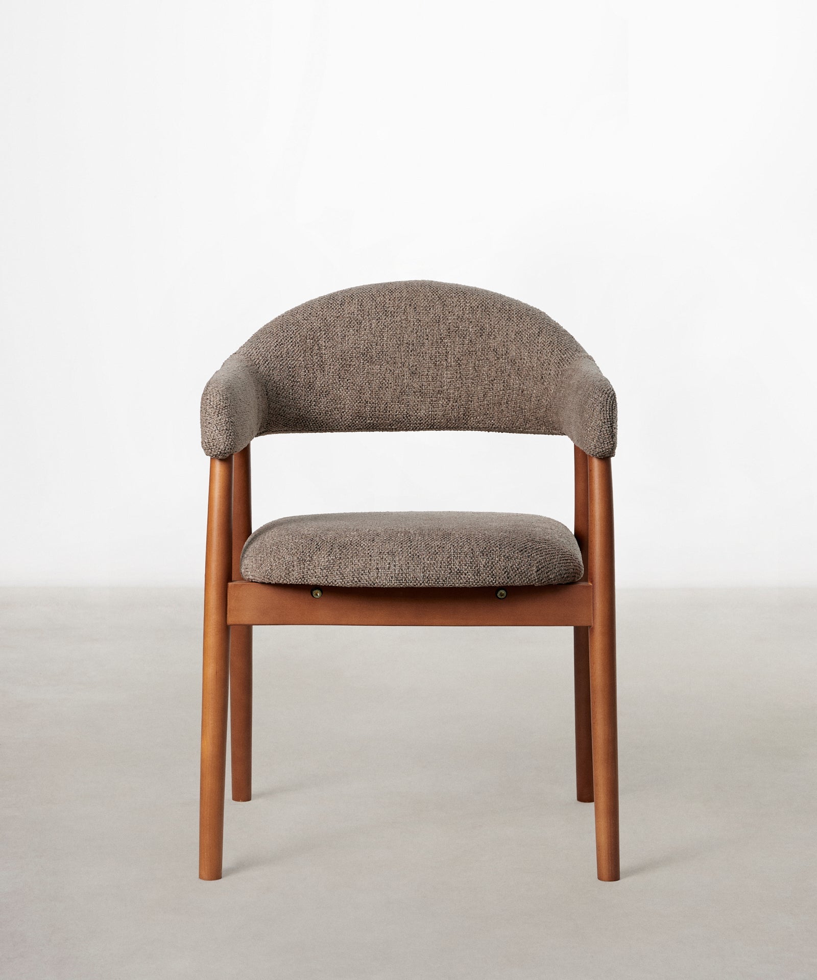 È composta da uno schienale curvato e rivestito in tessuto morbido che offre comfort e stile. La sua struttura in legno massello di faggio è caratterizzata da linee pulite e robuste.