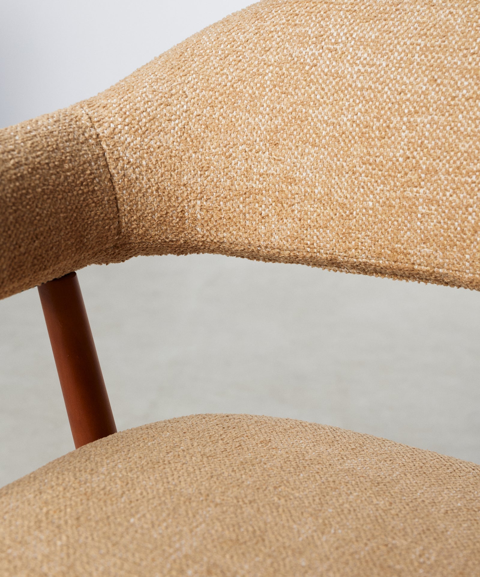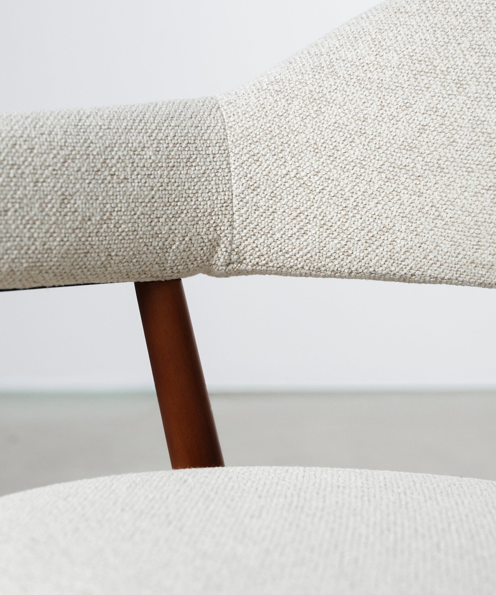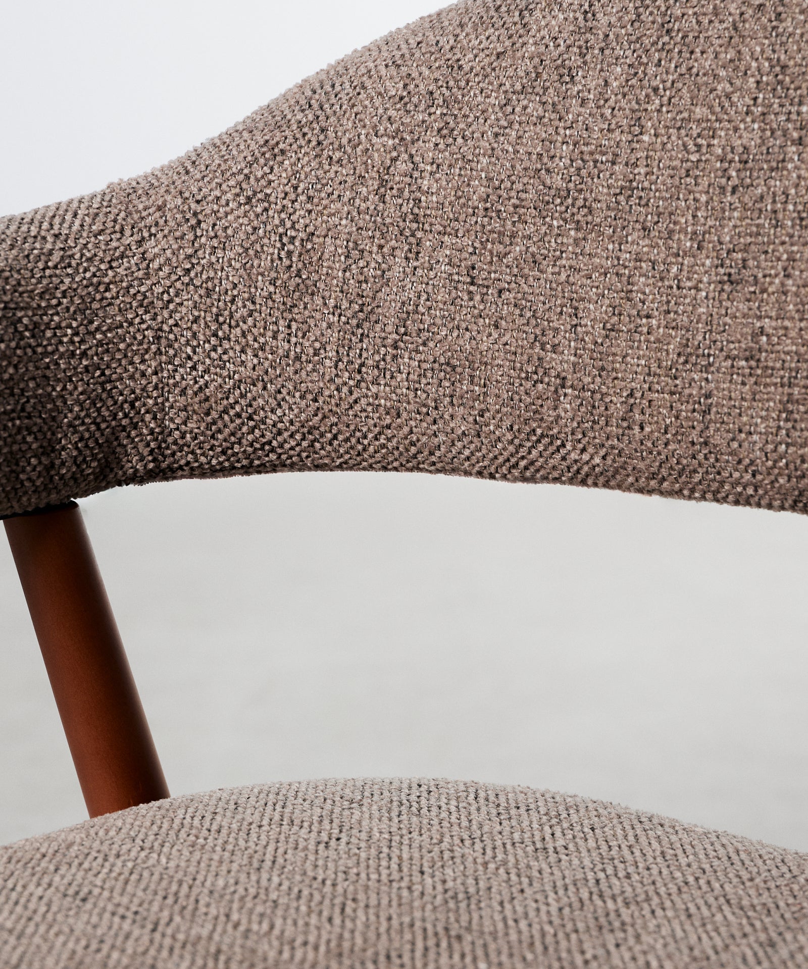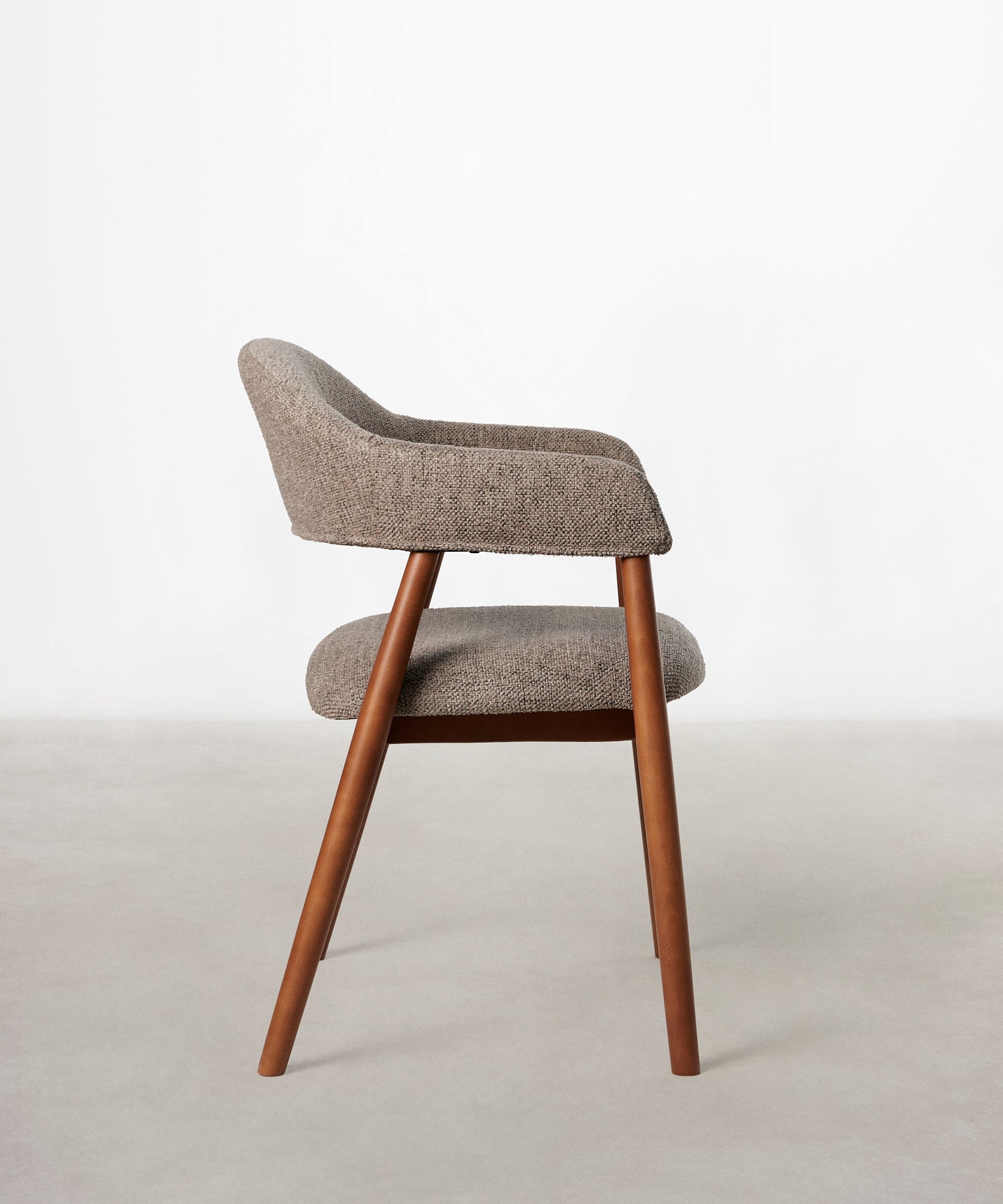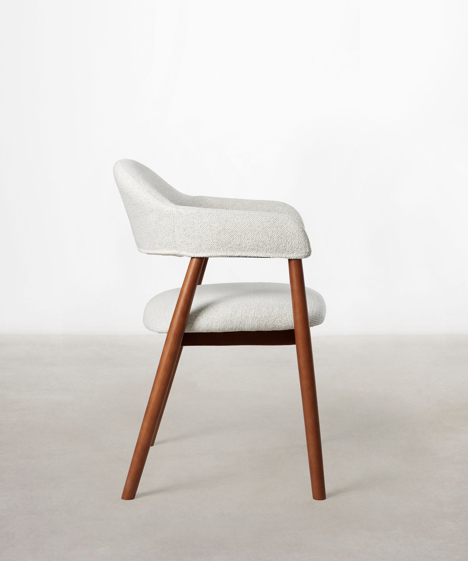 È composta da uno schienale curvato e rivestito in tessuto morbido che offre comfort e stile. La sua struttura in legno massello di faggio è caratterizzata da linee pulite e robuste.