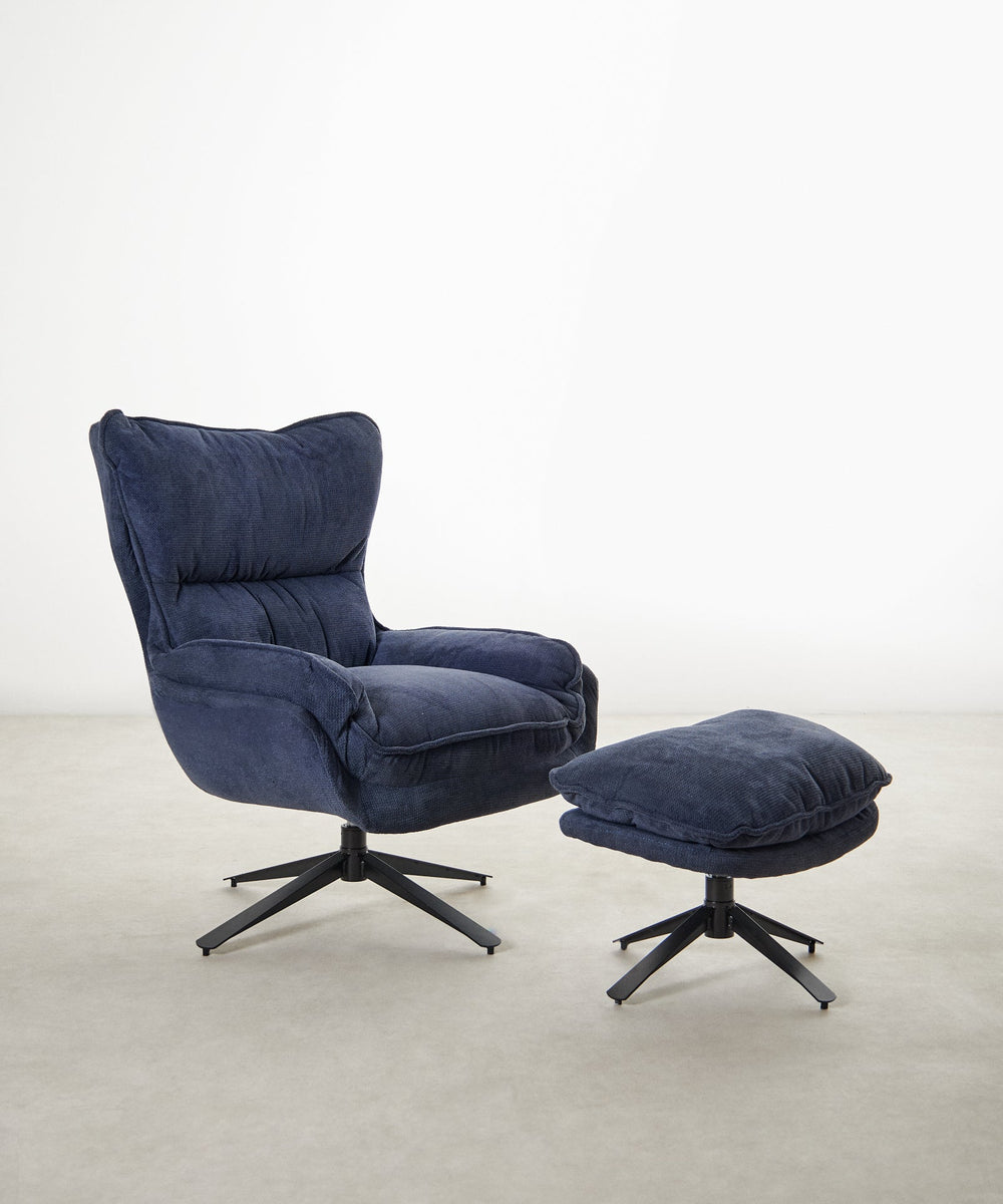 È disponibile in due tonalità versatili: blu profondo e beige chiaro, entrambe rivestite in un morbido tessuto tipo velluto a coste che aggiunge calore e texture all’ambiente. Include un poggiapiedi coordinato, che ne aumenta ulteriormente il comfort e la praticità.
