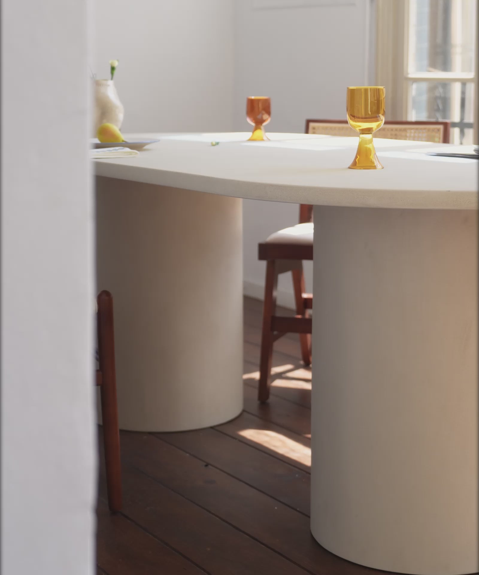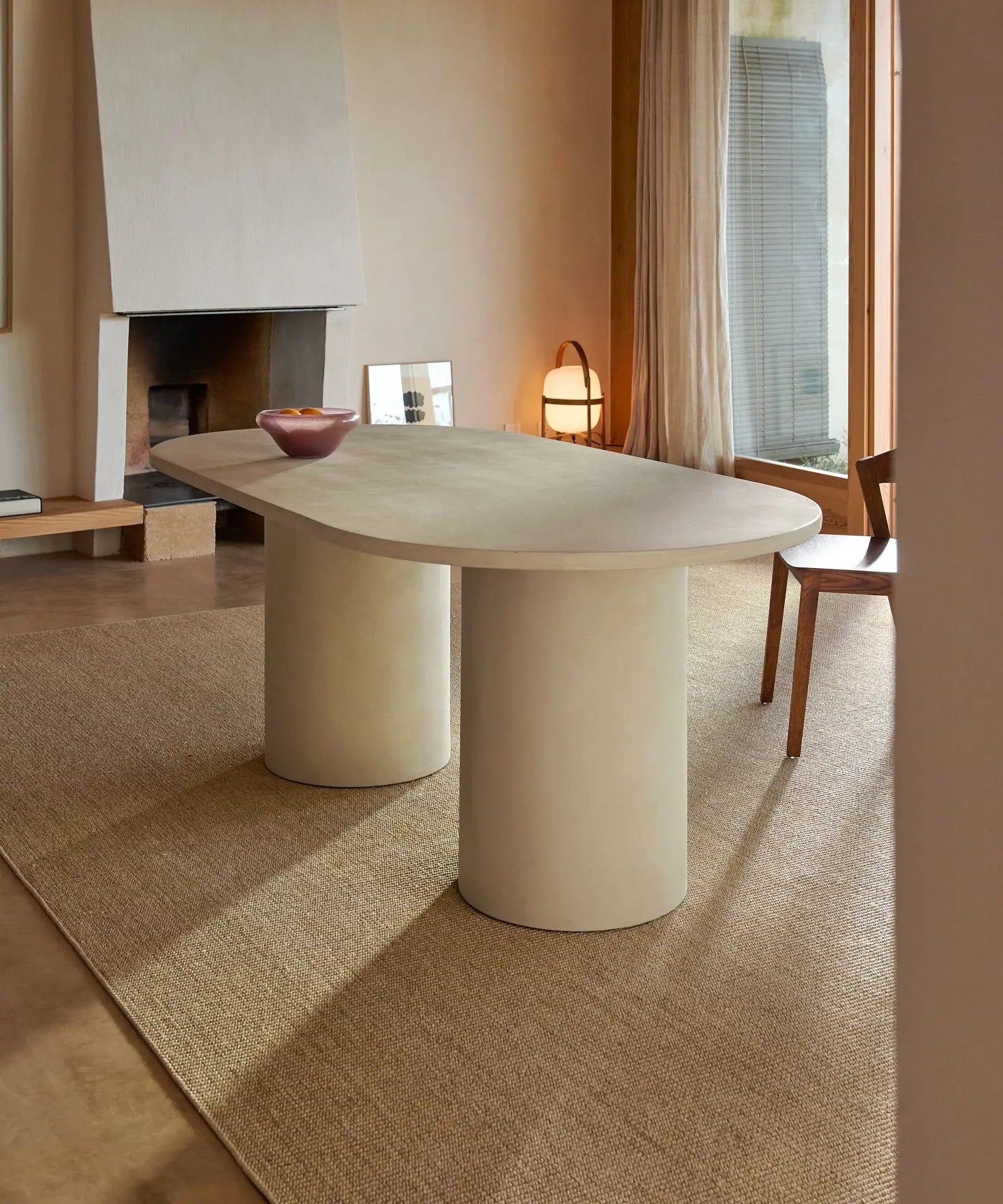 De ovale eettafel Juno onderscheidt zich door haar minimalistische en elegante ontwerp. Ze bestaat uit een ovaalvormig blad dat rust op twee robuuste cilindrische onderstellen. De gebroken witte afwerking zorgt voor lichtheid en een eigentijdse stijl die gemakkelijk te combineren is met elk type inrichting.