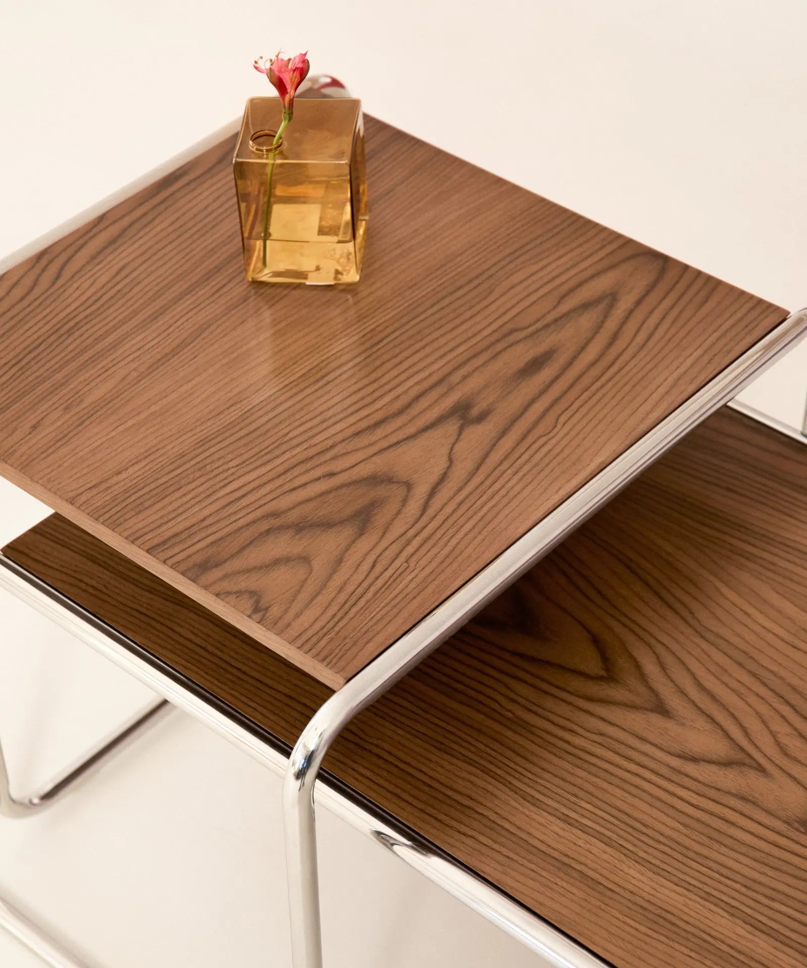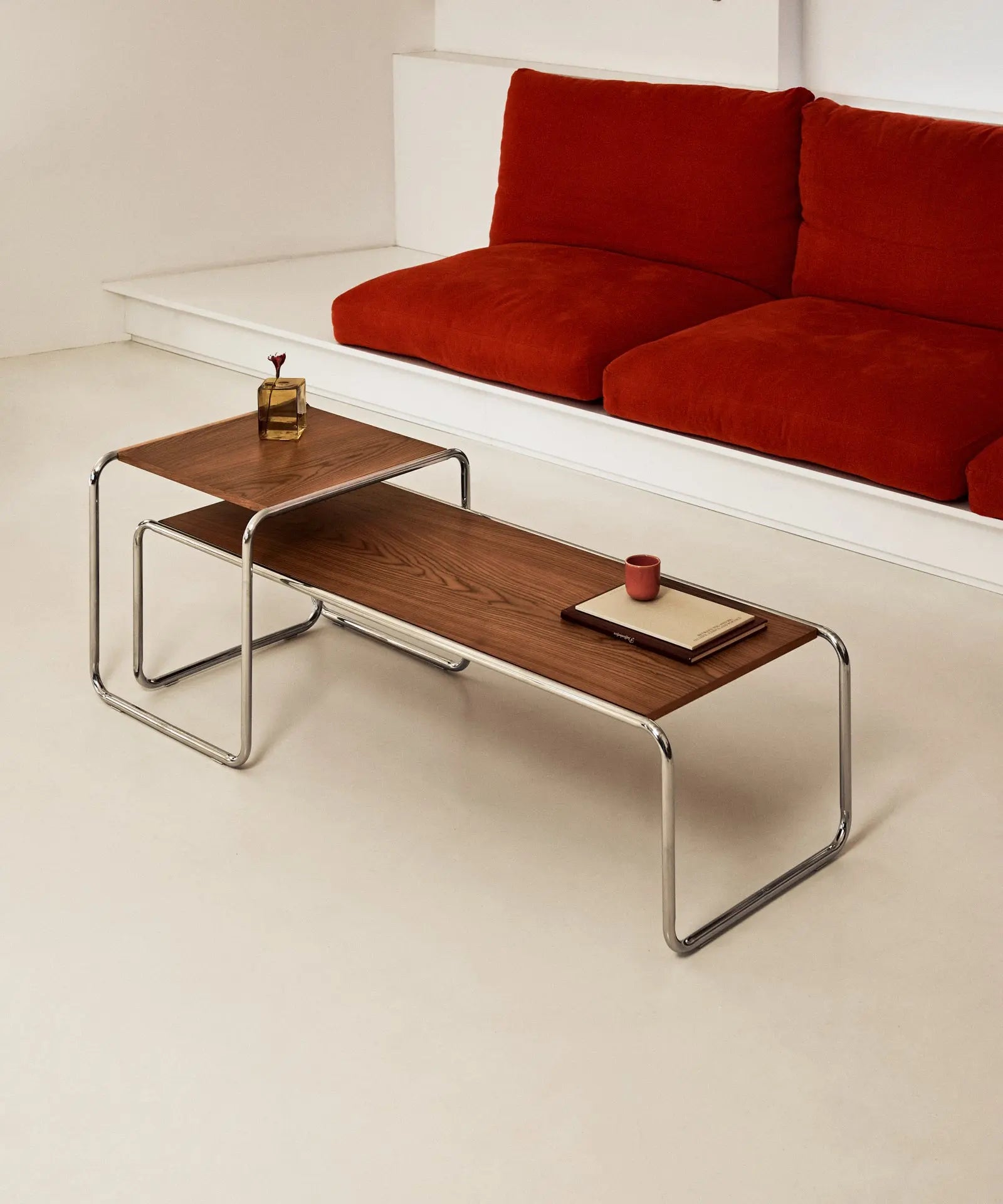 Stół Kawowy Santorini składa się z dwóch nałożonych na siebie, pasujących elementów: jednego kwadratowego i drugiego prostokątnego. Jest wykonany ze struktury z rurek stalowych chromowanych z drewnianym blatem.