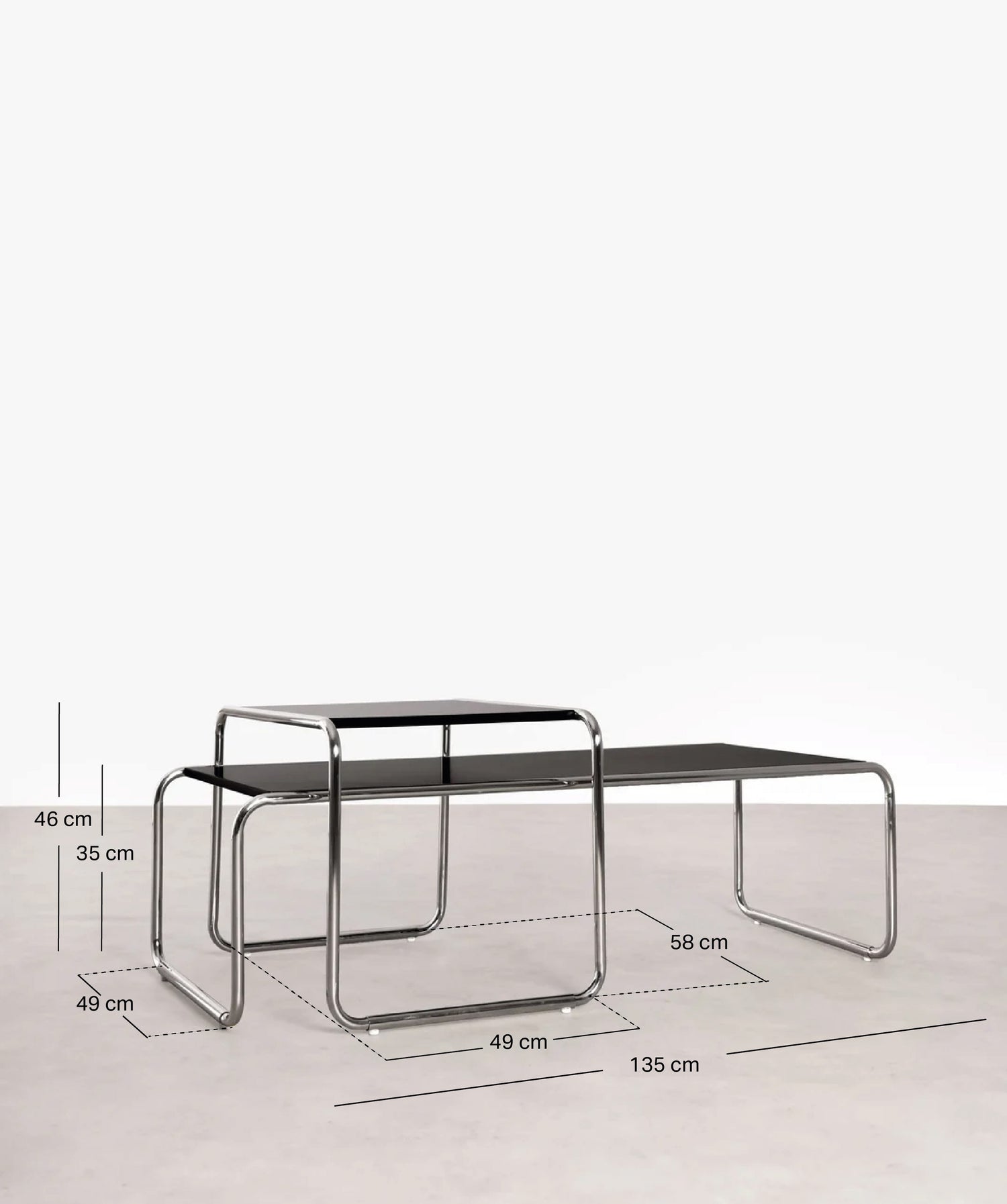 La Mesa de Centro Santorini está compuesta por dos piezas superpuestas a juego, una cuadrada y otro rectangular. Está fabricada con una estructura de acero tubular cromada con una parte superior de madera.