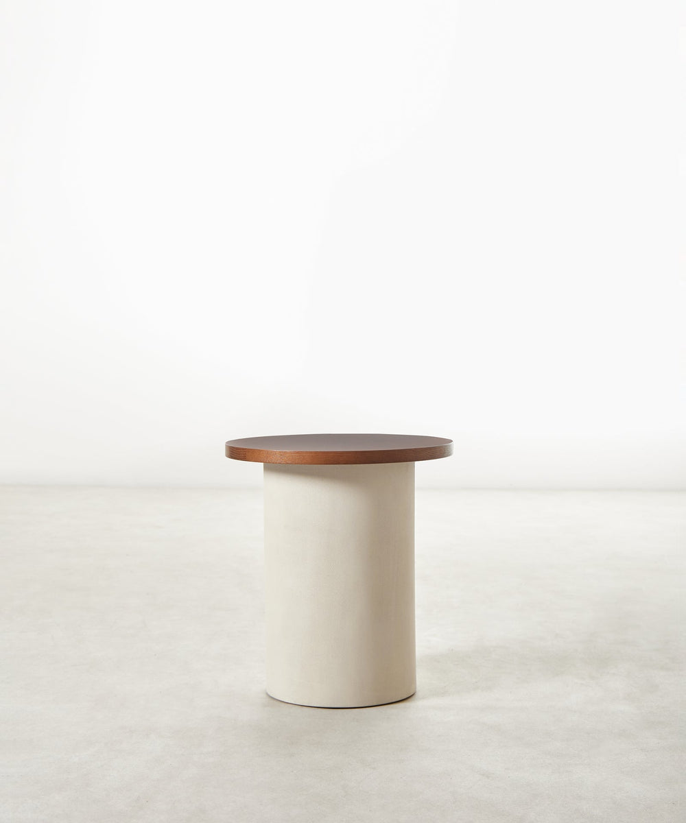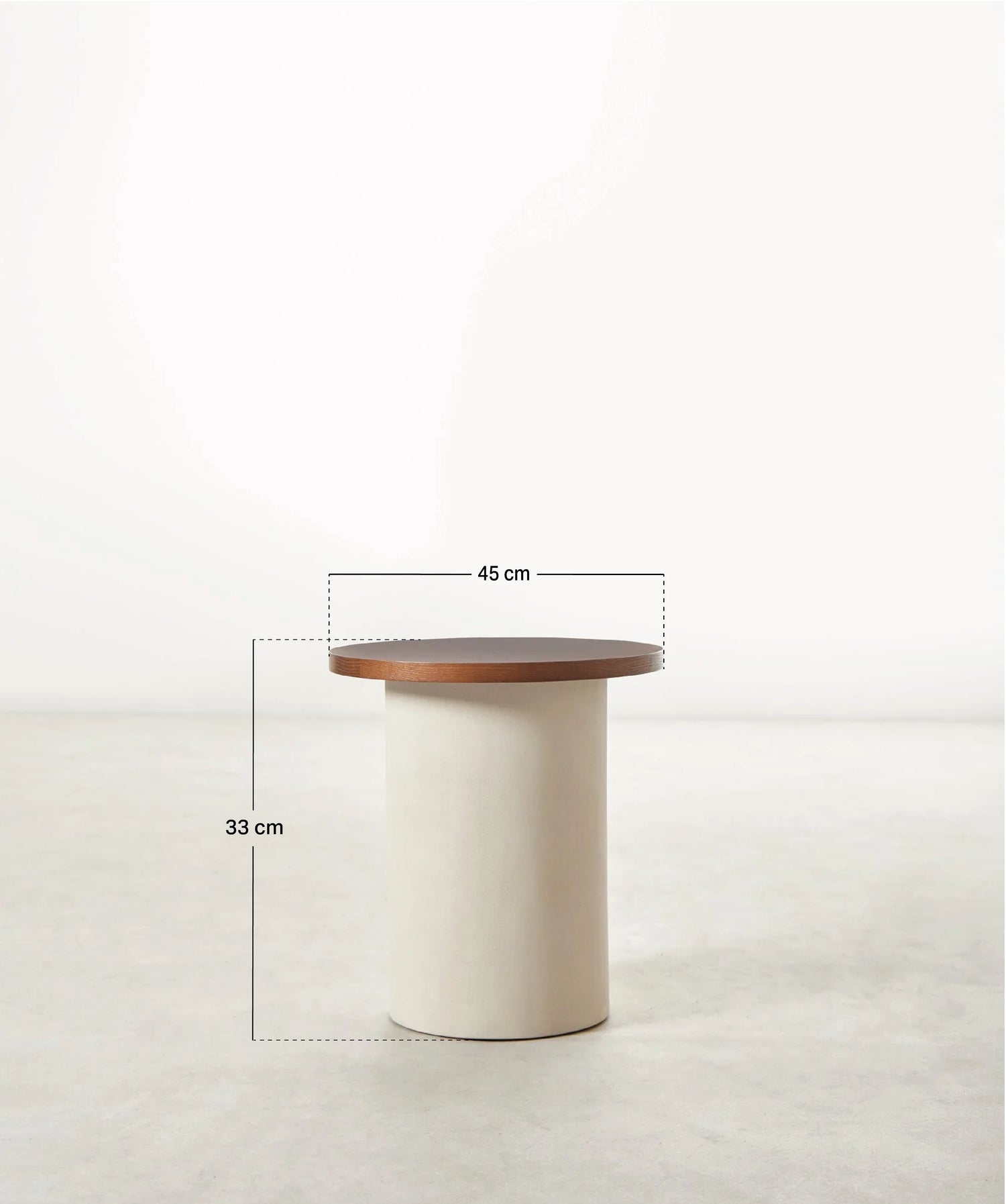 La mesa Sansa combina diseño moderno con un toque cálido y natural. Su estructura se compone de una base cilíndrica de microcemento en color blanco roto y una superficie redonda de madera oscura, creando un bonito contraste que aporta personalidad sin recargar el ambiente.