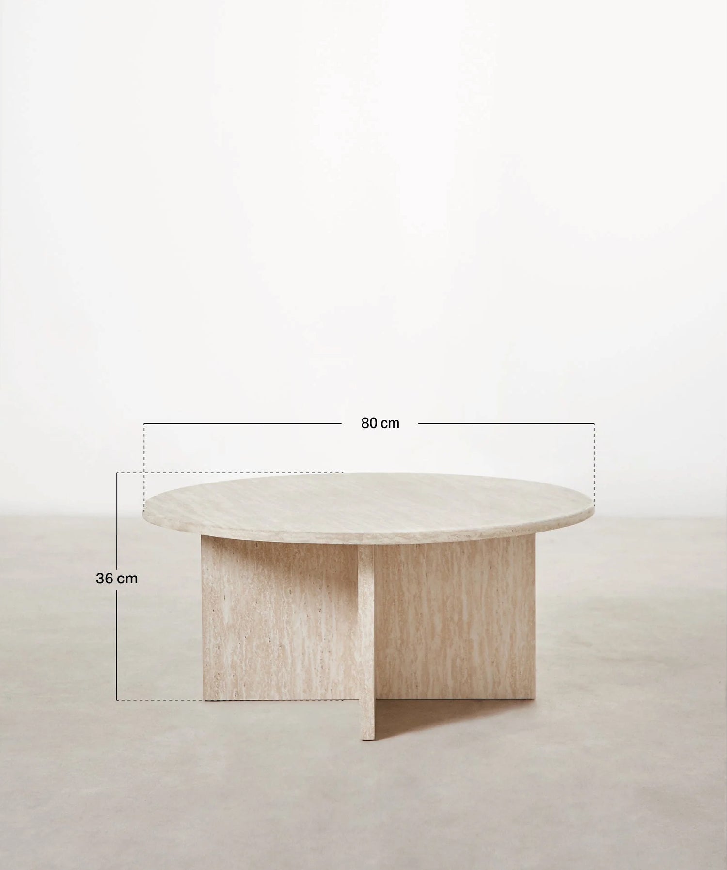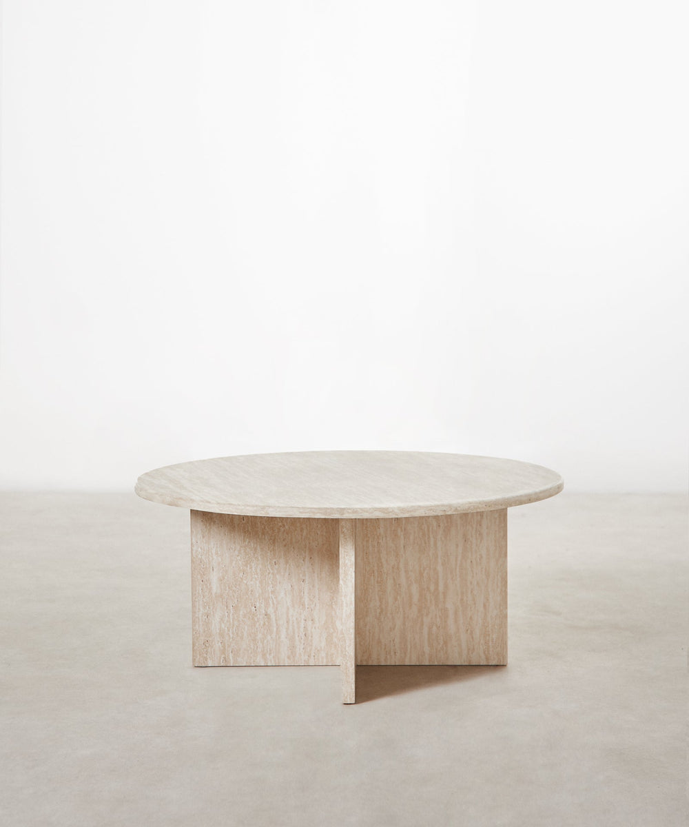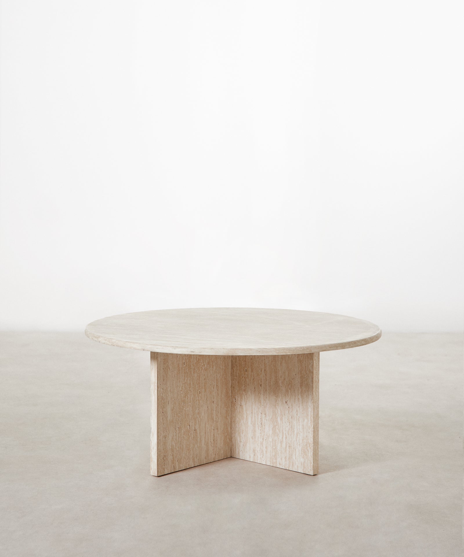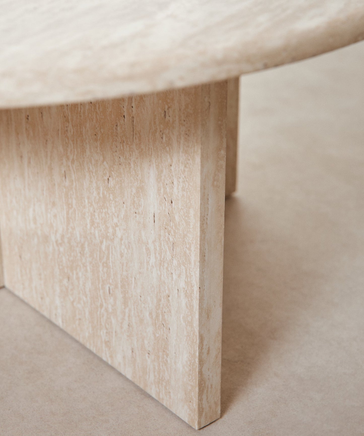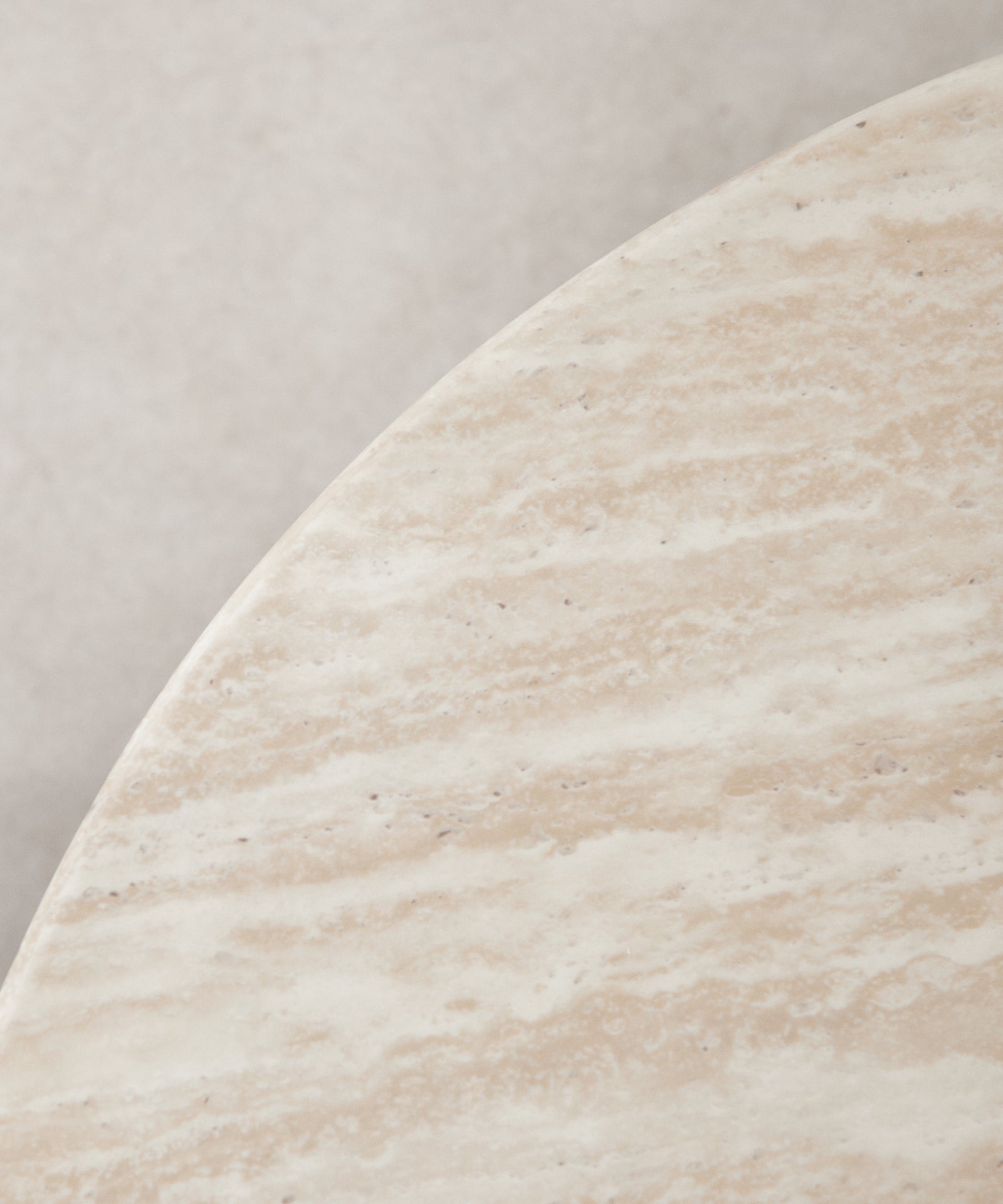 La mesa de centro Lino destaca por su estética serena y natural, inspirada en la piedra travertino. Su diseño de líneas redondeadas y base en cruz transmite equilibrio visual y aporta calidez a cualquier espacio.